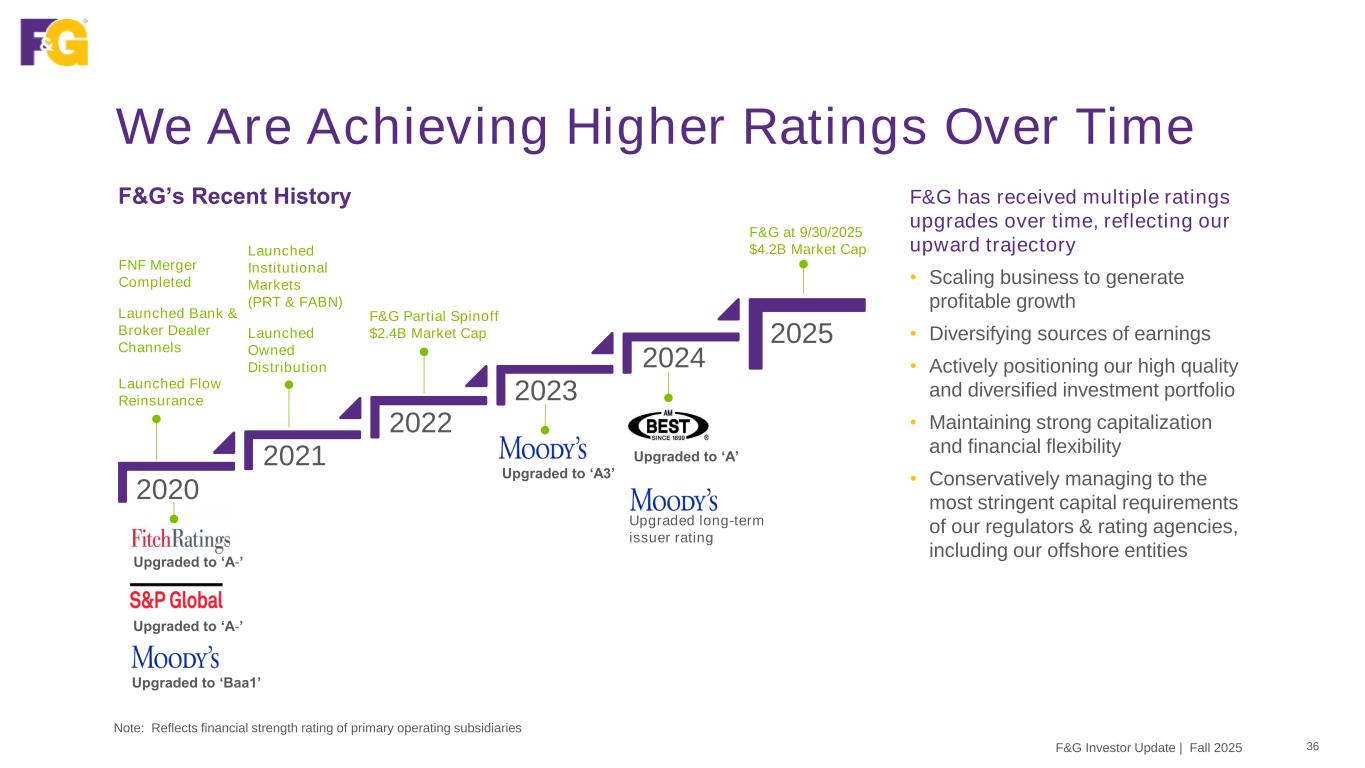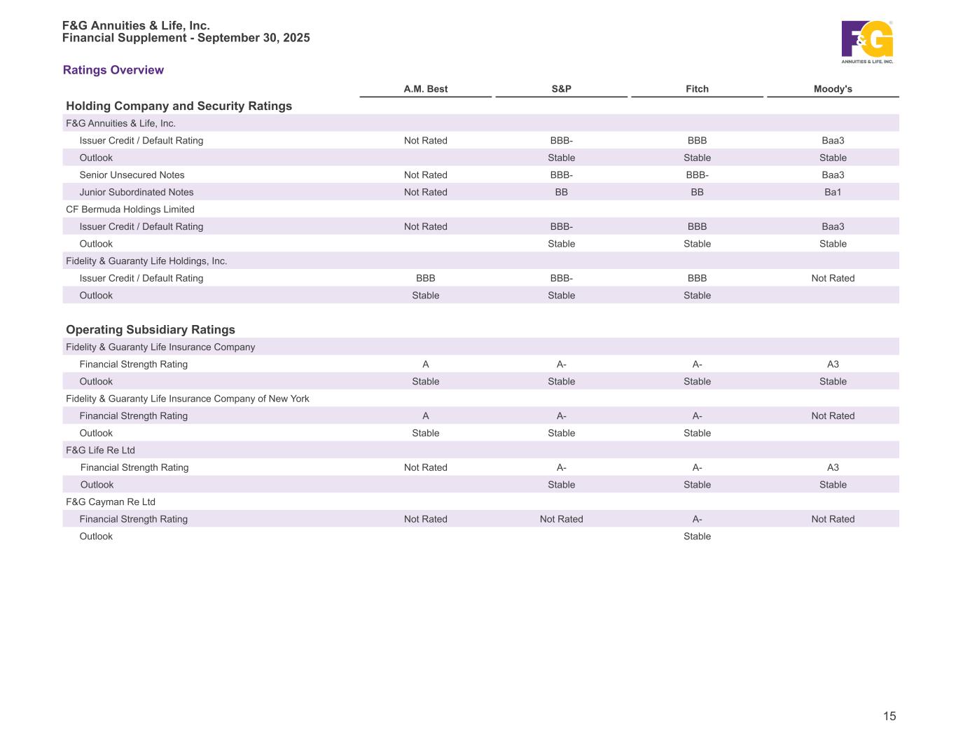 Ratings Overview A.M. Best S&P Fitch Moody's Holding Company and Security Ratings F&G Annuities & Life, Inc. Issuer Credit / Default Rating Not Rated BBB- BBB Baa3 Outlook Stable Stable Stable Senior Unsecured Notes Not Rated BBB- BBB- Baa3 Junior Subordinated Notes Not Rated BB BB Ba1 CF Bermuda Holdings Limited Issuer Credit / Default Rating Not Rated BBB- BBB Baa3 Outlook Stable Stable Stable Fidelity & Guaranty Life Holdings, Inc. Issuer Credit / Default Rating BBB BBB- BBB Not Rated Outlook Stable Stable Stable Operating Subsidiary Ratings Fidelity & Guaranty Life Insurance Company Financial Strength Rating A A- A- A3 Outlook Stable Stable Stable Stable Fidelity & Guaranty Life Insurance Company of New York Financial Strength Rating A A- A- Not Rated Outlook Stable Stable Stable F&G Life Re Ltd Financial Strength Rating Not Rated A- A- A3 Outlook Stable Stable Stable F&G Cayman Re Ltd Financial Strength Rating Not Rated Not Rated A- Not Rated Outlook Stable F&G Annuities & Life, Inc. Financial Supplement - September 30, 2025 15