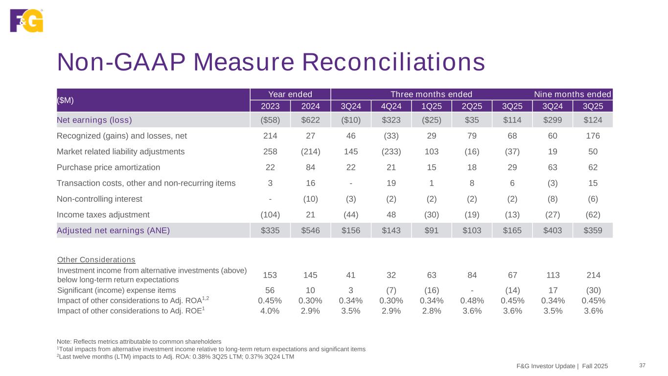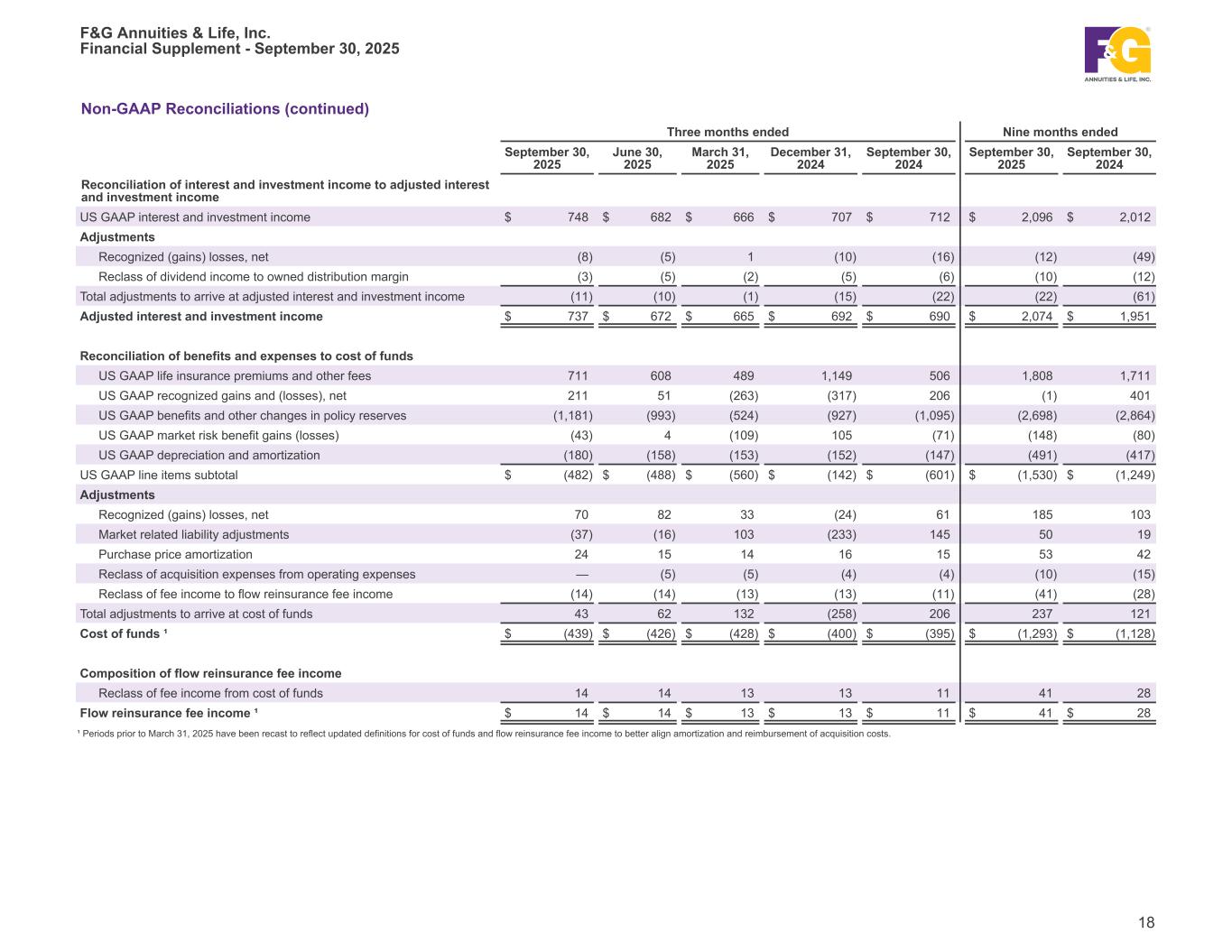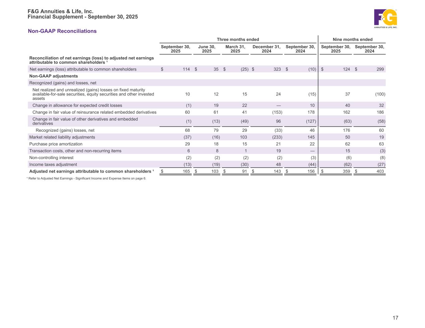 Non-GAAP Reconciliations Three months ended Nine months ended September 30, 2025 June 30, 2025 March 31, 2025 December 31, 2024 September 30, 2024 September 30, 2025 September 30, 2024 Reconciliation of net earnings (loss) to adjusted net earnings attributable to common shareholders ¹ Net earnings (loss) attributable to common shareholders $ 114 $ 35 $ (25) $ 323 $ (10) $ 124 $ 299 Non-GAAP adjustments Recognized (gains) and losses, net Net realized and unrealized (gains) losses on fixed maturity available-for-sale securities, equity securities and other invested assets 10 12 15 24 (15) 37 (100) Change in allowance for expected credit losses (1) 19 22 — 10 40 32 Change in fair value of reinsurance related embedded derivatives 60 61 41 (153) 178 162 186 Change in fair value of other derivatives and embedded derivatives (1) (13) (49) 96 (127) (63) (58) Recognized (gains) losses, net 68 79 29 (33) 46 176 60 Market related liability adjustments (37) (16) 103 (233) 145 50 19 Purchase price amortization 29 18 15 21 22 62 63 Transaction costs, other and non-recurring items 6 8 1 19 — 15 (3) Non-controlling interest (2) (2) (2) (2) (3) (6) (8) Income taxes adjustment (13) (19) (30) 48 (44) (62) (27) Adjusted net earnings attributable to common shareholders ¹ $ 165 $ 103 $ 91 $ 143 $ — $ 156 $ 359 $ 403 ¹ Refer to Adjusted Net Earnings - Significant Income and Expense Items on page 6. F&G Annuities & Life, Inc. Financial Supplement - September 30, 2025 17