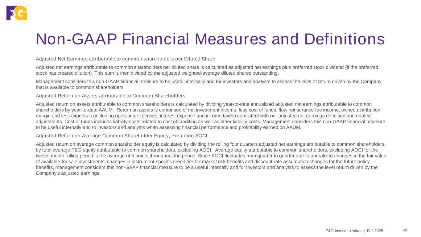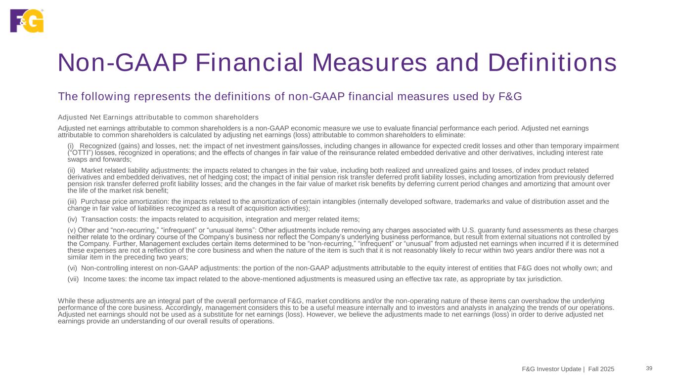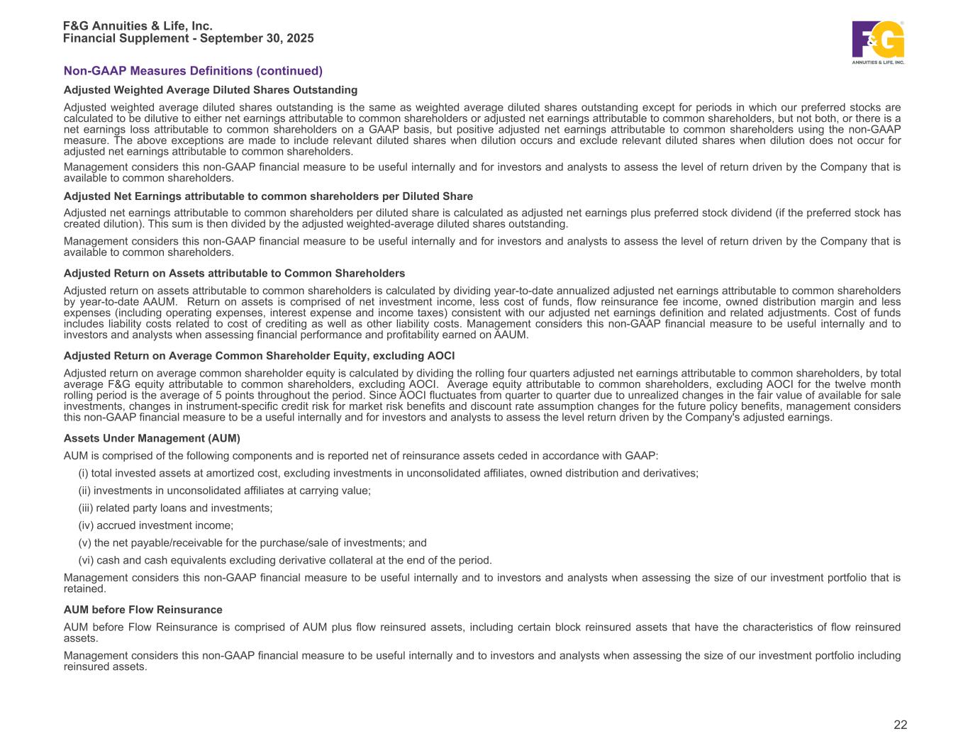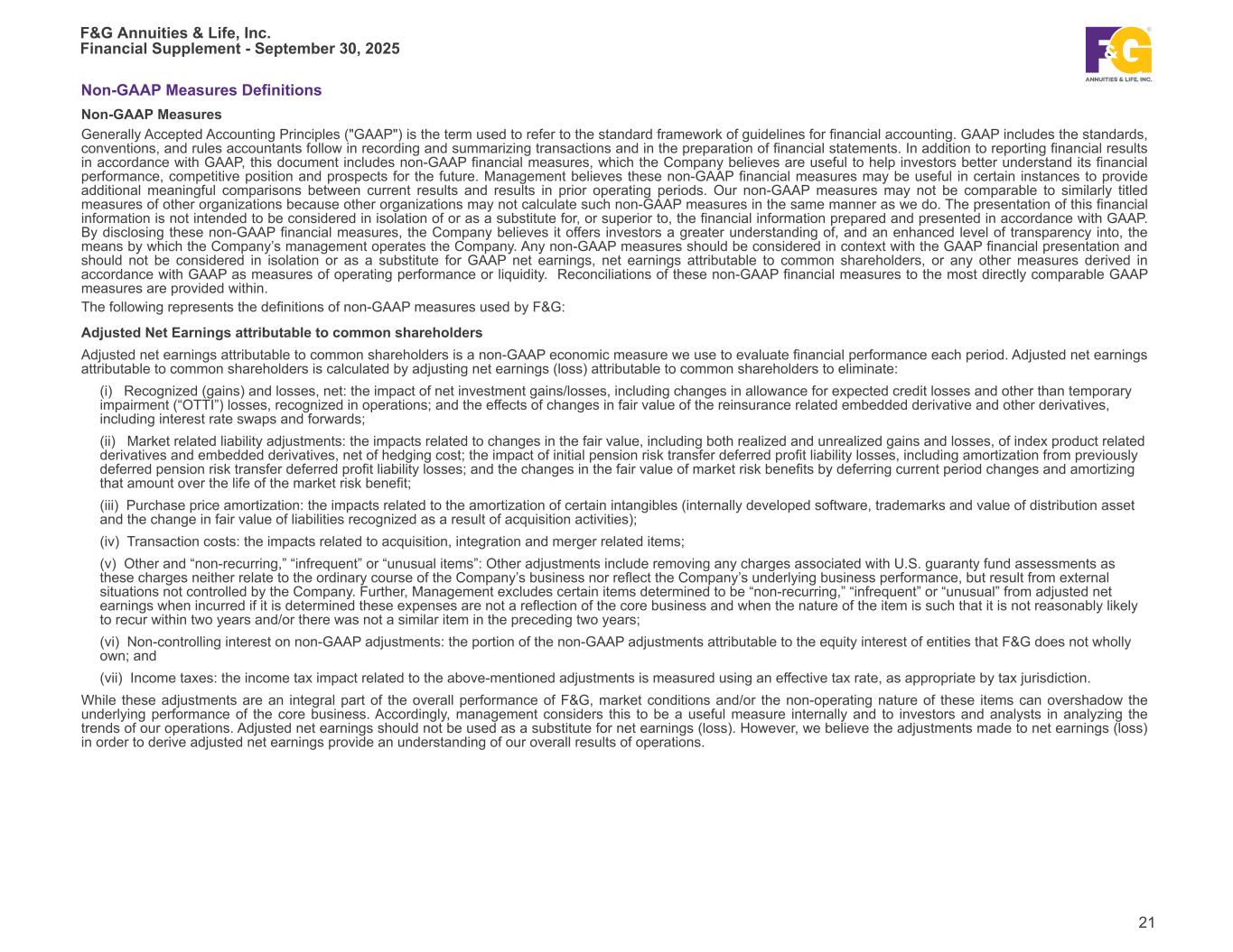 Non-GAAP Measures Definitions Non-GAAP Measures Generally Accepted Accounting Principles ("GAAP") is the term used to refer to the standard framework of guidelines for financial accounting. GAAP includes the standards, conventions, and rules accountants follow in recording and summarizing transactions and in the preparation of financial statements. In addition to reporting financial results in accordance with GAAP, this document includes non-GAAP financial measures, which the Company believes are useful to help investors better understand its financial performance, competitive position and prospects for the future. Management believes these non-GAAP financial measures may be useful in certain instances to provide additional meaningful comparisons between current results and results in prior operating periods. Our non-GAAP measures may not be comparable to similarly titled measures of other organizations because other organizations may not calculate such non-GAAP measures in the same manner as we do. The presentation of this financial information is not intended to be considered in isolation of or as a substitute for, or superior to, the financial information prepared and presented in accordance with GAAP. By disclosing these non-GAAP financial measures, the Company believes it offers investors a greater understanding of, and an enhanced level of transparency into, the means by which the Company’s management operates the Company. Any non-GAAP measures should be considered in context with the GAAP financial presentation and should not be considered in isolation or as a substitute for GAAP net earnings, net earnings attributable to common shareholders, or any other measures derived in accordance with GAAP as measures of operating performance or liquidity. Reconciliations of these non-GAAP financial measures to the most directly comparable GAAP measures are provided within. The following represents the definitions of non-GAAP measures used by F&G: Adjusted Net Earnings attributable to common shareholders Adjusted net earnings attributable to common shareholders is a non-GAAP economic measure we use to evaluate financial performance each period. Adjusted net earnings attributable to common shareholders is calculated by adjusting net earnings (loss) attributable to common shareholders to eliminate: (i) Recognized (gains) and losses, net: the impact of net investment gains/losses, including changes in allowance for expected credit losses and other than temporary impairment (“OTTI”) losses, recognized in operations; and the effects of changes in fair value of the reinsurance related embedded derivative and other derivatives, including interest rate swaps and forwards; (ii) Market related liability adjustments: the impacts related to changes in the fair value, including both realized and unrealized gains and losses, of index product related derivatives and embedded derivatives, net of hedging cost; the impact of initial pension risk transfer deferred profit liability losses, including amortization from previously deferred pension risk transfer deferred profit liability losses; and the changes in the fair value of market risk benefits by deferring current period changes and amortizing that amount over the life of the market risk benefit; (iii) Purchase price amortization: the impacts related to the amortization of certain intangibles (internally developed software, trademarks and value of distribution asset and the change in fair value of liabilities recognized as a result of acquisition activities); (iv) Transaction costs: the impacts related to acquisition, integration and merger related items; (v) Other and “non-recurring,” “infrequent” or “unusual items”: Other adjustments include removing any charges associated with U.S. guaranty fund assessments as these charges neither relate to the ordinary course of the Company’s business nor reflect the Company’s underlying business performance, but result from external situations not controlled by the Company. Further, Management excludes certain items determined to be “non-recurring,” “infrequent” or “unusual” from adjusted net earnings when incurred if it is determined these expenses are not a reflection of the core business and when the nature of the item is such that it is not reasonably likely to recur within two years and/or there was not a similar item in the preceding two years; (vi) Non-controlling interest on non-GAAP adjustments: the portion of the non-GAAP adjustments attributable to the equity interest of entities that F&G does not wholly own; and (vii) Income taxes: the income tax impact related to the above-mentioned adjustments is measured using an effective tax rate, as appropriate by tax jurisdiction. While these adjustments are an integral part of the overall performance of F&G, market conditions and/or the non-operating nature of these items can overshadow the underlying performance of the core business. Accordingly, management considers this to be a useful measure internally and to investors and analysts in analyzing the trends of our operations. Adjusted net earnings should not be used as a substitute for net earnings (loss). However, we believe the adjustments made to net earnings (loss) in order to derive adjusted net earnings provide an understanding of our overall results of operations. F&G Annuities & Life, Inc. Financial Supplement - September 30, 2025 21