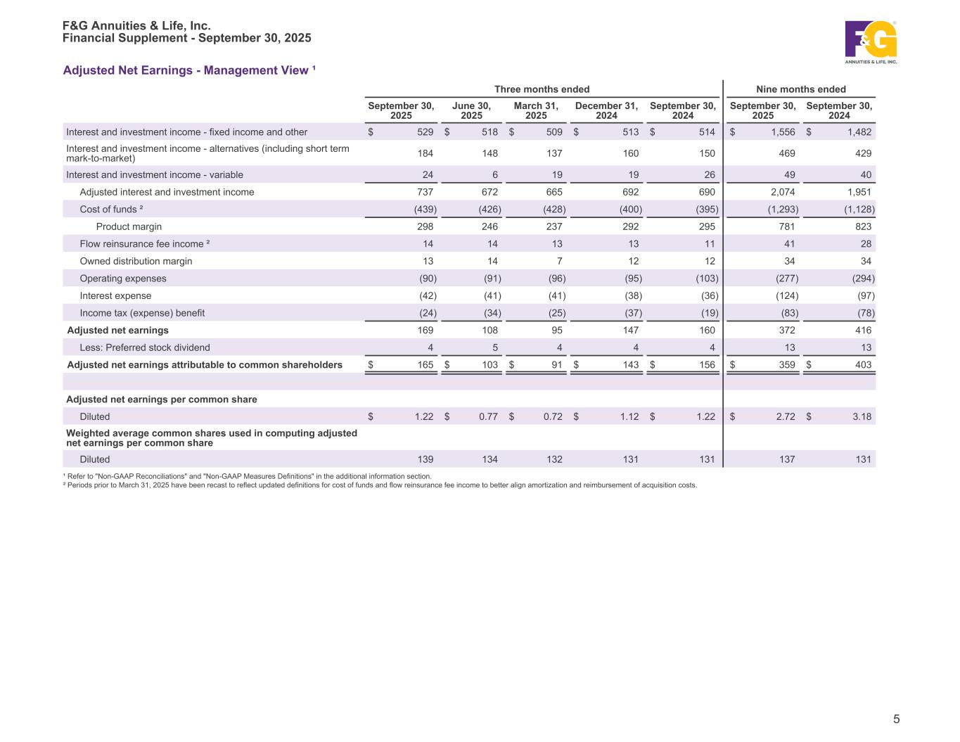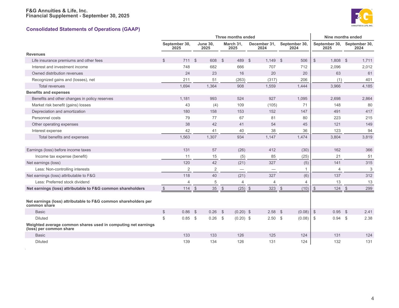 Consolidated Statements of Operations (GAAP) Three months ended Nine months ended September 30, 2025 June 30, 2025 March 31, 2025 December 31, 2024 September 30, 2024 September 30, 2025 September 30, 2024 Revenues Life insurance premiums and other fees $ 711 $ 608 $ 489 $ 1,149 $ 506 $ 1,808 $ 1,711 Interest and investment income 748 682 666 707 712 2,096 2,012 Owned distribution revenues 24 23 16 20 20 63 61 Recognized gains and (losses), net 211 51 (263) (317) 206 (1) 401 Total revenues 1,694 1,364 908 1,559 1,444 3,966 4,185 Benefits and expenses Benefits and other changes in policy reserves 1,181 993 524 927 1,095 2,698 2,864 Market risk benefit (gains) losses 43 (4) 109 (105) 71 148 80 Depreciation and amortization 180 158 153 152 147 491 417 Personnel costs 79 77 67 81 80 223 215 Other operating expenses 38 42 41 54 45 121 149 Interest expense 42 41 40 38 36 123 94 Total benefits and expenses 1,563 1,307 934 1,147 1,474 3,804 3,819 Earnings (loss) before income taxes 131 57 (26) 412 (30) 162 366 Income tax expense (benefit) 11 15 (5) 85 (25) 21 51 Net earnings (loss) 120 42 (21) 327 (5) 141 315 Less: Non-controlling interests 2 2 — — 1 4 3 Net earnings (loss) attributable to F&G 118 40 (21) 327 (6) 137 312 Less: Preferred stock dividend 4 5 4 4 4 13 13 Net earnings (loss) attributable to F&G common shareholders $ 114 $ 35 $ (25) $ 323 $ (10) $ 124 $ 299 Net earnings (loss) attributable to F&G common shareholders per common share Basic $ 0.86 $ 0.26 $ (0.20) $ 2.58 $ (0.08) $ 0.95 $ 2.41 Diluted $ 0.85 $ 0.26 $ (0.20) $ 2.50 $ (0.08) $ 0.94 $ 2.38 Weighted average common shares used in computing net earnings (loss) per common share Basic 133 133 126 125 124 131 124 Diluted 139 134 126 131 124 132 131 . F&G Annuities & Life, Inc. Financial Supplement - September 30, 2025 4
