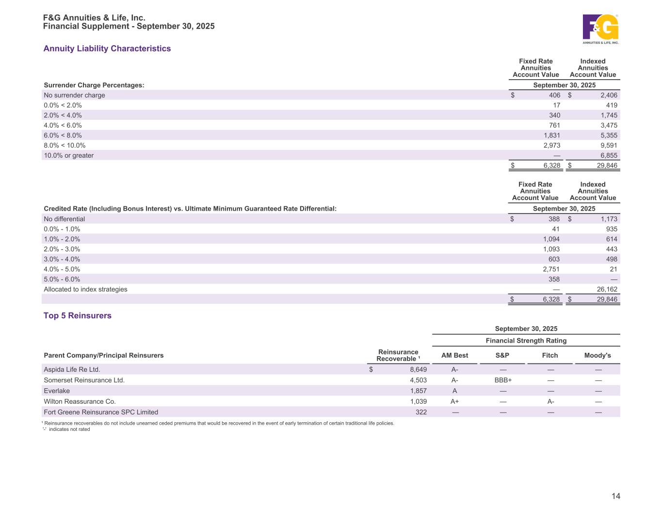 Annuity Liability Characteristics Fixed Rate Annuities Account Value Indexed Annuities Account Value Surrender Charge Percentages: September 30, 2025 No surrender charge $ 406 $ 2,406 0.0% < 2.0% 17 419 2.0% < 4.0% 340 1,745 4.0% < 6.0% 761 3,475 6.0% < 8.0% 1,831 5,355 8.0% < 10.0% 2,973 9,591 10.0% or greater — 6,855 $ 6,328 $ 29,846 Fixed Rate Annuities Account Value Indexed Annuities Account Value Credited Rate (Including Bonus Interest) vs. Ultimate Minimum Guaranteed Rate Differential: September 30, 2025 No differential $ 388 $ 1,173 0.0% - 1.0% 41 935 1.0% - 2.0% 1,094 614 2.0% - 3.0% 1,093 443 3.0% - 4.0% 603 498 4.0% - 5.0% 2,751 21 5.0% - 6.0% 358 — Allocated to index strategies — 26,162 $ 6,328 $ 29,846 Top 5 Reinsurers September 30, 2025 Financial Strength Rating Parent Company/Principal Reinsurers Reinsurance Recoverable ¹ AM Best S&P Fitch Moody's Aspida Life Re Ltd. $ 8,649 A- — — — Somerset Reinsurance Ltd. 4,503 A- BBB+ — — Everlake 1,857 A — — — Wilton Reassurance Co. 1,039 A+ — A- — Fort Greene Reinsurance SPC Limited 322 — — — — ¹ Reinsurance recoverables do not include unearned ceded premiums that would be recovered in the event of early termination of certain traditional life policies. '-' indicates not rated F&G Annuities & Life, Inc. Financial Supplement - September 30, 2025 14