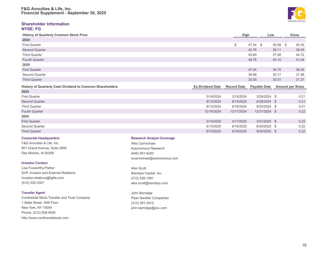 Shareholder Information NYSE: FG History of Quarterly Common Stock Price High Low Close 2024 First Quarter $ 47.54 $ 35.99 $ 40.55 Second Quarter 42.76 35.11 38.05 Third Quarter 45.69 37.08 44.72 Fourth Quarter 48.76 40.10 41.44 2025 First Quarter 47.04 34.70 36.05 Second Quarter 36.88 30.17 31.98 Third Quarter 35.50 30.01 31.27 History of Quarterly Cash Dividend to Common Shareholders Ex-Dividend Date Record Date Payable Date Amount per Share 2024 First Quarter 3/14/2024 3/15/2024 3/29/2024 $ 0.21 Second Quarter 6/13/2024 6/14/2024 6/28/2024 $ 0.21 Third Quarter 9/13/2024 9/16/2024 9/30/2024 $ 0.21 Fourth Quarter 12/16/2024 12/17/2024 12/31/2024 $ 0.22 2025 First Quarter 3/14/2025 3/17/2025 3/31/2025 $ 0.22 Second Quarter 6/13/2025 6/16/2025 6/30/2025 $ 0.22 Third Quarter 9/15/2025 9/16/2025 9/30/2025 $ 0.22 Corporate Headquarters Research Analyst Coverage F&G Annuities & Life, Inc. Wes Carmichael 801 Grand Avenue, Suite 2600 Autonomous Research Des Moines, IA 50309 (646) 561-6250 wcarmichael@autonomous.com Investor Contact Lisa Foxworthy-Parker Alex Scott SVP, Investor and External Relations Barclays Capital, Inc. Investor.relations@fglife.com (212) 526-1561 (515) 330-3307 alex.scott@barclays.com Transfer Agent John Barnidge Continental Stock Transfer and Trust Company Piper Sandler Companies 1 State Street, 30th Floor (312) 281-3412 New York, NY 10004 john.barnidge@psc.com Phone: (212) 509-4000 http://www.continentalstock.com F&G Annuities & Life, Inc. Financial Supplement - September 30, 2025 16