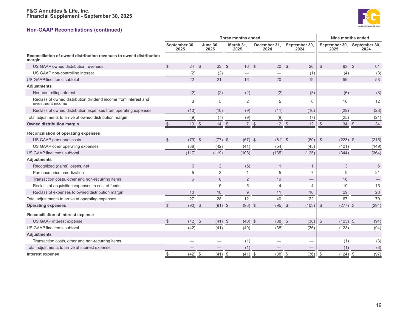 Non-GAAP Reconciliations (continued) Three months ended Nine months ended September 30, 2025 June 30, 2025 March 31, 2025 December 31, 2024 September 30, 2024 September 30, 2025 September 30, 2024 Reconciliation of interest and investment income to adjusted interest and investment income US GAAP interest and investment income $ 748 $ 682 $ 666 $ 707 $ 712 $ 2,096 $ 2,012 Adjustments Recognized (gains) losses, net (8) (5) 1 (10) (16) (12) (49) Reclass of dividend income to owned distribution margin (3) (5) (2) (5) (6) (10) (12) Total adjustments to arrive at adjusted interest and investment income (11) (10) (1) (15) (22) (22) (61) Adjusted interest and investment income $ 737 $ 672 $ 665 $ 692 $ 690 $ 2,074 $ 1,951 Reconciliation of benefits and expenses to cost of funds US GAAP life insurance premiums and other fees 711 608 489 1,149 506 1,808 1,711 US GAAP recognized gains and (losses), net 211 51 (263) (317) 206 (1) 401 US GAAP benefits and other changes in policy reserves (1,181) (993) (524) (927) (1,095) (2,698) (2,864) US GAAP market risk benefit gains (losses) (43) 4 (109) 105 (71) (148) (80) US GAAP depreciation and amortization (180) (158) (153) (152) (147) (491) (417) US GAAP line items subtotal $ (482) $ (488) $ (560) $ (142) $ (601) $ (1,530) $ (1,249) Adjustments Recognized (gains) losses, net 70 82 33 (24) 61 185 103 Market related liability adjustments (37) (16) 103 (233) 145 50 19 Purchase price amortization 24 15 14 16 15 53 42 Reclass of acquisition expenses from operating expenses — (5) (5) (4) (4) (10) (15) Reclass of fee income to flow reinsurance fee income (14) (14) (13) (13) (11) (41) (28) Total adjustments to arrive at cost of funds 43 62 132 (258) 206 237 121 Cost of funds ¹ $ (439) $ (426) $ (428) $ (400) $ (395) $ (1,293) $ (1,128) Composition of flow reinsurance fee income Reclass of fee income from cost of funds 14 14 13 13 11 41 28 Flow reinsurance fee income ¹ $ 14 $ 14 $ 13 $ 13 $ 11 $ 41 $ 28 ¹ Periods prior to March 31, 2025 have been recast to reflect updated definitions for cost of funds and flow reinsurance fee income to better align amortization and reimbursement of acquisition costs. F&G Annuities & Life, Inc. Financial Supplement - September 30, 2025 18