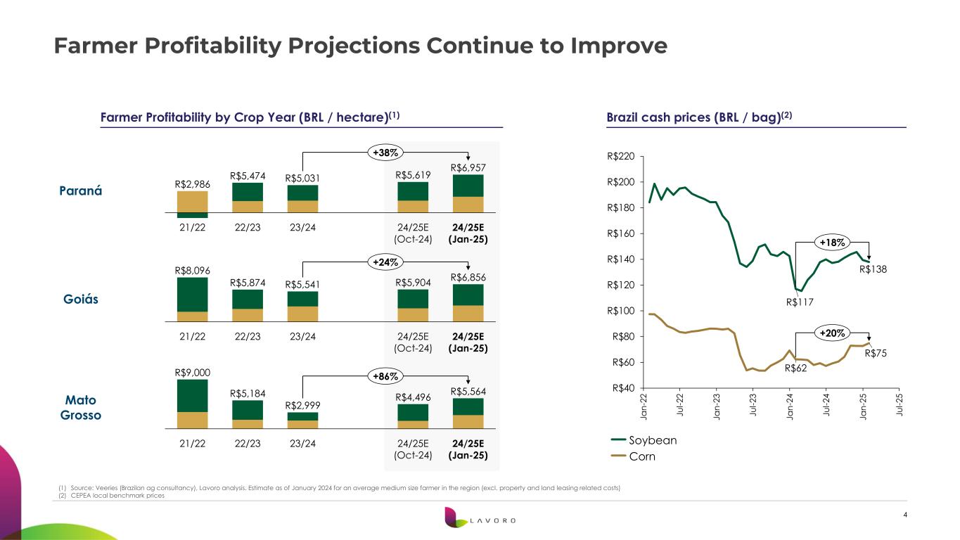 Reconciliation of Adjusted Profit/Loss Consolidated Results (BRL) 1Q24 1Q25 (in millions of Brazilian reais) Profit (loss) (71.0) (267.1) (+) Fair value of inventories sold from acquired companies 7.9 – (+) Share of profit of an associate 1.0 (10.2) (+) M&A expenses 16.9 0.4 (+) Stock-based compensation 6.0 2.3 (+) DeSPAC related bonus 6.5 0.0 (+) Related party consultancy services 4.2 4.3 (+) Tax impact of adjustments (14.5) 1.1 Adjusted Profit/Loss (42.9) (269.2) Consolidated Results (USD) 1Q24 1Q25 (in millions of US dollars) Profit (loss) (14.5) (48.2) (+) Fair value of inventories sold from acquired companies 1.6 – (+) Share of profit of an associate 0.2 (1.8) (+) M&A expenses 3.5 0.1 (+) Stock-based compensation 1.2 0.4 (+) DeSPAC related bonus 1.3 0.0 (+) Related party consultancy services 0.9 0.8 (+) Tax impact of adjustments (3.0) 0.2 Adjusted Profit/Loss (8.8) (48.5) About Lavoro Lavoro is Brazil's largest agricultural inputs retailer and a leading producer of agricultural biological products. Lavoro's shares and warrants are listed on the Nasdaq stock exchange under the tickers "LVRO" and "LVROW." Through its comprehensive portfolio of products and services, the company empowers small and medium-size farmers to adopt the latest emerging agricultural technologies and enhance their productivity. Since its founding in 2017, Lavoro has broadened its reach across Latin America, serving 72,000 customers in Brazil, Colombia, Uruguay, and Ecuador via its team of over 1,000 technical sales representatives (RTVs). Lavoro's RTVs are local trusted advisors to farmers, regularly meeting them to provide agronomic recommendations throughout the crop cycle to drive optimized outcomes. Learn more about Lavoro at ir.lavoroagro.com. Reportable Segments Lavoro’s reportable segments are the following: Brazil Ag Retail: comprises companies dedicated to the distribution of agricultural inputs such as crop protection, seeds, fertilizers, and specialty products, in Brazil. Latam Ag Retail: includes companies dedicated to the distribution of agricultural inputs outside Brazil (currently primarily in Colombia).