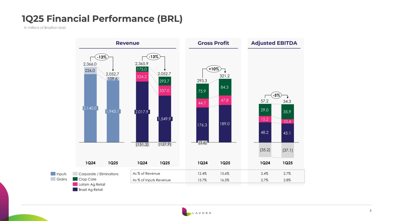 Consolidated Results (BRL) 1Q24 1Q25 Chg. % (in millions of Brazilian reais) Revenue by Segment 2,366.0 2,052.7 (13 %) Brazil Ag Retail 2,017.9 1,549.9 (23%) Latam Ag Retail 324.2 337.0 4% Crop Care 175.0 293.7 68% Intercompany eliminations (151.2) (127.9) Revenue by Category 2,366.0 2,052.7 (13%) Inputs revenue 2,140.0 1,943.1 (9%) Grains revenue 226.0 109.6 (52%) Gross Profit 293.3 321.2 10% Brazil Ag Retail 176.3 189.0 7% Latam Ag Retail 44.7 47.8 7% Crop Care 75.9 84.3 11% Intercompany elim. (3.6) 0.1 Gross Margin 12.4% 15.6% 320 bps Brazil Ag Retail 8.7% 12.2% 350 bps Latam Ag Retail 13.8% 14.2% 40 bps Crop Care 43.3% 28.7% -1460 bps Gross Margin (% of Inputs revenue) 13.7% 16.5% 280 bps Brazil Ag Retail 9.7% 12.8% 310 bps Latam Ag Retail 15.2% 15.9% 70 bps Crop Care 43.3% 28.7% -1460 bps SG&A (excl. D&A) (270.1) (275.1) 2% Other operating income (expense) 0.4 1.3 EBITDA 23.6 47.4 101% (+) Adjustment items 33.7 7.0 Adjusted EBITDA 57.2 54.4 (5%) Brazil Ag Retail 48.2 45.1 (6%) Latam Ag Retail 15.2 10.4 (32%) Crop Care 29.0 35.9 24% Corporate & Intercompany elim. (35.2) (37.1) Adjusted EBITDA Margin % 2.4% 2.7% 20 bps Adjusted EBITDA Margin (% of Inputs) 2.7% 2.8% 10 bps Share of profit of an associate (1.0) 10.2 D&A (incl. PPA amortization) (50.2) (43.9) Finance income (costs) (129.0) (189.7) Income taxes, current and deferred 85.5 (91.1) Profit (loss) (71.0) (267.1) (+) Adjustment items 42.5 (3.2) (+) Income tax impact of adjustments (14.5) 1.1 Adjusted Profit/Loss (42.9) (269.2)
