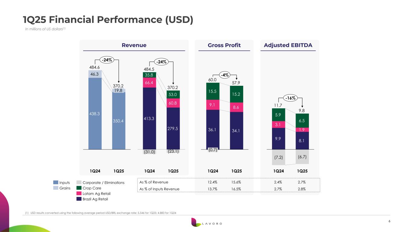 Consolidated Results (USD) 1Q24 1Q25 Chg. % (in millions of US dollars) Revenue by Segment 484.6 370.2 (24%) Brazil Ag Retail 413.3 279.5 (32%) Latam Ag Retail 66.4 60.8 (8%) Crop Care 35.8 53.0 48% Intercompany eliminations (31.0) (23.1) Revenue by Category 484.6 370.2 (24%) Inputs revenue 438.3 350.4 (20%) Grains revenue 46.3 19.8 (57%) Gross Profit 60.1 57.9 (4%) Brazil Ag Retail 36.1 34.1 (6%) Latam Ag Retail 9.1 8.6 (6%) Crop Care 15.5 15.2 (2%) Intercompany elim. (0.7) 0.0 Gross Margin 12.4% 15.6% 320 bps Brazil Ag Retail 8.7% 12.2% 350 bps Latam Ag Retail 13.8% 14.2% 40 bps Crop Care 43.3% 28.7% -1460 bps Gross Margin (% of Inputs revenue) 13.7% 16.5% 280 bps Brazil Ag Retail 9.7% 12.8% 310 bps Latam Ag Retail 15.2% 15.9% 70 bps Crop Care 43.3% 28.7% -1460 bps SG&A (excl. D&A) (55.3) (49.6) (10%) Other operating income (expense) 0.1 0.2 EBITDA 4.8 8.5 77% (+) Adjustment items 6.9 1.3 Adjusted EBITDA 11.7 9.8 (16%) Brazil Ag Retail 9.9 8.1 (17%) Latam Ag Retail 3.1 1.9 (40%) Crop Care 5.9 6.5 9% Corporate & Intercompany elim. (7.2) (6.7) Adjusted EBITDA Margin % 2.4% 2.7% 20 bps Adjusted EBITDA Margin (% of Inputs) 2.7% 2.8% 10 bps Share of profit of an associate (0.2) 1.8 D&A (incl. PPA amortization) (10.3) (7.9) Finance income (costs) (26.4) (34.2) Income taxes, current and deferred 17.5 (16.4) Profit (loss) (14.5) (48.2) (+) Adjustment items 8.7 (0.6) (+) Income tax impact of adjustments (3.0) 0.2 Adjusted Profit/Loss (8.8) (48.5)