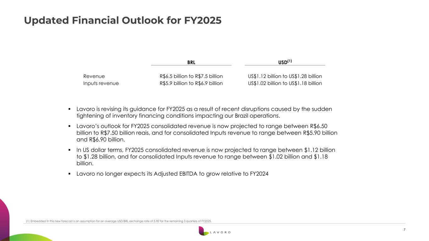 Crop Care (BRL) 1Q24 1Q25 Chg. % (in millions of Brazilian reais) Revenue 175.0 293.7 68% Gross Profit 75.9 84.3 11% Gross Margin 43.3% 28.7% -1460 bps Adjusted EBITDA 29.0 35.9 24% Adjusted EBITDA margin 16.6% 12.2% -440 bps Crop Care (USD) 1Q24 1Q25 Chg. % (in millions of US dollars) Revenue 35.8 53.0 48% Gross Profit 15.5 15.2 (2%) Gross Margin 43.3% 28.7% -1460 bps Adjusted EBITDA 5.9 6.5 9% Adjusted EBITDA margin 16.6% 12.2% -440 bps Revised Fiscal Year 2025 Consolidated Outlook Lavoro is revising its guidance for FY2025 as a result of recent disruptions caused by the sudden tightening of inventory financing conditions impacting our Brazil operations. Lavoro’s outlook for FY2025 consolidated revenue is now projected to range between R$6.50 billion to R$7.50 billion reais, and for consolidated Inputs revenue to range between R$5.90 billion and R$6.90 billion. In US dollar terms, FY2025 consolidated revenue is now projected to range between $1.12 billion to $1.28 billion, and for consolidated Inputs revenue to range between $1.02 billion and $1.18 billion. Embedded in this new forecast is an assumption for an average USD/BRL exchange rate of 5.90 for the remaining 3 quarters of FY2025. Finally, Lavoro no longer expects its Adjusted EBITDA to grow relative to FY2024.