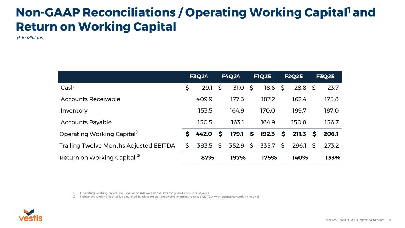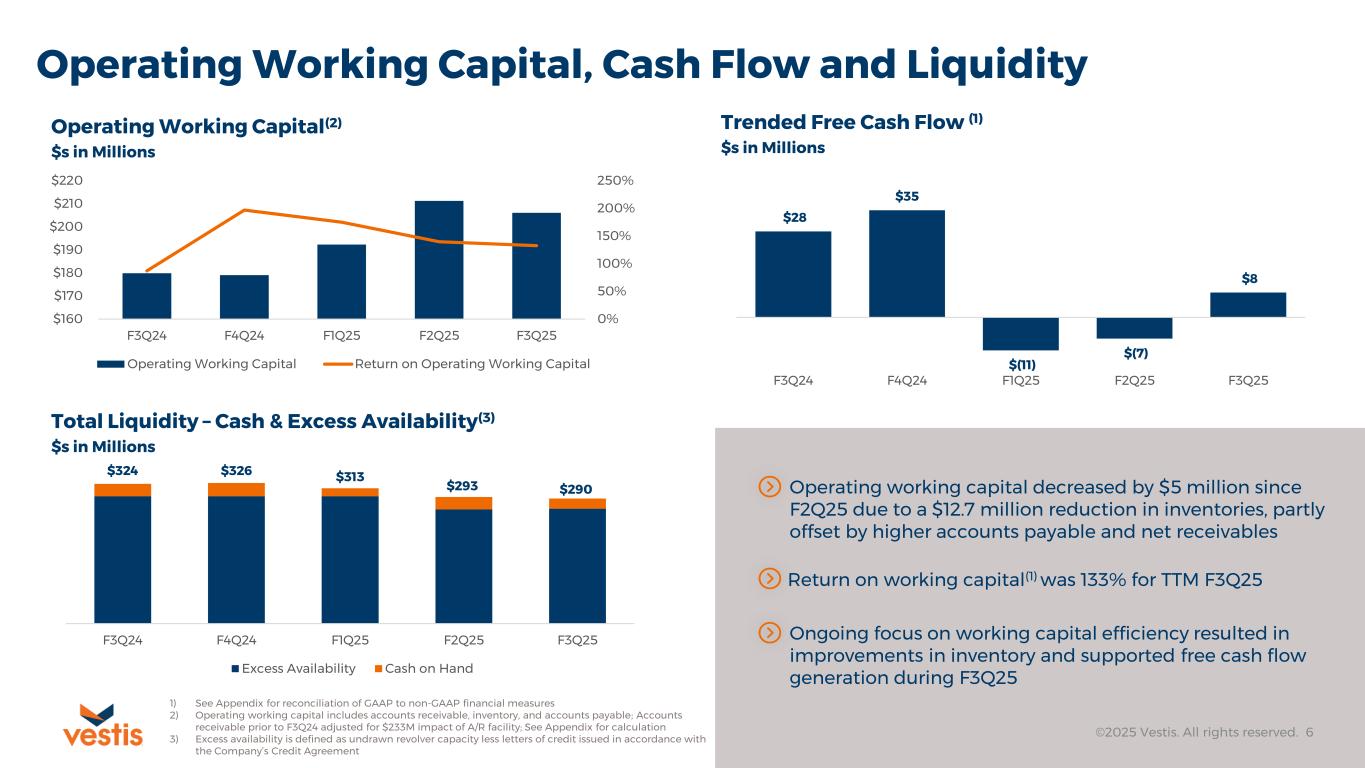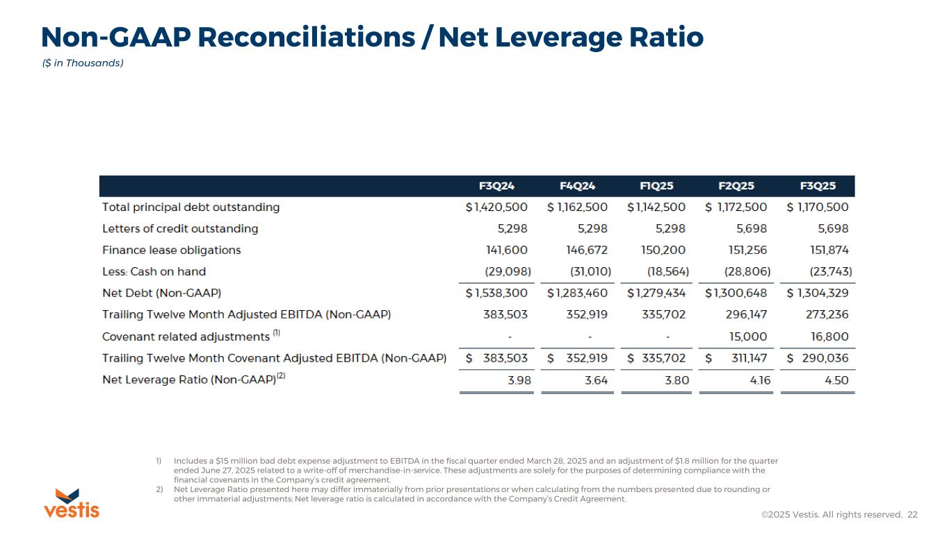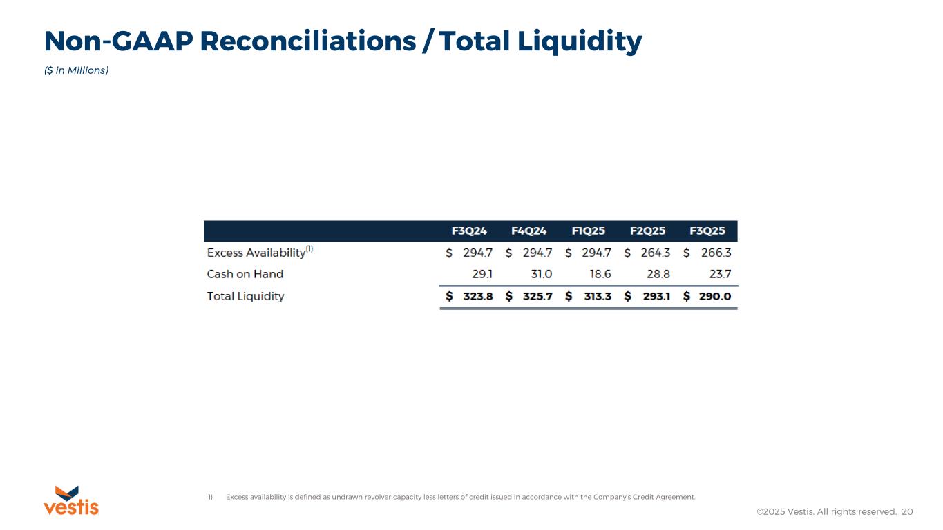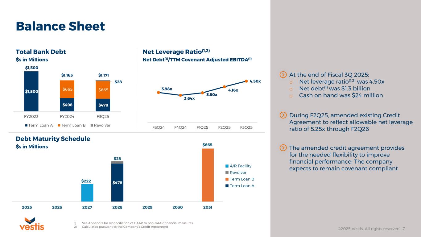 2025年6月27日現在、ヴェスティスの現金およびリボルビング・クレジット・ファシリティの余剰利用可能額は、2024年第3四半期末の3億2,400万ドルに対し、2億9,000万ドルであった。第3四半期末の負債残高は、銀行借入残高11.7億ドルを含め13.2億ドルでした。2025年度第3四半期末のネット・レバレッジ・レシオa*は4.50倍だった。クレジット契約(修正後)に従い、2026年7月3日以前に終了する四半期については、ネット・レバレッジ・レシオが5.25倍を超えることはない。