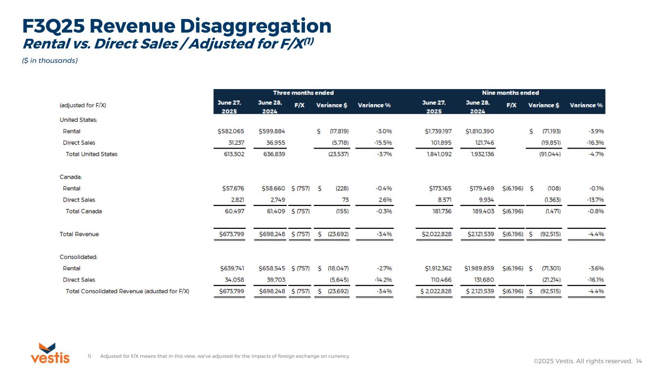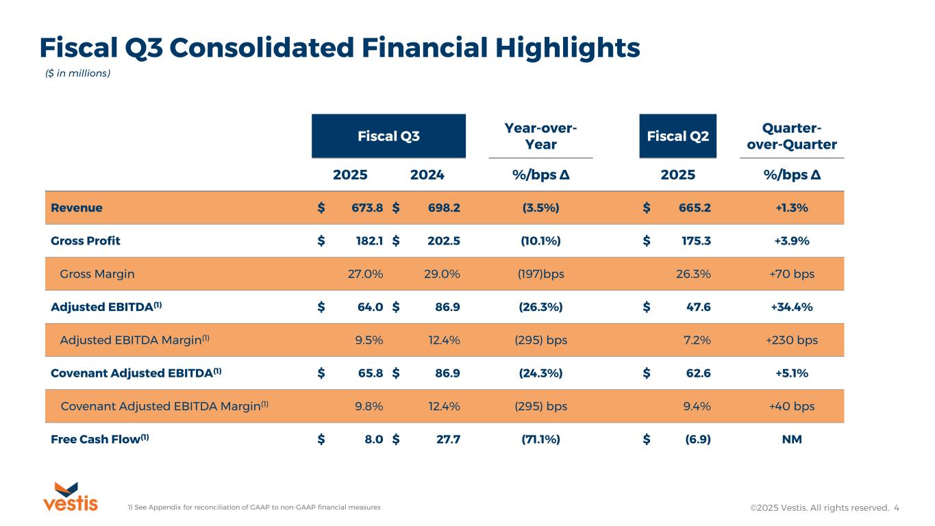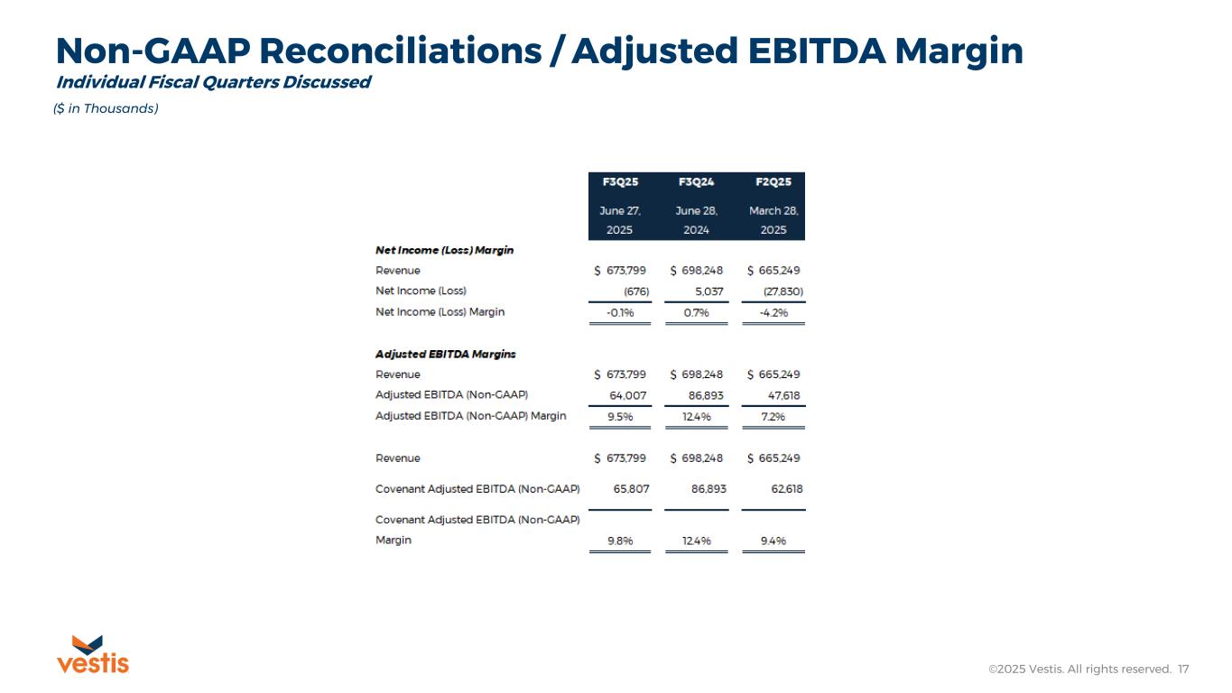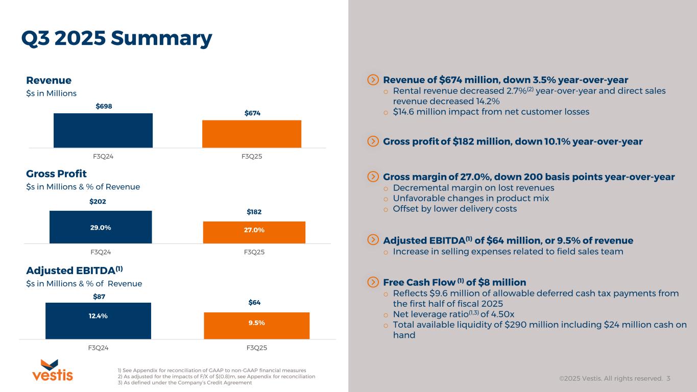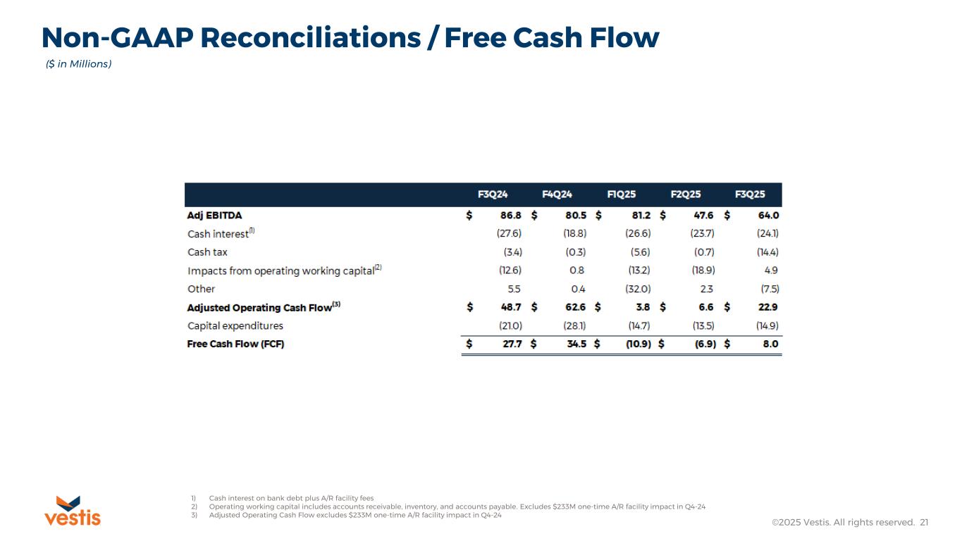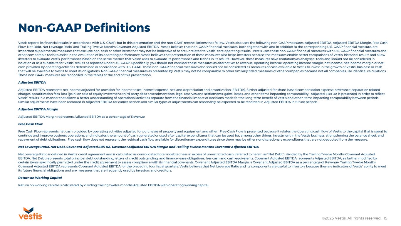 2025年6月27日現在、ヴェスティスの現金およびリボルビング・クレジット・ファシリティの余剰利用可能額は、2024年第3四半期末の3億2,400万ドルに対し、2億9,000万ドルであった。第3四半期末の負債残高は、銀行借入残高11.7億ドルを含め13.2億ドルでした。2025年度第3四半期末のネット・レバレッジ・レシオa*は4.50倍だった。クレジット契約(修正後)に従い、2026年7月3日以前に終了する四半期については、ネット・レバレッジ・レシオが5.25倍を超えることはない。