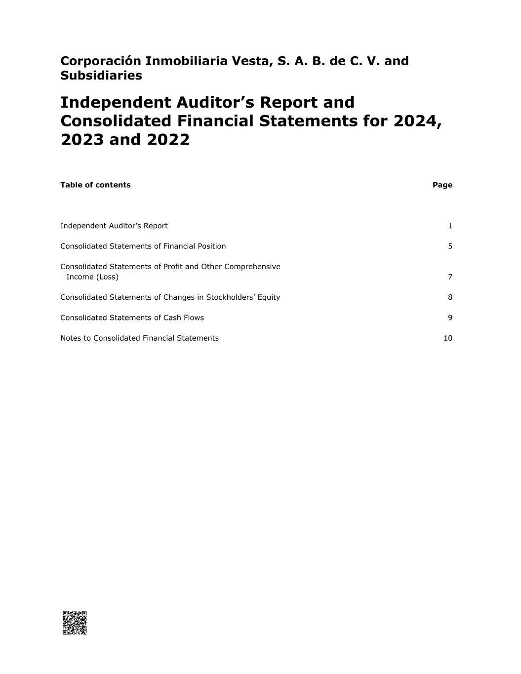Corporación Inmobiliaria Vesta, S. A. B. de C. V. and Subsidiaries Independent Auditor’s Report and Consolidated Financial Statements for 2024, 2023 and 2022 Table of contents Page Independent Auditor’s Report 1 Consolidated Statements of Financial Position 5 Consolidated Statements of Profit and Other Comprehensive Income (Loss) 7 Consolidated Statements of Changes in Stockholders’ Equity 8 Consolidated Statements of Cash Flows 9 Notes to Consolidated Financial Statements 10