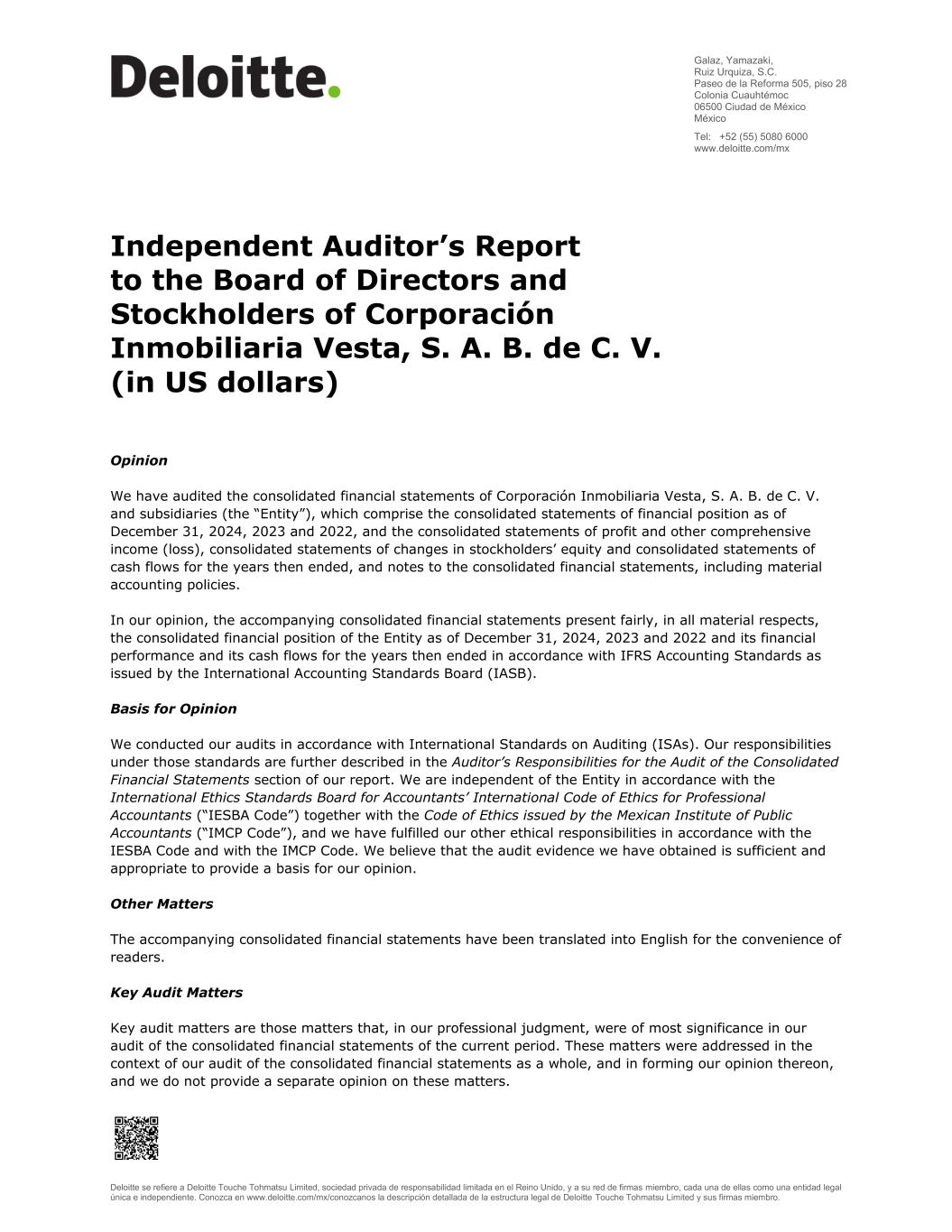 Independent Auditor’s Report to the Board of Directors and Stockholders of Corporación Inmobiliaria Vesta, S. A. B. de C. V. (in US dollars) Opinion We have audited the consolidated financial statements of Corporación Inmobiliaria Vesta, S. A. B. de C. V. and subsidiaries (the “Entity”), which comprise the consolidated statements of financial position as of December 31, 2024, 2023 and 2022, and the consolidated statements of profit and other comprehensive income (loss), consolidated statements of changes in stockholders’ equity and consolidated statements of cash flows for the years then ended, and notes to the consolidated financial statements, including material accounting policies. In our opinion, the accompanying consolidated financial statements present fairly, in all material respects, the consolidated financial position of the Entity as of December 31, 2024, 2023 and 2022 and its financial performance and its cash flows for the years then ended in accordance with IFRS Accounting Standards as issued by the International Accounting Standards Board (IASB). Basis for Opinion We conducted our audits in accordance with International Standards on Auditing (ISAs). Our responsibilities under those standards are further described in the Auditor’s Responsibilities for the Audit of the Consolidated Financial Statements section of our report. We are independent of the Entity in accordance with the International Ethics Standards Board for Accountants’ International Code of Ethics for Professional Accountants (“IESBA Code”) together with the Code of Ethics issued by the Mexican Institute of Public Accountants (“IMCP Code”), and we have fulfilled our other ethical responsibilities in accordance with the IESBA Code and with the IMCP Code. We believe that the audit evidence we have obtained is sufficient and appropriate to provide a basis for our opinion. Other Matters The accompanying consolidated financial statements have been translated into English for the convenience of readers. Key Audit Matters Key audit matters are those matters that, in our professional judgment, were of most significance in our audit of the consolidated financial statements of the current period. These matters were addressed in the context of our audit of the consolidated financial statements as a whole, and in forming our opinion thereon, and we do not provide a separate opinion on these matters. Deloitte se refiere a Deloitte Touche Tohmatsu Limited, sociedad privada de responsabilidad limitada en el Reino Unido, y a su red de firmas miembro, cada una de ellas como una entidad legal única e independiente. Conozca en www.deloitte.com/mx/conozcanos la descripción detallada de la estructura legal de Deloitte Touche Tohmatsu Limited y sus firmas miembro. Galaz, Yamazaki, Ruiz Urquiza, S.C. Paseo de la Reforma 505, piso 28 Colonia Cuauhtémoc 06500 Ciudad de México México Tel: +52 (55) 5080 6000 www.deloitte.com/mx