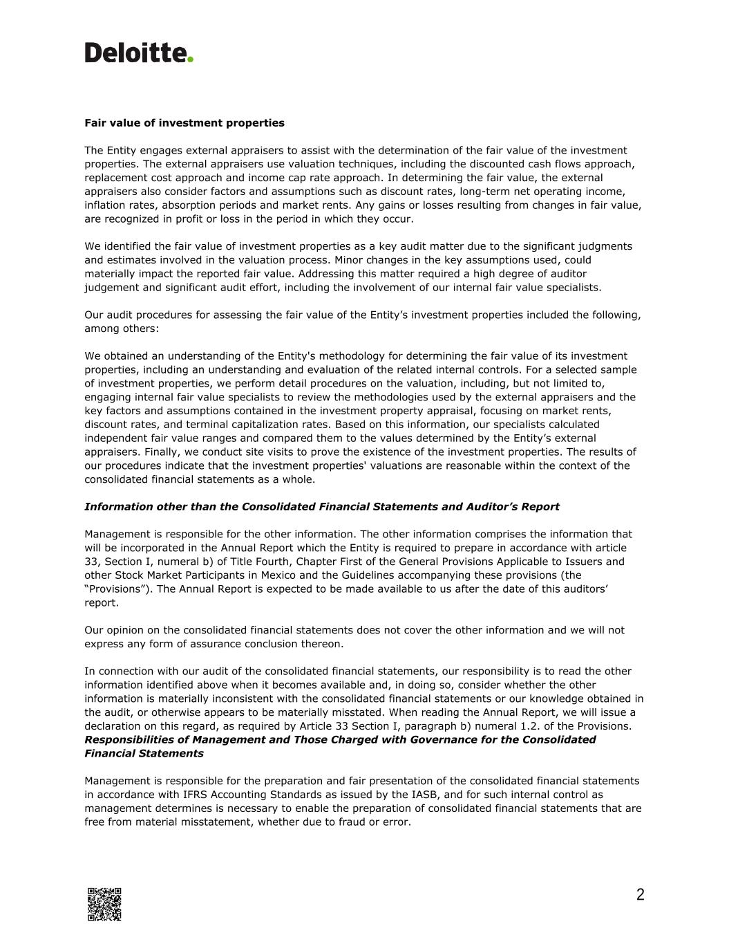 2 Fair value of investment properties The Entity engages external appraisers to assist with the determination of the fair value of the investment properties. The external appraisers use valuation techniques, including the discounted cash flows approach, replacement cost approach and income cap rate approach. In determining the fair value, the external appraisers also consider factors and assumptions such as discount rates, long-term net operating income, inflation rates, absorption periods and market rents. Any gains or losses resulting from changes in fair value, are recognized in profit or loss in the period in which they occur. We identified the fair value of investment properties as a key audit matter due to the significant judgments and estimates involved in the valuation process. Minor changes in the key assumptions used, could materially impact the reported fair value. Addressing this matter required a high degree of auditor judgement and significant audit effort, including the involvement of our internal fair value specialists. Our audit procedures for assessing the fair value of the Entity’s investment properties included the following, among others: We obtained an understanding of the Entity's methodology for determining the fair value of its investment properties, including an understanding and evaluation of the related internal controls. For a selected sample of investment properties, we perform detail procedures on the valuation, including, but not limited to, engaging internal fair value specialists to review the methodologies used by the external appraisers and the key factors and assumptions contained in the investment property appraisal, focusing on market rents, discount rates, and terminal capitalization rates. Based on this information, our specialists calculated independent fair value ranges and compared them to the values determined by the Entity’s external appraisers. Finally, we conduct site visits to prove the existence of the investment properties. The results of our procedures indicate that the investment properties' valuations are reasonable within the context of the consolidated financial statements as a whole. Information other than the Consolidated Financial Statements and Auditor’s Report Management is responsible for the other information. The other information comprises the information that will be incorporated in the Annual Report which the Entity is required to prepare in accordance with article 33, Section I, numeral b) of Title Fourth, Chapter First of the General Provisions Applicable to Issuers and other Stock Market Participants in Mexico and the Guidelines accompanying these provisions (the “Provisions”). The Annual Report is expected to be made available to us after the date of this auditors’ report. Our opinion on the consolidated financial statements does not cover the other information and we will not express any form of assurance conclusion thereon. In connection with our audit of the consolidated financial statements, our responsibility is to read the other information identified above when it becomes available and, in doing so, consider whether the other information is materially inconsistent with the consolidated financial statements or our knowledge obtained in the audit, or otherwise appears to be materially misstated. When reading the Annual Report, we will issue a declaration on this regard, as required by Article 33 Section I, paragraph b) numeral 1.2. of the Provisions. Responsibilities of Management and Those Charged with Governance for the Consolidated Financial Statements Management is responsible for the preparation and fair presentation of the consolidated financial statements in accordance with IFRS Accounting Standards as issued by the IASB, and for such internal control as management determines is necessary to enable the preparation of consolidated financial statements that are free from material misstatement, whether due to fraud or error. Deloitte.