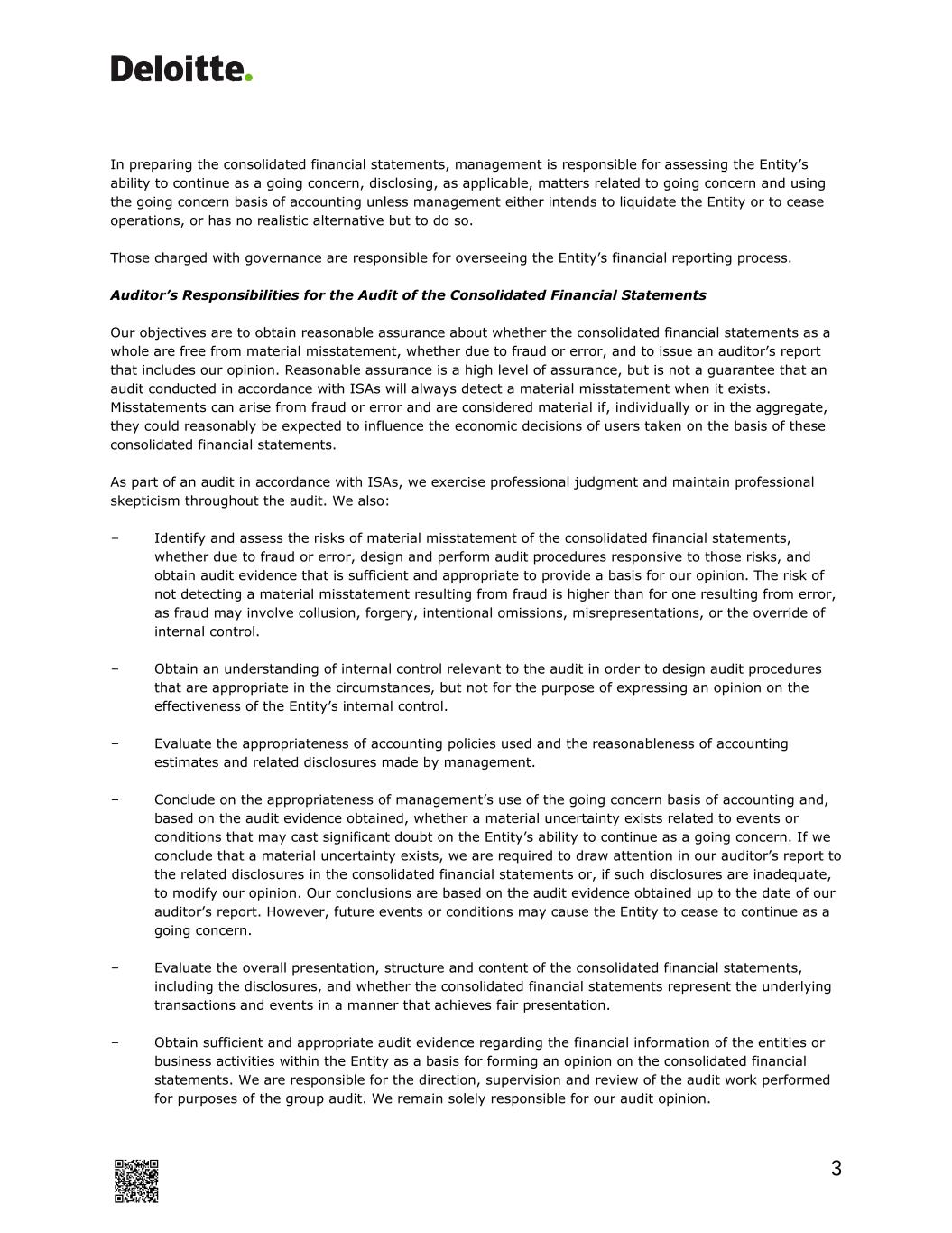 3 In preparing the consolidated financial statements, management is responsible for assessing the Entity’s ability to continue as a going concern, disclosing, as applicable, matters related to going concern and using the going concern basis of accounting unless management either intends to liquidate the Entity or to cease operations, or has no realistic alternative but to do so. Those charged with governance are responsible for overseeing the Entity’s financial reporting process. Auditor’s Responsibilities for the Audit of the Consolidated Financial Statements Our objectives are to obtain reasonable assurance about whether the consolidated financial statements as a whole are free from material misstatement, whether due to fraud or error, and to issue an auditor’s report that includes our opinion. Reasonable assurance is a high level of assurance, but is not a guarantee that an audit conducted in accordance with ISAs will always detect a material misstatement when it exists. Misstatements can arise from fraud or error and are considered material if, individually or in the aggregate, they could reasonably be expected to influence the economic decisions of users taken on the basis of these consolidated financial statements. As part of an audit in accordance with ISAs, we exercise professional judgment and maintain professional skepticism throughout the audit. We also: Identify and assess the risks of material misstatement of the consolidated financial statements, whether due to fraud or error, design and perform audit procedures responsive to those risks, and obtain audit evidence that is sufficient and appropriate to provide a basis for our opinion. The risk of not detecting a material misstatement resulting from fraud is higher than for one resulting from error, as fraud may involve collusion, forgery, intentional omissions, misrepresentations, or the override of internal control. Obtain an understanding of internal control relevant to the audit in order to design audit procedures that are appropriate in the circumstances, but not for the purpose of expressing an opinion on the effectiveness of the Entity’s internal control. Evaluate the appropriateness of accounting policies used and the reasonableness of accounting estimates and related disclosures made by management. Conclude on the appropriateness of management’s use of the going concern basis of accounting and, based on the audit evidence obtained, whether a material uncertainty exists related to events or conditions that may cast significant doubt on the Entity’s ability to continue as a going concern. If we conclude that a material uncertainty exists, we are required to draw attention in our auditor’s report to the related disclosures in the consolidated financial statements or, if such disclosures are inadequate, to modify our opinion. Our conclusions are based on the audit evidence obtained up to the date of our auditor’s report. However, future events or conditions may cause the Entity to cease to continue as a going concern. Evaluate the overall presentation, structure and content of the consolidated financial statements, including the disclosures, and whether the consolidated financial statements represent the underlying transactions and events in a manner that achieves fair presentation. Obtain sufficient and appropriate audit evidence regarding the financial information of the entities or business activities within the Entity as a basis for forming an opinion on the consolidated financial statements. We are responsible for the direction, supervision and review of the audit work performed for purposes of the group audit. We remain solely responsible for our audit opinion. Deloitte.