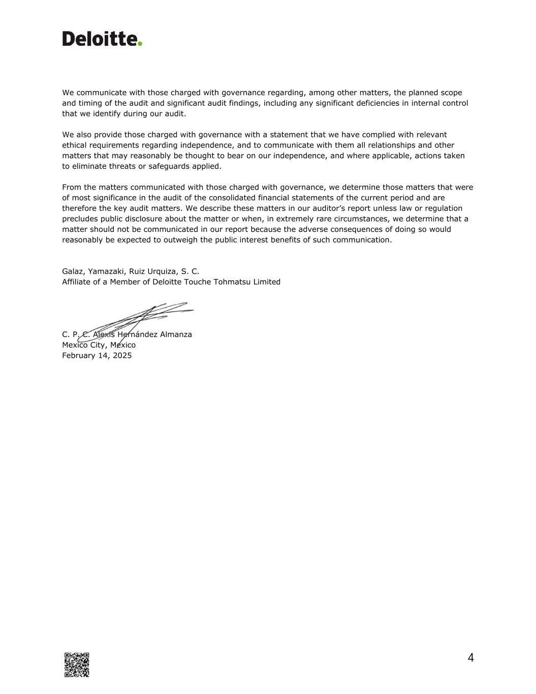 4 We communicate with those charged with governance regarding, among other matters, the planned scope and timing of the audit and significant audit findings, including any significant deficiencies in internal control that we identify during our audit. We also provide those charged with governance with a statement that we have complied with relevant ethical requirements regarding independence, and to communicate with them all relationships and other matters that may reasonably be thought to bear on our independence, and where applicable, actions taken to eliminate threats or safeguards applied. From the matters communicated with those charged with governance, we determine those matters that were of most significance in the audit of the consolidated financial statements of the current period and are therefore the key audit matters. We describe these matters in our auditor’s report unless law or regulation precludes public disclosure about the matter or when, in extremely rare circumstances, we determine that a matter should not be communicated in our report because the adverse consequences of doing so would reasonably be expected to outweigh the public interest benefits of such communication. Galaz, Yamazaki, Ruiz Urquiza, S. C. Affiliate of a Member of Deloitte Touche Tohmatsu Limited C. P. C. Alexis Hernández Almanza Mexico City, Mexico February 14, 2025 Deloitte.
