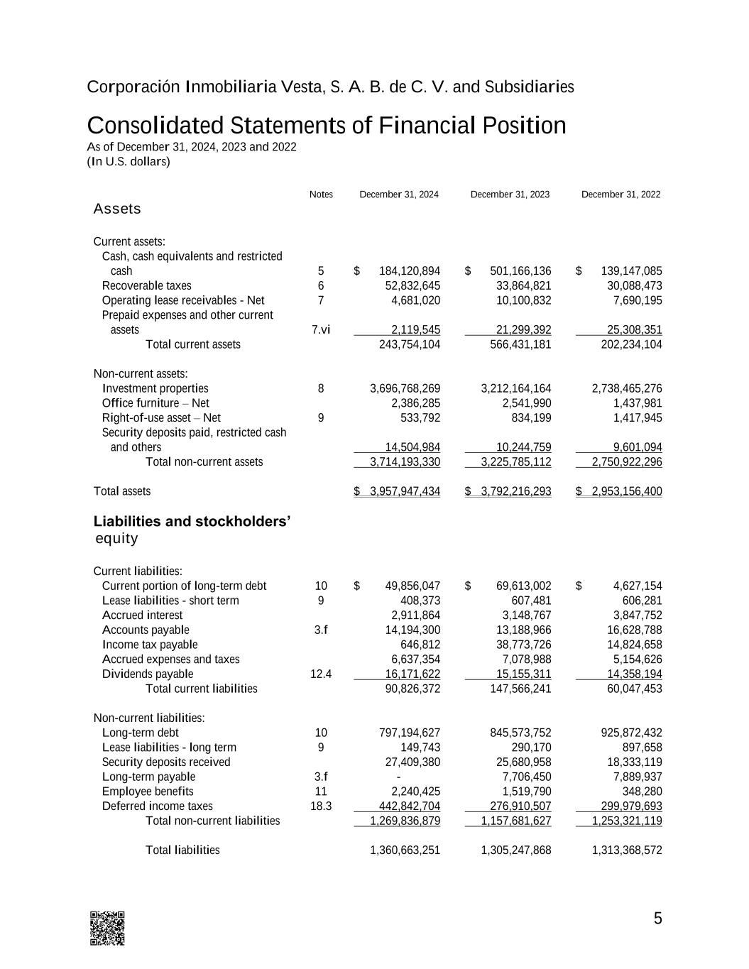 5 Corporación Inmobiliaria Vesta, S. A. B. de C. V. and Subsidiaries Consolidated Statements of Financial Position As of December 31, 2024, 2023 and 2022 (In U.S. dollars) Notes December 31, 2024 December 31, 2023 December 31, 2022 Assets Current assets: Cash, cash equivalents and restricted cash 5 $ 184,120,894 $ 501,166,136 $ 139,147,085 Recoverable taxes 6 52,832,645 33,864,821 30,088,473 Operating lease receivables - Net 7 4,681,020 10,100,832 7,690,195 Prepaid expenses and other current assets 7.vi 2,119,545 21,299,392 25,308,351 Total current assets 243,754,104 566,431,181 202,234,104 Non-current assets: Investment properties 8 3,696,768,269 3,212,164,164 2,738,465,276 Office furniture – Net 2,386,285 2,541,990 1,437,981 Right-of-use asset – Net 9 533,792 834,199 1,417,945 Security deposits paid, restricted cash and others 14,504,984 10,244,759 9,601,094 Total non-current assets 3,714,193,330 3,225,785,112 2,750,922,296 Total assets $ 3,957,947,434 $ 3,792,216,293 $ 2,953,156,400 Liabilities and stockholders’ equity Current liabilities: Current portion of long-term debt 10 $ 49,856,047 $ 69,613,002 $ 4,627,154 Lease liabilities - short term 9 408,373 607,481 606,281 Accrued interest 2,911,864 3,148,767 3,847,752 Accounts payable 3.f 14,194,300 13,188,966 16,628,788 Income tax payable 646,812 38,773,726 14,824,658 Accrued expenses and taxes 6,637,354 7,078,988 5,154,626 Dividends payable 12.4 16,171,622 15,155,311 14,358,194 Total current liabilities 90,826,372 147,566,241 60,047,453 Non-current liabilities: Long-term debt 10 797,194,627 845,573,752 925,872,432 Lease liabilities - long term 9 149,743 290,170 897,658 Security deposits received 27,409,380 25,680,958 18,333,119 Long-term payable 3.f - 7,706,450 7,889,937 Employee benefits 11 2,240,425 1,519,790 348,280 Deferred income taxes 18.3 442,842,704 276,910,507 299,979,693 Total non-current liabilities 1,269,836,879 1,157,681,627 1,253,321,119 Total liabilities 1,360,663,251 1,305,247,868 1,313,368,572