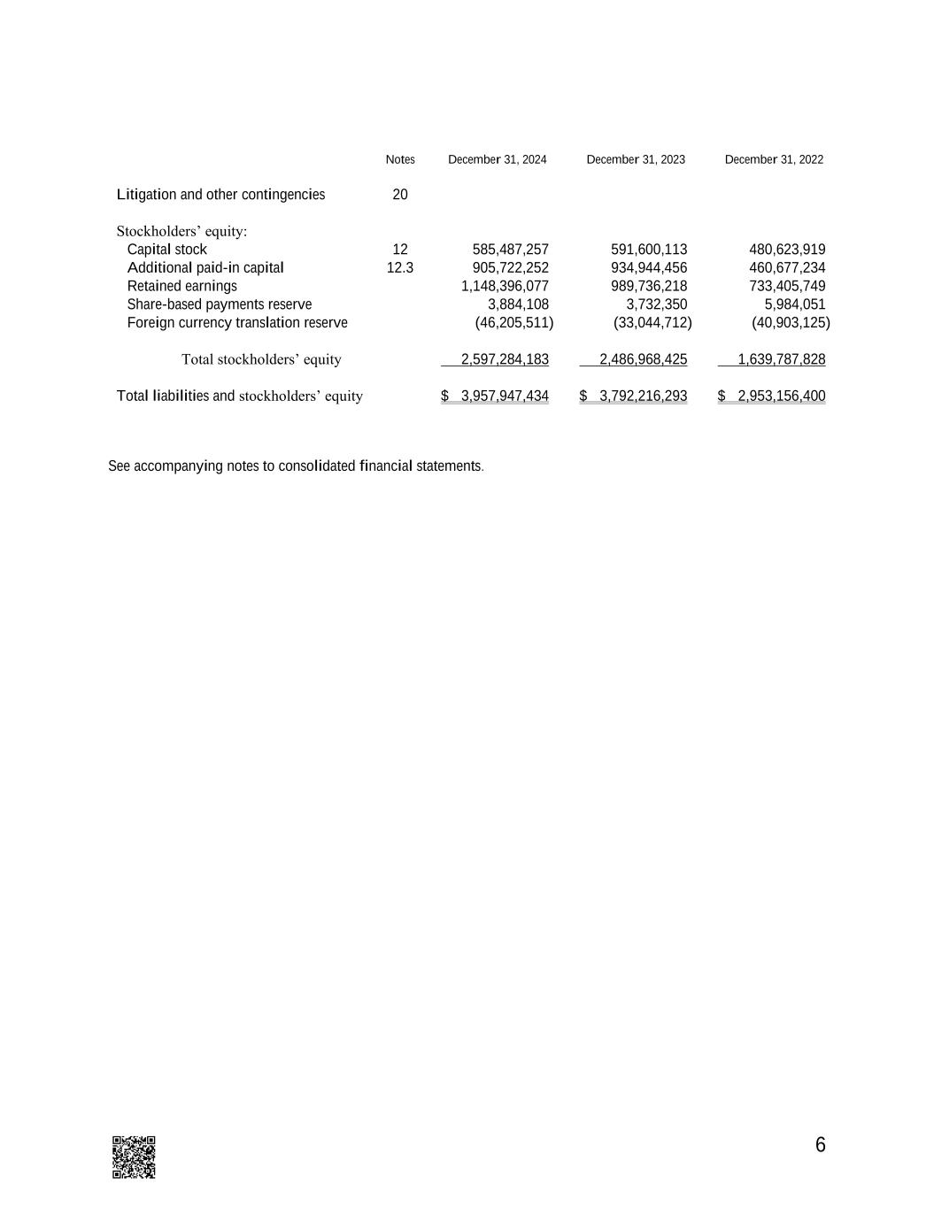 6 Notes December 31, 2024 December 31, 2023 December 31, 2022 Litigation and other contingencies 20 Stockholders’ equity: Capital stock 12 585,487,257 591,600,113 480,623,919 Additional paid-in capital 12.3 905,722,252 934,944,456 460,677,234 Retained earnings 1,148,396,077 989,736,218 733,405,749 Share-based payments reserve 3,884,108 3,732,350 5,984,051 Foreign currency translation reserve (46,205,511) (33,044,712) (40,903,125) Total stockholders’ equity 2,597,284,183 2,486,968,425 1,639,787,828 Total liabilities and stockholders’ equity $ 3,957,947,434 $ 3,792,216,293 $ 2,953,156,400 See accompanying notes to consolidated financial statements.