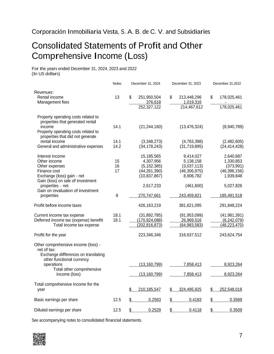 7 Corporación Inmobiliaria Vesta, S. A. B. de C. V. and Subsidiaries Consolidated Statements of Profit and Other Comprehensive Income (Loss) For the years ended December 31, 2024, 2023 and 2022 (In US dollars) Notes December 31, 2024 December 31, 2023 December 31,2022 Revenues: Rental income 13 $ 251,950,504 $ 213,448,296 $ 178,025,461 Management fees 376,618 1,019,316 - 252,327,122 214,467,612 178,025,461 Property operating costs related to properties that generated rental income 14.1 (21,244,160) (13,476,324) (8,940,789) Property operating costs related to properties that did not generate rental income 14.1 (3,348,273) (4,763,398) (2,482,605) General and administrative expenses 14.2 (34,178,243) (31,719,895) (24,414,428) Interest income 15,185,565 9,414,027 2,640,687 Other income 15 4,307,956 5,138,158 1,330,853 Other expenses 16 (5,152,385) (3,037,113) (373,991) Finance cost 17 (44,261,390) (46,306,975) (46,396,156) Exchange (loss) gain - net (10,837,867) 8,906,782 1,939,848 Gain (loss) on sale of investment properties – net 2,617,233 (461,600) 5,027,826 Gain on revaluation of investment properties 8 270,747,661 243,459,821 185,491,518 Profit before income taxes 426,163,219 381,621,095 291,848,224 Current income tax expense 18.1 (31,892,785) (91,953,099) (41,981,391) Deferred income tax (expense) benefit 18.1 (170,924,088) 26,969,516 (6,242,079) Total income tax expense (202,816,873) (64,983,583) (48,223,470) Profit for the year 223,346,346 316,637,512 243,624,754 Other comprehensive income (loss) - net of tax: Exchange differences on translating other functional currency operations (13,160,799) 7,858,413 8,923,264 Total other comprehensive income (loss) (13,160,799) 7,858,413 8,923,264 Total comprehensive income for the year $ 210,185,547 $ 324,495,925 $ 252,548,018 Basic earnings per share 12.5 $ 0.2563 $ 0.4183 $ 0.3569 Diluted earnings per share 12.5 $ 0.2529 $ 0.4118 $ 0.3509 See accompanying notes to consolidated financial statements.