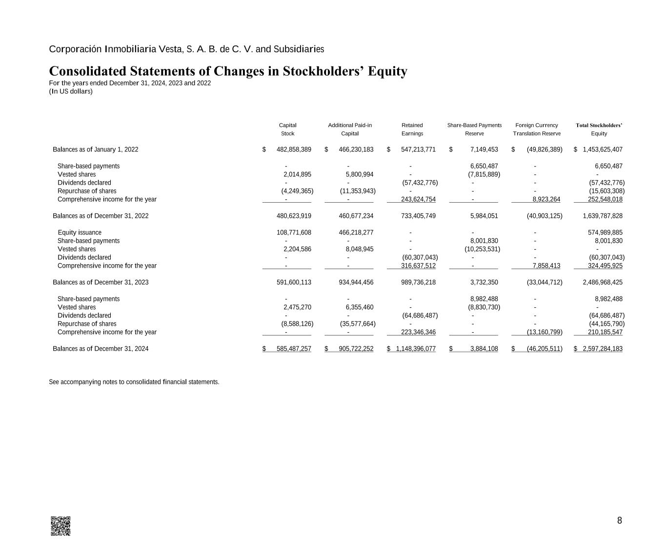 8 Corporación Inmobiliaria Vesta, S. A. B. de C. V. and Subsidiaries Consolidated Statements of Changes in Stockholders’ Equity For the years ended December 31, 2024, 2023 and 2022 (In US dollars) Capital Stock Additional Paid-in Capital Retained Earnings Share-Based Payments Reserve Foreign Currency Translation Reserve Total Stockholders’ Equity Balances as of January 1, 2022 $ 482,858,389 $ 466,230,183 $ 547,213,771 $ 7,149,453 $ (49,826,389) $ 1,453,625,407 Share-based payments - - - 6,650,487 - 6,650,487 Vested shares 2,014,895 5,800,994 - (7,815,889) - - Dividends declared - - (57,432,776) - - (57,432,776) Repurchase of shares (4,249,365) (11,353,943) - - - (15,603,308) Comprehensive income for the year - - 243,624,754 - 8,923,264 252,548,018 Balances as of December 31, 2022 480,623,919 460,677,234 733,405,749 5,984,051 (40,903,125) 1,639,787,828 Equity issuance 108,771,608 466,218,277 - - - 574,989,885 Share-based payments - - - 8,001,830 - 8,001,830 Vested shares 2,204,586 8,048,945 - (10,253,531) - - Dividends declared - - (60,307,043) - - (60,307,043) Comprehensive income for the year - - 316,637,512 - 7,858,413 324,495,925 Balances as of December 31, 2023 591,600,113 934,944,456 989,736,218 3,732,350 (33,044,712) 2,486,968,425 Share-based payments - - - 8,982,488 - 8,982,488 Vested shares 2,475,270 6,355,460 - (8,830,730) - - Dividends declared - - (64,686,487) - - (64,686,487) Repurchase of shares (8,588,126) (35,577,664) - - - (44,165,790) Comprehensive income for the year - - 223,346,346 - (13,160,799) 210,185,547 Balances as of December 31, 2024 $ 585,487,257 $ 905,722,252 $ 1,148,396,077 $ 3,884,108 $ (46,205,511) $ 2,597,284,183 See accompanying notes to consolidated financial statements.