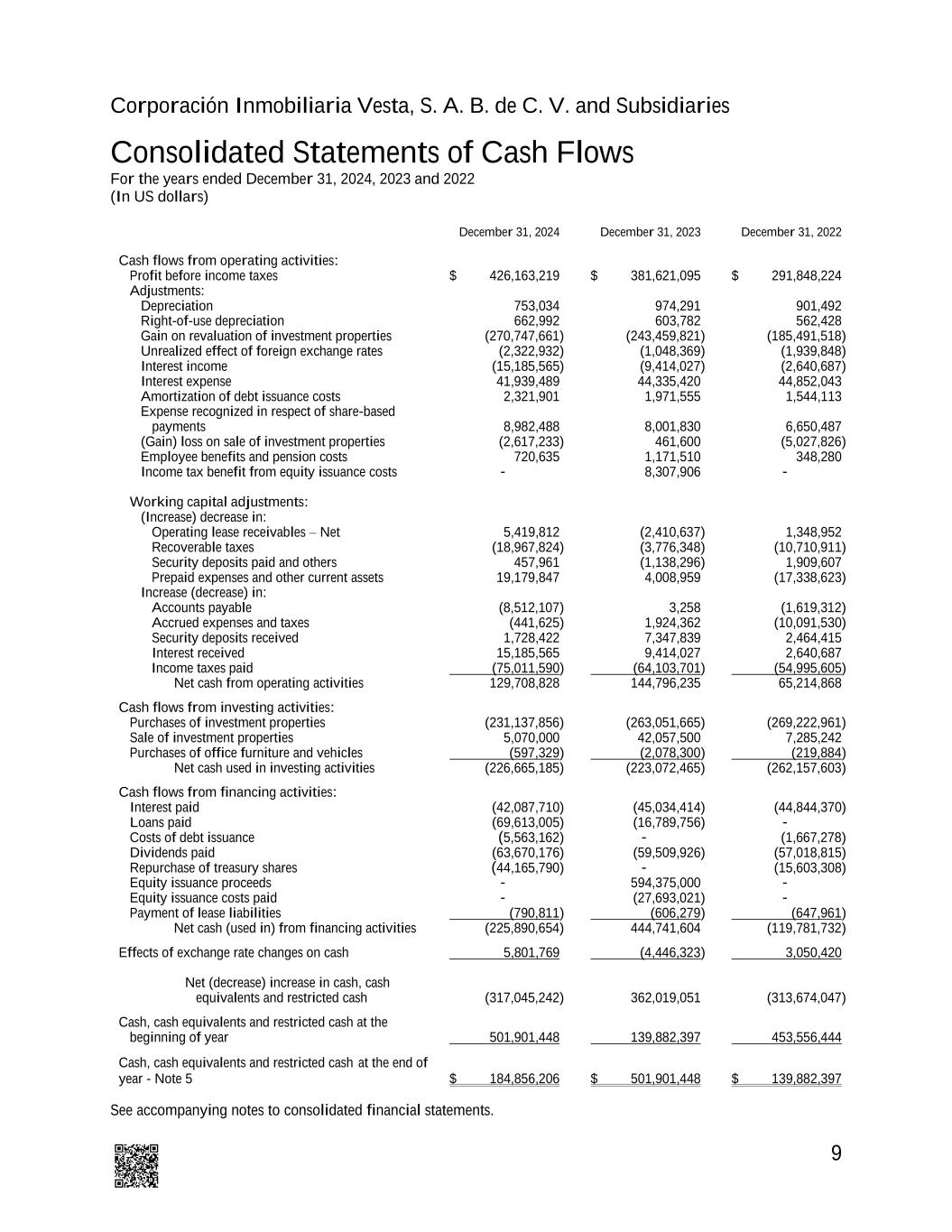 9 Corporación Inmobiliaria Vesta, S. A. B. de C. V. and Subsidiaries Consolidated Statements of Cash Flows For the years ended December 31, 2024, 2023 and 2022 (In US dollars) December 31, 2024 December 31, 2023 December 31, 2022 Cash flows from operating activities: Profit before income taxes $ 426,163,219 $ 381,621,095 $ 291,848,224 Adjustments: Depreciation 753,034 974,291 901,492 Right-of-use depreciation 662,992 603,782 562,428 Gain on revaluation of investment properties (270,747,661) (243,459,821) (185,491,518) Unrealized effect of foreign exchange rates (2,322,932) (1,048,369) (1,939,848) Interest income (15,185,565) (9,414,027) (2,640,687) Interest expense 41,939,489 44,335,420 44,852,043 Amortization of debt issuance costs 2,321,901 1,971,555 1,544,113 Expense recognized in respect of share-based payments 8,982,488 8,001,830 6,650,487 (Gain) loss on sale of investment properties (2,617,233) 461,600 (5,027,826) Employee benefits and pension costs 720,635 1,171,510 348,280 Income tax benefit from equity issuance costs - 8,307,906 - Working capital adjustments: (Increase) decrease in: Operating lease receivables – Net 5,419,812 (2,410,637) 1,348,952 Recoverable taxes (18,967,824) (3,776,348) (10,710,911) Security deposits paid and others 457,961 (1,138,296) 1,909,607 Prepaid expenses and other current assets 19,179,847 4,008,959 (17,338,623) Increase (decrease) in: Accounts payable (8,512,107) 3,258 (1,619,312) Accrued expenses and taxes (441,625) 1,924,362 (10,091,530) Security deposits received 1,728,422 7,347,839 2,464,415 Interest received 15,185,565 9,414,027 2,640,687 Income taxes paid (75,011,590) (64,103,701) (54,995,605) Net cash from operating activities 129,708,828 144,796,235 65,214,868 Cash flows from investing activities: Purchases of investment properties (231,137,856) (263,051,665) (269,222,961) Sale of investment properties 5,070,000 42,057,500 7,285,242 Purchases of office furniture and vehicles (597,329) (2,078,300) (219,884) Net cash used in investing activities (226,665,185) (223,072,465) (262,157,603) Cash flows from financing activities: Interest paid (42,087,710) (45,034,414) (44,844,370) Loans paid (69,613,005) (16,789,756) - Costs of debt issuance (5,563,162) - (1,667,278) Dividends paid (63,670,176) (59,509,926) (57,018,815) Repurchase of treasury shares (44,165,790) - (15,603,308) Equity issuance proceeds - 594,375,000 - Equity issuance costs paid - (27,693,021) - Payment of lease liabilities (790,811) (606,279) (647,961) Net cash (used in) from financing activities (225,890,654) 444,741,604 (119,781,732) Effects of exchange rate changes on cash 5,801,769 (4,446,323) 3,050,420 Net (decrease) increase in cash, cash equivalents and restricted cash (317,045,242) 362,019,051 (313,674,047) Cash, cash equivalents and restricted cash at the beginning of year 501,901,448 139,882,397 453,556,444 Cash, cash equivalents and restricted cash at the end of year - Note 5 $ 184,856,206 $ 501,901,448 $ 139,882,397 See accompanying notes to consolidated financial statements.