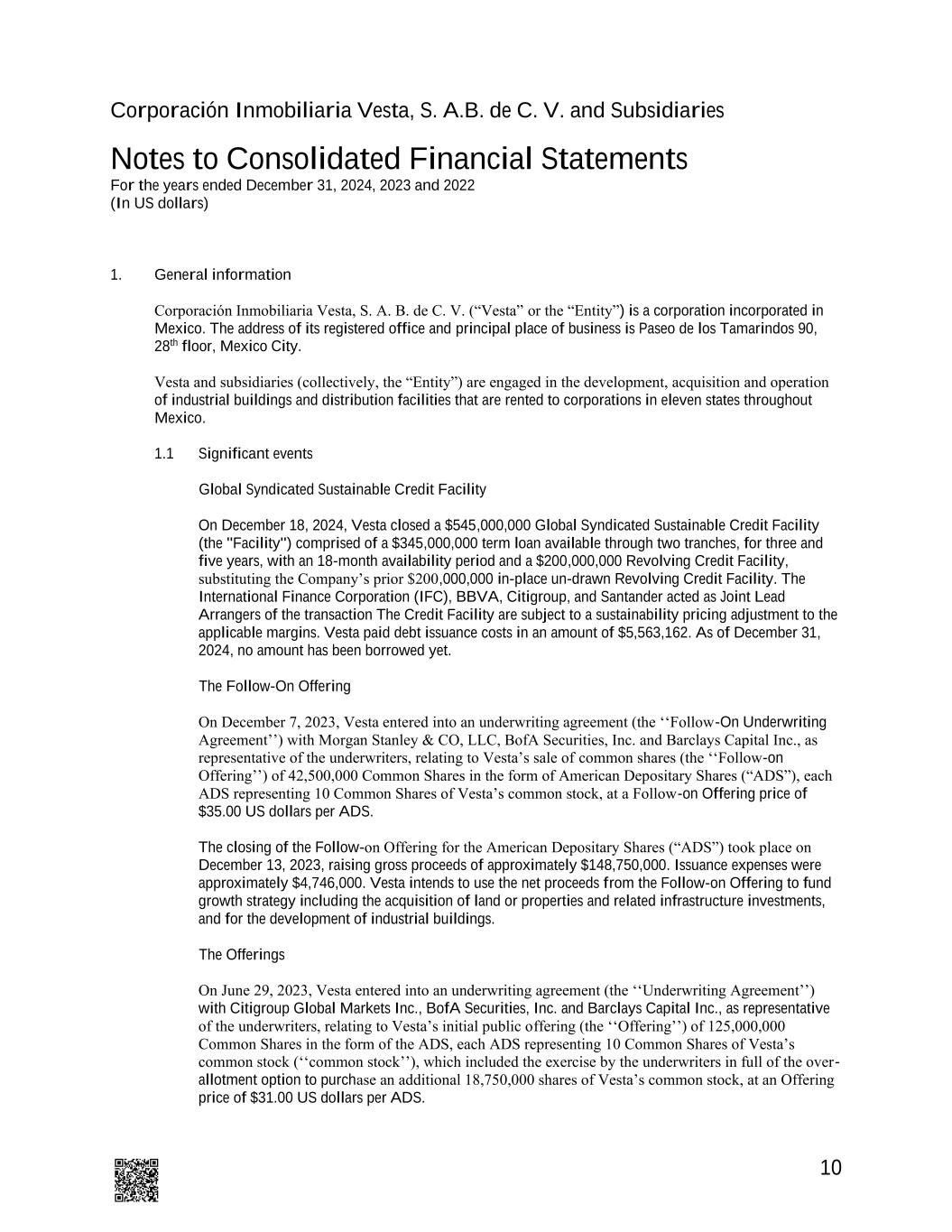 10 Corporación Inmobiliaria Vesta, S. A.B. de C. V. and Subsidiaries Notes to Consolidated Financial Statements For the years ended December 31, 2024, 2023 and 2022 (In US dollars) 1. General information Corporación Inmobiliaria Vesta, S. A. B. de C. V. (“Vesta” or the “Entity”) is a corporation incorporated in Mexico. The address of its registered office and principal place of business is Paseo de los Tamarindos 90, 28th floor, Mexico City. Vesta and subsidiaries (collectively, the “Entity”) are engaged in the development, acquisition and operation of industrial buildings and distribution facilities that are rented to corporations in eleven states throughout Mexico. 1.1 Significant events Global Syndicated Sustainable Credit Facility On December 18, 2024, Vesta closed a $545,000,000 Global Syndicated Sustainable Credit Facility (the "Facility") comprised of a $345,000,000 term loan available through two tranches, for three and five years, with an 18-month availability period and a $200,000,000 Revolving Credit Facility, substituting the Company’s prior $200,000,000 in-place un-drawn Revolving Credit Facility. The International Finance Corporation (IFC), BBVA, Citigroup, and Santander acted as Joint Lead Arrangers of the transaction The Credit Facility are subject to a sustainability pricing adjustment to the applicable margins. Vesta paid debt issuance costs in an amount of $5,563,162. As of December 31, 2024, no amount has been borrowed yet. The Follow-On Offering On December 7, 2023, Vesta entered into an underwriting agreement (the ‘‘Follow-On Underwriting Agreement’’) with Morgan Stanley & CO, LLC, BofA Securities, Inc. and Barclays Capital Inc., as representative of the underwriters, relating to Vesta’s sale of common shares (the ‘‘Follow-on Offering’’) of 42,500,000 Common Shares in the form of American Depositary Shares (“ADS”), each ADS representing 10 Common Shares of Vesta’s common stock, at a Follow-on Offering price of $35.00 US dollars per ADS. The closing of the Follow-on Offering for the American Depositary Shares (“ADS”) took place on December 13, 2023, raising gross proceeds of approximately $148,750,000. Issuance expenses were approximately $4,746,000. Vesta intends to use the net proceeds from the Follow-on Offering to fund growth strategy including the acquisition of land or properties and related infrastructure investments, and for the development of industrial buildings. The Offerings On June 29, 2023, Vesta entered into an underwriting agreement (the ‘‘Underwriting Agreement’’) with Citigroup Global Markets Inc., BofA Securities, Inc. and Barclays Capital Inc., as representative of the underwriters, relating to Vesta’s initial public offering (the ‘‘Offering’’) of 125,000,000 Common Shares in the form of the ADS, each ADS representing 10 Common Shares of Vesta’s common stock (‘‘common stock’’), which included the exercise by the underwriters in full of the over- allotment option to purchase an additional 18,750,000 shares of Vesta’s common stock, at an Offering price of $31.00 US dollars per ADS.