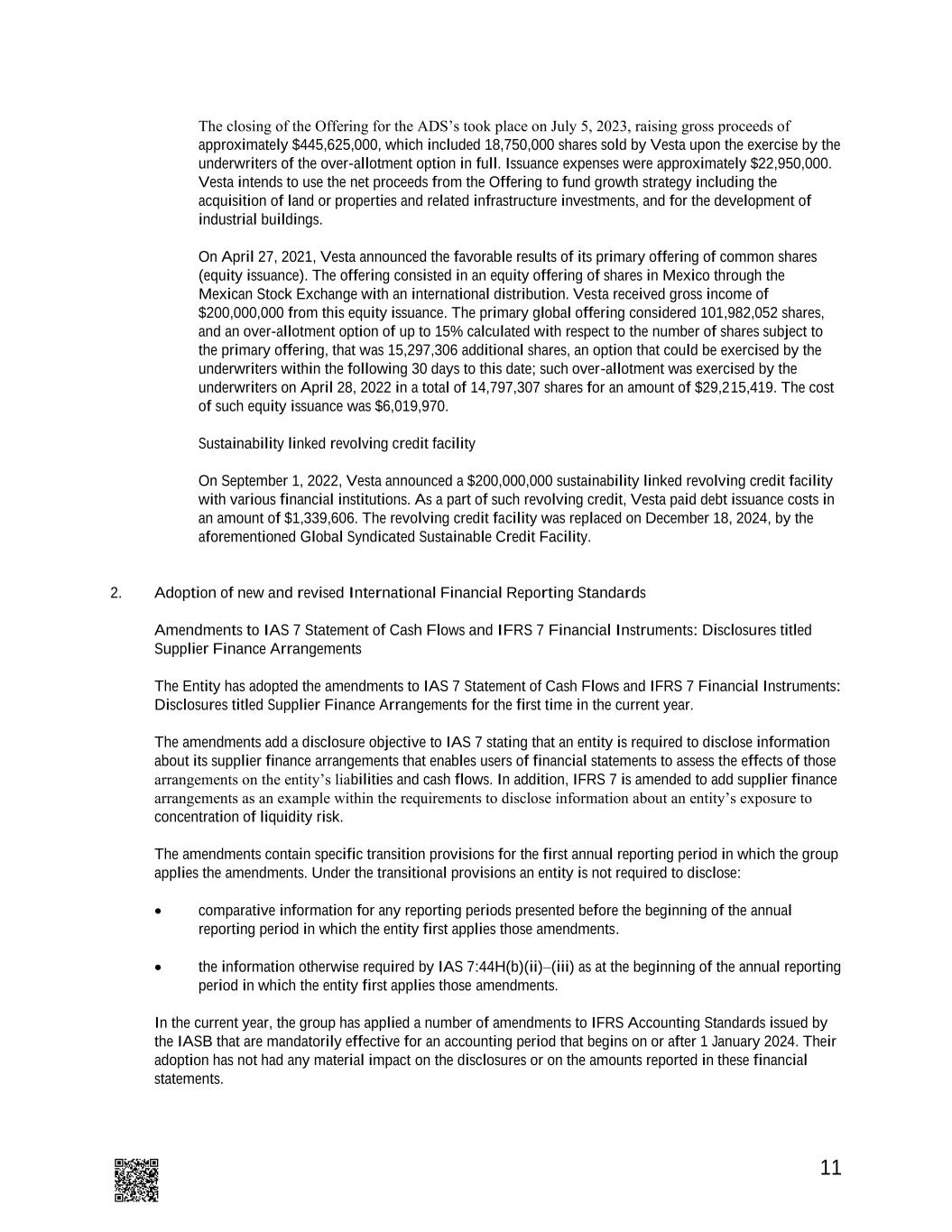 11 The closing of the Offering for the ADS’s took place on July 5, 2023, raising gross proceeds of approximately $445,625,000, which included 18,750,000 shares sold by Vesta upon the exercise by the underwriters of the over-allotment option in full. Issuance expenses were approximately $22,950,000. Vesta intends to use the net proceeds from the Offering to fund growth strategy including the acquisition of land or properties and related infrastructure investments, and for the development of industrial buildings. On April 27, 2021, Vesta announced the favorable results of its primary offering of common shares (equity issuance). The offering consisted in an equity offering of shares in Mexico through the Mexican Stock Exchange with an international distribution. Vesta received gross income of $200,000,000 from this equity issuance. The primary global offering considered 101,982,052 shares, and an over-allotment option of up to 15% calculated with respect to the number of shares subject to the primary offering, that was 15,297,306 additional shares, an option that could be exercised by the underwriters within the following 30 days to this date; such over-allotment was exercised by the underwriters on April 28, 2022 in a total of 14,797,307 shares for an amount of $29,215,419. The cost of such equity issuance was $6,019,970. Sustainability linked revolving credit facility On September 1, 2022, Vesta announced a $200,000,000 sustainability linked revolving credit facility with various financial institutions. As a part of such revolving credit, Vesta paid debt issuance costs in an amount of $1,339,606. The revolving credit facility was replaced on December 18, 2024, by the aforementioned Global Syndicated Sustainable Credit Facility. 2. Adoption of new and revised International Financial Reporting Standards Amendments to IAS 7 Statement of Cash Flows and IFRS 7 Financial Instruments: Disclosures titled Supplier Finance Arrangements The Entity has adopted the amendments to IAS 7 Statement of Cash Flows and IFRS 7 Financial Instruments: Disclosures titled Supplier Finance Arrangements for the first time in the current year. The amendments add a disclosure objective to IAS 7 stating that an entity is required to disclose information about its supplier finance arrangements that enables users of financial statements to assess the effects of those arrangements on the entity’s liabilities and cash flows. In addition, IFRS 7 is amended to add supplier finance arrangements as an example within the requirements to disclose information about an entity’s exposure to concentration of liquidity risk. The amendments contain specific transition provisions for the first annual reporting period in which the group applies the amendments. Under the transitional provisions an entity is not required to disclose: • comparative information for any reporting periods presented before the beginning of the annual reporting period in which the entity first applies those amendments. • the information otherwise required by IAS 7:44H(b)(ii)–(iii) as at the beginning of the annual reporting period in which the entity first applies those amendments. In the current year, the group has applied a number of amendments to IFRS Accounting Standards issued by the IASB that are mandatorily effective for an accounting period that begins on or after 1 January 2024. Their adoption has not had any material impact on the disclosures or on the amounts reported in these financial statements.