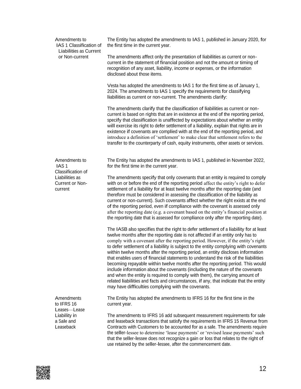 12 Amendments to IAS 1 Classification of Liabilities as Current or Non-current The Entity has adopted the amendments to IAS 1, published in January 2020, for the first time in the current year. The amendments affect only the presentation of liabilities as current or non- current in the statement of financial position and not the amount or timing of recognition of any asset, liability, income or expenses, or the information disclosed about those items. Vesta has adopted the amendments to IAS 1 for the first time as of January 1, 2024. The amendments to IAS 1 specify the requirements for classifying liabilities as current or non-current. The amendments clarify: The amendments clarify that the classification of liabilities as current or non- current is based on rights that are in existence at the end of the reporting period, specify that classification is unaffected by expectations about whether an entity will exercise its right to defer settlement of a liability, explain that rights are in existence if covenants are complied with at the end of the reporting period, and introduce a definition of ‘settlement’ to make clear that settlement refers to the transfer to the counterparty of cash, equity instruments, other assets or services. Amendments to IAS 1 Classification of Liabilities as Current or Non- current The Entity has adopted the amendments to IAS 1, published in November 2022, for the first time in the current year. The amendments specify that only covenants that an entity is required to comply with on or before the end of the reporting period affect the entity’s right to defer settlement of a liability for at least twelve months after the reporting date (and therefore must be considered in assessing the classification of the liability as current or non-current). Such covenants affect whether the right exists at the end of the reporting period, even if compliance with the covenant is assessed only after the reporting date (e.g. a covenant based on the entity’s financial position at the reporting date that is assessed for compliance only after the reporting date). The IASB also specifies that the right to defer settlement of a liability for at least twelve months after the reporting date is not affected if an entity only has to comply with a covenant after the reporting period. However, if the entity’s right to defer settlement of a liability is subject to the entity complying with covenants within twelve months after the reporting period, an entity discloses information that enables users of financial statements to understand the risk of the liabilities becoming repayable within twelve months after the reporting period. This would include information about the covenants (including the nature of the covenants and when the entity is required to comply with them), the carrying amount of related liabilities and facts and circumstances, if any, that indicate that the entity may have difficulties complying with the covenants. Amendments to IFRS 16 Leases—Lease Liability in a Sale and Leaseback The Entity has adopted the amendments to IFRS 16 for the first time in the current year. The amendments to IFRS 16 add subsequent measurement requirements for sale and leaseback transactions that satisfy the requirements in IFRS 15 Revenue from Contracts with Customers to be accounted for as a sale. The amendments require the seller-lessee to determine ‘lease payments’ or ‘revised lease payments’ such that the seller-lessee does not recognize a gain or loss that relates to the right of use retained by the seller-lessee, after the commencement date.