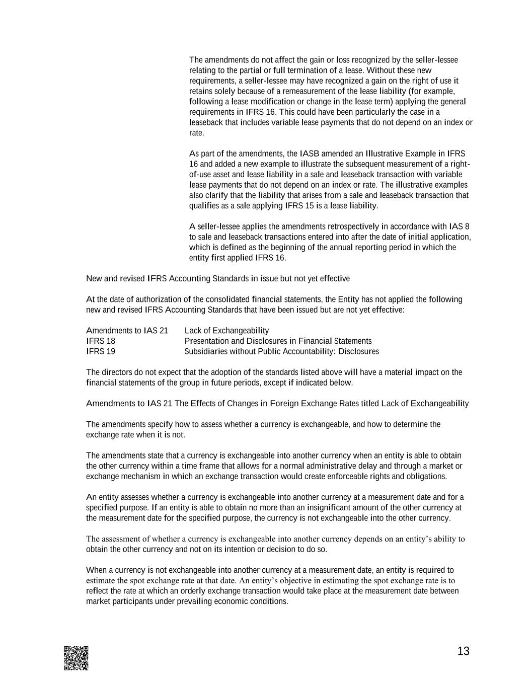 13 The amendments do not affect the gain or loss recognized by the seller-lessee relating to the partial or full termination of a lease. Without these new requirements, a seller-lessee may have recognized a gain on the right of use it retains solely because of a remeasurement of the lease liability (for example, following a lease modification or change in the lease term) applying the general requirements in IFRS 16. This could have been particularly the case in a leaseback that includes variable lease payments that do not depend on an index or rate. As part of the amendments, the IASB amended an Illustrative Example in IFRS 16 and added a new example to illustrate the subsequent measurement of a right- of-use asset and lease liability in a sale and leaseback transaction with variable lease payments that do not depend on an index or rate. The illustrative examples also clarify that the liability that arises from a sale and leaseback transaction that qualifies as a sale applying IFRS 15 is a lease liability. A seller-lessee applies the amendments retrospectively in accordance with IAS 8 to sale and leaseback transactions entered into after the date of initial application, which is defined as the beginning of the annual reporting period in which the entity first applied IFRS 16. New and revised IFRS Accounting Standards in issue but not yet effective At the date of authorization of the consolidated financial statements, the Entity has not applied the following new and revised IFRS Accounting Standards that have been issued but are not yet effective: Amendments to IAS 21 Lack of Exchangeability IFRS 18 Presentation and Disclosures in Financial Statements IFRS 19 Subsidiaries without Public Accountability: Disclosures The directors do not expect that the adoption of the standards listed above will have a material impact on the financial statements of the group in future periods, except if indicated below. Amendments to IAS 21 The Effects of Changes in Foreign Exchange Rates titled Lack of Exchangeability The amendments specify how to assess whether a currency is exchangeable, and how to determine the exchange rate when it is not. The amendments state that a currency is exchangeable into another currency when an entity is able to obtain the other currency within a time frame that allows for a normal administrative delay and through a market or exchange mechanism in which an exchange transaction would create enforceable rights and obligations. An entity assesses whether a currency is exchangeable into another currency at a measurement date and for a specified purpose. If an entity is able to obtain no more than an insignificant amount of the other currency at the measurement date for the specified purpose, the currency is not exchangeable into the other currency. The assessment of whether a currency is exchangeable into another currency depends on an entity’s ability to obtain the other currency and not on its intention or decision to do so. When a currency is not exchangeable into another currency at a measurement date, an entity is required to estimate the spot exchange rate at that date. An entity’s objective in estimating the spot exchange rate is to reflect the rate at which an orderly exchange transaction would take place at the measurement date between market participants under prevailing economic conditions.