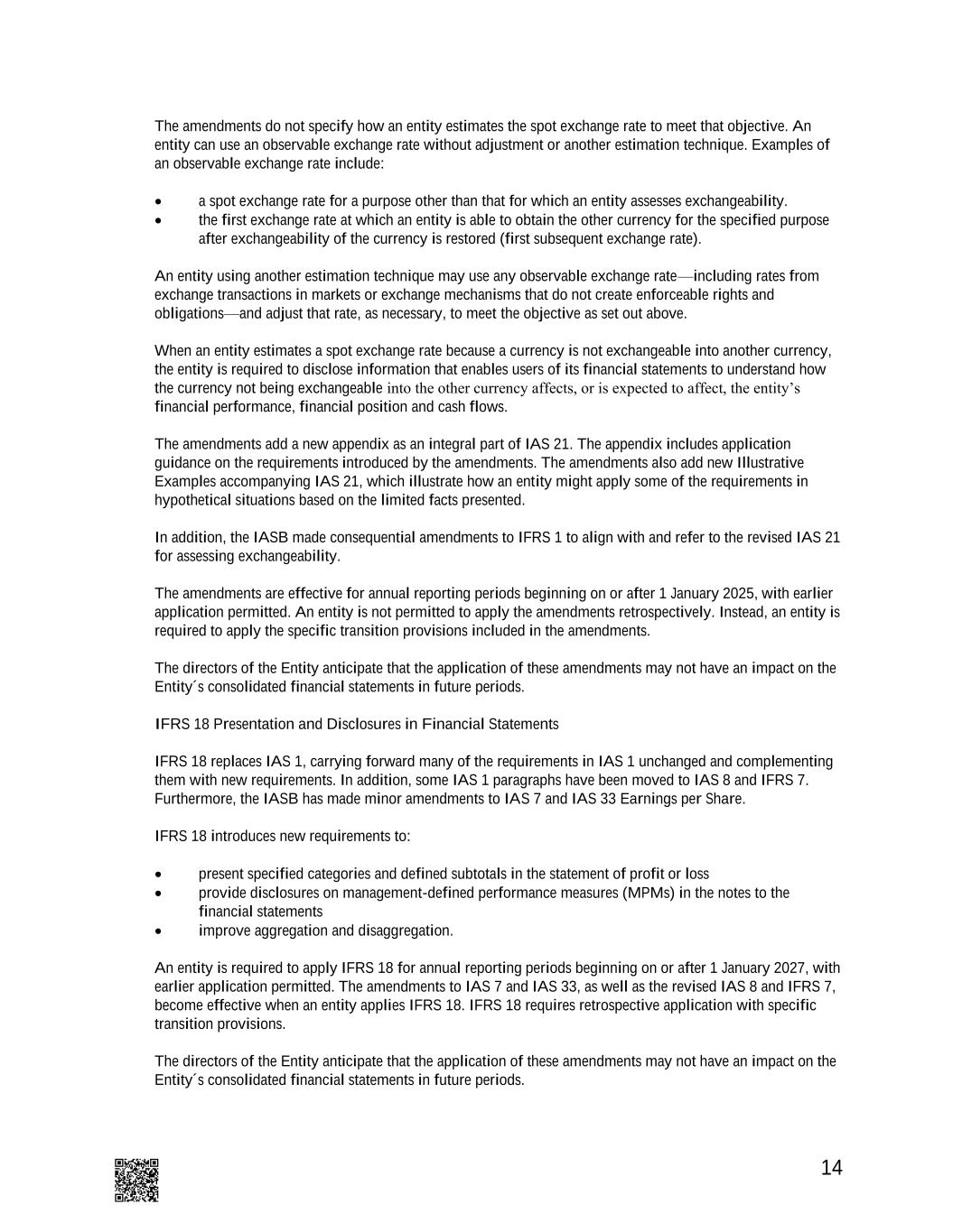 14 The amendments do not specify how an entity estimates the spot exchange rate to meet that objective. An entity can use an observable exchange rate without adjustment or another estimation technique. Examples of an observable exchange rate include: • a spot exchange rate for a purpose other than that for which an entity assesses exchangeability. • the first exchange rate at which an entity is able to obtain the other currency for the specified purpose after exchangeability of the currency is restored (first subsequent exchange rate). An entity using another estimation technique may use any observable exchange rate—including rates from exchange transactions in markets or exchange mechanisms that do not create enforceable rights and obligations—and adjust that rate, as necessary, to meet the objective as set out above. When an entity estimates a spot exchange rate because a currency is not exchangeable into another currency, the entity is required to disclose information that enables users of its financial statements to understand how the currency not being exchangeable into the other currency affects, or is expected to affect, the entity’s financial performance, financial position and cash flows. The amendments add a new appendix as an integral part of IAS 21. The appendix includes application guidance on the requirements introduced by the amendments. The amendments also add new Illustrative Examples accompanying IAS 21, which illustrate how an entity might apply some of the requirements in hypothetical situations based on the limited facts presented. In addition, the IASB made consequential amendments to IFRS 1 to align with and refer to the revised IAS 21 for assessing exchangeability. The amendments are effective for annual reporting periods beginning on or after 1 January 2025, with earlier application permitted. An entity is not permitted to apply the amendments retrospectively. Instead, an entity is required to apply the specific transition provisions included in the amendments. The directors of the Entity anticipate that the application of these amendments may not have an impact on the Entity´s consolidated financial statements in future periods. IFRS 18 Presentation and Disclosures in Financial Statements IFRS 18 replaces IAS 1, carrying forward many of the requirements in IAS 1 unchanged and complementing them with new requirements. In addition, some IAS 1 paragraphs have been moved to IAS 8 and IFRS 7. Furthermore, the IASB has made minor amendments to IAS 7 and IAS 33 Earnings per Share. IFRS 18 introduces new requirements to: • present specified categories and defined subtotals in the statement of profit or loss • provide disclosures on management-defined performance measures (MPMs) in the notes to the financial statements • improve aggregation and disaggregation. An entity is required to apply IFRS 18 for annual reporting periods beginning on or after 1 January 2027, with earlier application permitted. The amendments to IAS 7 and IAS 33, as well as the revised IAS 8 and IFRS 7, become effective when an entity applies IFRS 18. IFRS 18 requires retrospective application with specific transition provisions. The directors of the Entity anticipate that the application of these amendments may not have an impact on the Entity´s consolidated financial statements in future periods.