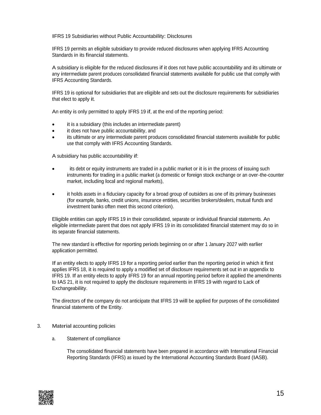 15 IFRS 19 Subsidiaries without Public Accountability: Disclosures IFRS 19 permits an eligible subsidiary to provide reduced disclosures when applying IFRS Accounting Standards in its financial statements. A subsidiary is eligible for the reduced disclosures if it does not have public accountability and its ultimate or any intermediate parent produces consolidated financial statements available for public use that comply with IFRS Accounting Standards. IFRS 19 is optional for subsidiaries that are eligible and sets out the disclosure requirements for subsidiaries that elect to apply it. An entity is only permitted to apply IFRS 19 if, at the end of the reporting period: • it is a subsidiary (this includes an intermediate parent) • it does not have public accountability, and • its ultimate or any intermediate parent produces consolidated financial statements available for public use that comply with IFRS Accounting Standards. A subsidiary has public accountability if: • its debt or equity instruments are traded in a public market or it is in the process of issuing such instruments for trading in a public market (a domestic or foreign stock exchange or an over-the-counter market, including local and regional markets), • it holds assets in a fiduciary capacity for a broad group of outsiders as one of its primary businesses (for example, banks, credit unions, insurance entities, securities brokers/dealers, mutual funds and investment banks often meet this second criterion). Eligible entities can apply IFRS 19 in their consolidated, separate or individual financial statements. An eligible intermediate parent that does not apply IFRS 19 in its consolidated financial statement may do so in its separate financial statements. The new standard is effective for reporting periods beginning on or after 1 January 2027 with earlier application permitted. If an entity elects to apply IFRS 19 for a reporting period earlier than the reporting period in which it first applies IFRS 18, it is required to apply a modified set of disclosure requirements set out in an appendix to IFRS 19. If an entity elects to apply IFRS 19 for an annual reporting period before it applied the amendments to IAS 21, it is not required to apply the disclosure requirements in IFRS 19 with regard to Lack of Exchangeability. The directors of the company do not anticipate that IFRS 19 will be applied for purposes of the consolidated financial statements of the Entity. 3. Material accounting policies a. Statement of compliance The consolidated financial statements have been prepared in accordance with International Financial Reporting Standards (IFRS) as issued by the International Accounting Standards Board (IASB).