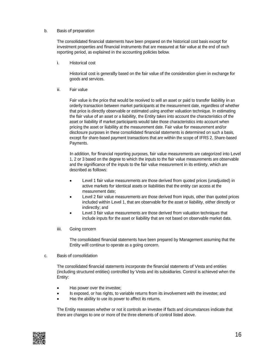 16 b. Basis of preparation The consolidated financial statements have been prepared on the historical cost basis except for investment properties and financial instruments that are measured at fair value at the end of each reporting period, as explained in the accounting policies below. i. Historical cost Historical cost is generally based on the fair value of the consideration given in exchange for goods and services. ii. Fair value Fair value is the price that would be received to sell an asset or paid to transfer liability in an orderly transaction between market participants at the measurement date, regardless of whether that price is directly observable or estimated using another valuation technique. In estimating the fair value of an asset or a liability, the Entity takes into account the characteristics of the asset or liability if market participants would take those characteristics into account when pricing the asset or liability at the measurement date. Fair value for measurement and/or disclosure purposes in these consolidated financial statements is determined on such a basis, except for share-based payment transactions that are within the scope of IFRS 2, Share-based Payments. In addition, for financial reporting purposes, fair value measurements are categorized into Level 1, 2 or 3 based on the degree to which the inputs to the fair value measurements are observable and the significance of the inputs to the fair value measurement in its entirety, which are described as follows: • Level 1 fair value measurements are those derived from quoted prices (unadjusted) in active markets for identical assets or liabilities that the entity can access at the measurement date; • Level 2 fair value measurements are those derived from inputs, other than quoted prices included within Level 1, that are observable for the asset or liability, either directly or indirectly; and • Level 3 fair value measurements are those derived from valuation techniques that include inputs for the asset or liability that are not based on observable market data. iii. Going concern The consolidated financial statements have been prepared by Management assuming that the Entity will continue to operate as a going concern. c. Basis of consolidation The consolidated financial statements incorporate the financial statements of Vesta and entities (including structured entities) controlled by Vesta and its subsidiaries. Control is achieved when the Entity: • Has power over the investee; • Is exposed, or has rights, to variable returns from its involvement with the investee; and • Has the ability to use its power to affect its returns. The Entity reassesses whether or not it controls an investee if facts and circumstances indicate that there are changes to one or more of the three elements of control listed above.