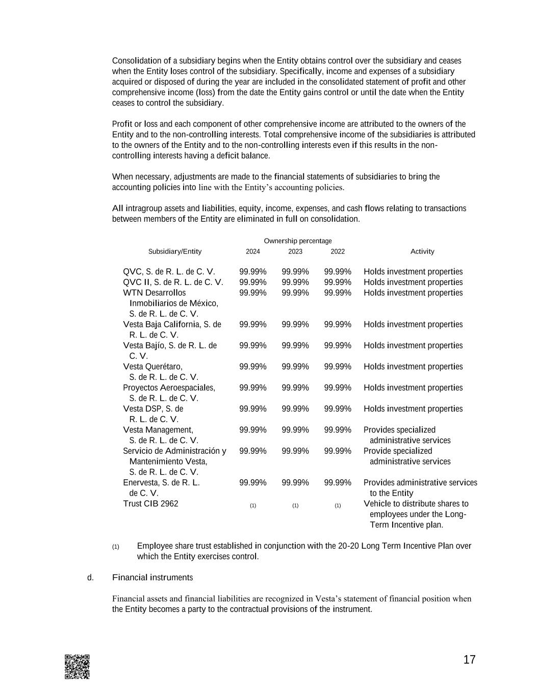 17 Consolidation of a subsidiary begins when the Entity obtains control over the subsidiary and ceases when the Entity loses control of the subsidiary. Specifically, income and expenses of a subsidiary acquired or disposed of during the year are included in the consolidated statement of profit and other comprehensive income (loss) from the date the Entity gains control or until the date when the Entity ceases to control the subsidiary. Profit or loss and each component of other comprehensive income are attributed to the owners of the Entity and to the non-controlling interests. Total comprehensive income of the subsidiaries is attributed to the owners of the Entity and to the non-controlling interests even if this results in the non- controlling interests having a deficit balance. When necessary, adjustments are made to the financial statements of subsidiaries to bring the accounting policies into line with the Entity’s accounting policies. All intragroup assets and liabilities, equity, income, expenses, and cash flows relating to transactions between members of the Entity are eliminated in full on consolidation. Ownership percentage Subsidiary/Entity 2024 2023 2022 Activity QVC, S. de R. L. de C. V. 99.99% 99.99% 99.99% Holds investment properties QVC II, S. de R. L. de C. V. 99.99% 99.99% 99.99% Holds investment properties WTN Desarrollos Inmobiliarios de México, S. de R. L. de C. V. 99.99% 99.99% 99.99% Holds investment properties Vesta Baja California, S. de R. L. de C. V. 99.99% 99.99% 99.99% Holds investment properties Vesta Bajío, S. de R. L. de C. V. 99.99% 99.99% 99.99% Holds investment properties Vesta Querétaro, S. de R. L. de C. V. 99.99% 99.99% 99.99% Holds investment properties Proyectos Aeroespaciales, S. de R. L. de C. V. 99.99% 99.99% 99.99% Holds investment properties Vesta DSP, S. de R. L. de C. V. 99.99% 99.99% 99.99% Holds investment properties Vesta Management, S. de R. L. de C. V. 99.99% 99.99% 99.99% Provides specialized administrative services Servicio de Administración y Mantenimiento Vesta, S. de R. L. de C. V. 99.99% 99.99% 99.99% Provide specialized administrative services Enervesta, S. de R. L. de C. V. 99.99% 99.99% 99.99% Provides administrative services to the Entity Trust CIB 2962 (1) (1) (1) Vehicle to distribute shares to employees under the Long- Term Incentive plan. (1) Employee share trust established in conjunction with the 20-20 Long Term Incentive Plan over which the Entity exercises control. d. Financial instruments Financial assets and financial liabilities are recognized in Vesta’s statement of financial position when the Entity becomes a party to the contractual provisions of the instrument.