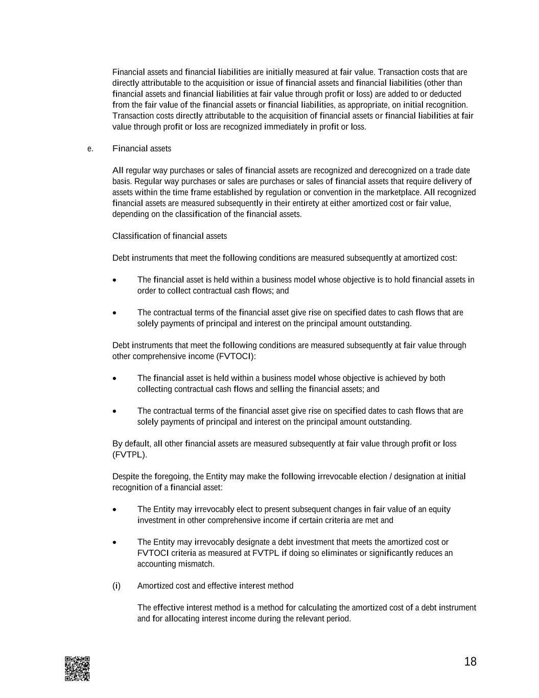 18 Financial assets and financial liabilities are initially measured at fair value. Transaction costs that are directly attributable to the acquisition or issue of financial assets and financial liabilities (other than financial assets and financial liabilities at fair value through profit or loss) are added to or deducted from the fair value of the financial assets or financial liabilities, as appropriate, on initial recognition. Transaction costs directly attributable to the acquisition of financial assets or financial liabilities at fair value through profit or loss are recognized immediately in profit or loss. e. Financial assets All regular way purchases or sales of financial assets are recognized and derecognized on a trade date basis. Regular way purchases or sales are purchases or sales of financial assets that require delivery of assets within the time frame established by regulation or convention in the marketplace. All recognized financial assets are measured subsequently in their entirety at either amortized cost or fair value, depending on the classification of the financial assets. Classification of financial assets Debt instruments that meet the following conditions are measured subsequently at amortized cost: • The financial asset is held within a business model whose objective is to hold financial assets in order to collect contractual cash flows; and • The contractual terms of the financial asset give rise on specified dates to cash flows that are solely payments of principal and interest on the principal amount outstanding. Debt instruments that meet the following conditions are measured subsequently at fair value through other comprehensive income (FVTOCI): • The financial asset is held within a business model whose objective is achieved by both collecting contractual cash flows and selling the financial assets; and • The contractual terms of the financial asset give rise on specified dates to cash flows that are solely payments of principal and interest on the principal amount outstanding. By default, all other financial assets are measured subsequently at fair value through profit or loss (FVTPL). Despite the foregoing, the Entity may make the following irrevocable election / designation at initial recognition of a financial asset: • The Entity may irrevocably elect to present subsequent changes in fair value of an equity investment in other comprehensive income if certain criteria are met and • The Entity may irrevocably designate a debt investment that meets the amortized cost or FVTOCI criteria as measured at FVTPL if doing so eliminates or significantly reduces an accounting mismatch. (i) Amortized cost and effective interest method The effective interest method is a method for calculating the amortized cost of a debt instrument and for allocating interest income during the relevant period.