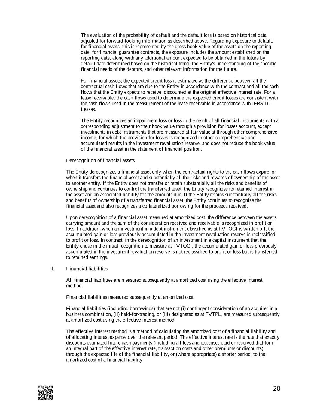 20 The evaluation of the probability of default and the default loss is based on historical data adjusted for forward-looking information as described above. Regarding exposure to default, for financial assets, this is represented by the gross book value of the assets on the reporting date; for financial guarantee contracts, the exposure includes the amount established on the reporting date, along with any additional amount expected to be obtained in the future by default date determined based on the historical trend, the Entity's understanding of the specific financial needs of the debtors, and other relevant information for the future. For financial assets, the expected credit loss is estimated as the difference between all the contractual cash flows that are due to the Entity in accordance with the contract and all the cash flows that the Entity expects to receive, discounted at the original effective interest rate. For a lease receivable, the cash flows used to determine the expected credit losses are consistent with the cash flows used in the measurement of the lease receivable in accordance with IFRS 16 Leases. The Entity recognizes an impairment loss or loss in the result of all financial instruments with a corresponding adjustment to their book value through a provision for losses account, except investments in debt instruments that are measured at fair value at through other comprehensive income, for which the provision for losses is recognized in other comprehensive and accumulated results in the investment revaluation reserve, and does not reduce the book value of the financial asset in the statement of financial position. Derecognition of financial assets The Entity derecognizes a financial asset only when the contractual rights to the cash flows expire, or when it transfers the financial asset and substantially all the risks and rewards of ownership of the asset to another entity. If the Entity does not transfer or retain substantially all the risks and benefits of ownership and continues to control the transferred asset, the Entity recognizes its retained interest in the asset and an associated liability for the amounts due. If the Entity retains substantially all the risks and benefits of ownership of a transferred financial asset, the Entity continues to recognize the financial asset and also recognizes a collateralized borrowing for the proceeds received. Upon derecognition of a financial asset measured at amortized cost, the difference between the asset's carrying amount and the sum of the consideration received and receivable is recognized in profit or loss. In addition, when an investment in a debt instrument classified as at FVTOCI is written off, the accumulated gain or loss previously accumulated in the investment revaluation reserve is reclassified to profit or loss. In contrast, in the derecognition of an investment in a capital instrument that the Entity chose in the initial recognition to measure at FVTOCI, the accumulated gain or loss previously accumulated in the investment revaluation reserve is not reclassified to profit or loss but is transferred to retained earnings. f. Financial liabilities All financial liabilities are measured subsequently at amortized cost using the effective interest method. Financial liabilities measured subsequently at amortized cost Financial liabilities (including borrowings) that are not (i) contingent consideration of an acquirer in a business combination, (ii) held-for-trading, or (iii) designated as at FVTPL, are measured subsequently at amortized cost using the effective interest method. The effective interest method is a method of calculating the amortized cost of a financial liability and of allocating interest expense over the relevant period. The effective interest rate is the rate that exactly discounts estimated future cash payments (including all fees and expenses paid or received that form an integral part of the effective interest rate, transaction costs and other premiums or discounts) through the expected life of the financial liability, or (where appropriate) a shorter period, to the amortized cost of a financial liability.