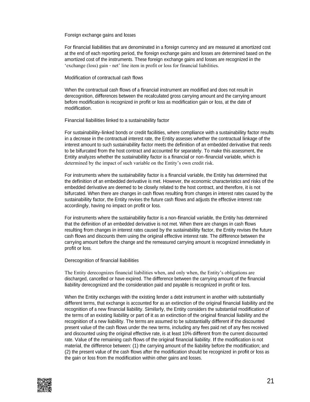 21 Foreign exchange gains and losses For financial liabilities that are denominated in a foreign currency and are measured at amortized cost at the end of each reporting period, the foreign exchange gains and losses are determined based on the amortized cost of the instruments. These foreign exchange gains and losses are recognized in the ‘exchange (loss) gain - net’ line item in profit or loss for financial liabilities. Modification of contractual cash flows When the contractual cash flows of a financial instrument are modified and does not result in derecognition, differences between the recalculated gross carrying amount and the carrying amount before modification is recognized in profit or loss as modification gain or loss, at the date of modification. Financial liabilities linked to a sustainability factor For sustainability-linked bonds or credit facilities, where compliance with a sustainability factor results in a decrease in the contractual interest rate, the Entity assesses whether the contractual linkage of the interest amount to such sustainability factor meets the definition of an embedded derivative that needs to be bifurcated from the host contract and accounted for separately. To make this assessment, the Entity analyzes whether the sustainability factor is a financial or non-financial variable, which is determined by the impact of such variable on the Entity’s own credit risk. For instruments where the sustainability factor is a financial variable, the Entity has determined that the definition of an embedded derivative is met. However, the economic characteristics and risks of the embedded derivative are deemed to be closely related to the host contract, and therefore, it is not bifurcated. When there are changes in cash flows resulting from changes in interest rates caused by the sustainability factor, the Entity revises the future cash flows and adjusts the effective interest rate accordingly, having no impact on profit or loss. For instruments where the sustainability factor is a non-financial variable, the Entity has determined that the definition of an embedded derivative is not met. When there are changes in cash flows resulting from changes in interest rates caused by the sustainability factor, the Entity revises the future cash flows and discounts them using the original effective interest rate. The difference between the carrying amount before the change and the remeasured carrying amount is recognized immediately in profit or loss. Derecognition of financial liabilities The Entity derecognizes financial liabilities when, and only when, the Entity’s obligations are discharged, cancelled or have expired. The difference between the carrying amount of the financial liability derecognized and the consideration paid and payable is recognized in profit or loss. When the Entity exchanges with the existing lender a debt instrument in another with substantially different terms, that exchange is accounted for as an extinction of the original financial liability and the recognition of a new financial liability. Similarly, the Entity considers the substantial modification of the terms of an existing liability or part of it as an extinction of the original financial liability and the recognition of a new liability. The terms are assumed to be substantially different if the discounted present value of the cash flows under the new terms, including any fees paid net of any fees received and discounted using the original effective rate, is at least 10% different from the current discounted rate. Value of the remaining cash flows of the original financial liability. If the modification is not material, the difference between: (1) the carrying amount of the liability before the modification; and (2) the present value of the cash flows after the modification should be recognized in profit or loss as the gain or loss from the modification within other gains and losses.