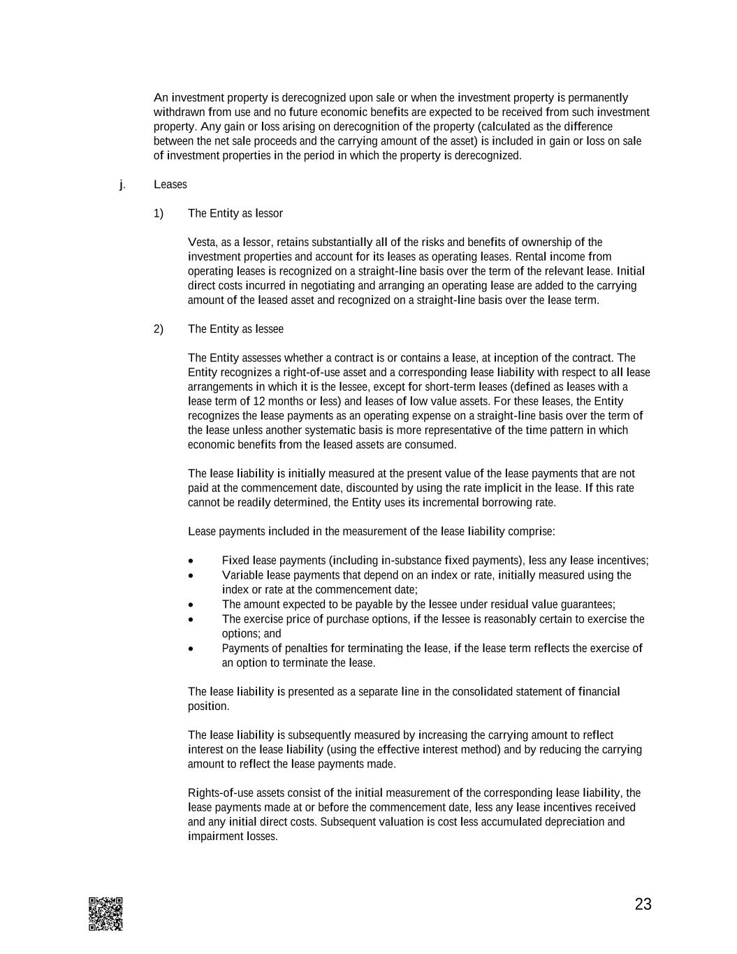 23 An investment property is derecognized upon sale or when the investment property is permanently withdrawn from use and no future economic benefits are expected to be received from such investment property. Any gain or loss arising on derecognition of the property (calculated as the difference between the net sale proceeds and the carrying amount of the asset) is included in gain or loss on sale of investment properties in the period in which the property is derecognized. j. Leases 1) The Entity as lessor Vesta, as a lessor, retains substantially all of the risks and benefits of ownership of the investment properties and account for its leases as operating leases. Rental income from operating leases is recognized on a straight-line basis over the term of the relevant lease. Initial direct costs incurred in negotiating and arranging an operating lease are added to the carrying amount of the leased asset and recognized on a straight-line basis over the lease term. 2) The Entity as lessee The Entity assesses whether a contract is or contains a lease, at inception of the contract. The Entity recognizes a right-of-use asset and a corresponding lease liability with respect to all lease arrangements in which it is the lessee, except for short-term leases (defined as leases with a lease term of 12 months or less) and leases of low value assets. For these leases, the Entity recognizes the lease payments as an operating expense on a straight-line basis over the term of the lease unless another systematic basis is more representative of the time pattern in which economic benefits from the leased assets are consumed. The lease liability is initially measured at the present value of the lease payments that are not paid at the commencement date, discounted by using the rate implicit in the lease. If this rate cannot be readily determined, the Entity uses its incremental borrowing rate. Lease payments included in the measurement of the lease liability comprise: • Fixed lease payments (including in-substance fixed payments), less any lease incentives; • Variable lease payments that depend on an index or rate, initially measured using the index or rate at the commencement date; • The amount expected to be payable by the lessee under residual value guarantees; • The exercise price of purchase options, if the lessee is reasonably certain to exercise the options; and • Payments of penalties for terminating the lease, if the lease term reflects the exercise of an option to terminate the lease. The lease liability is presented as a separate line in the consolidated statement of financial position. The lease liability is subsequently measured by increasing the carrying amount to reflect interest on the lease liability (using the effective interest method) and by reducing the carrying amount to reflect the lease payments made. Rights-of-use assets consist of the initial measurement of the corresponding lease liability, the lease payments made at or before the commencement date, less any lease incentives received and any initial direct costs. Subsequent valuation is cost less accumulated depreciation and impairment losses.