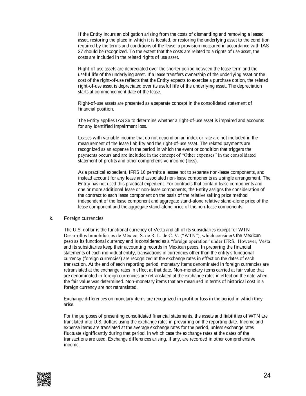 24 If the Entity incurs an obligation arising from the costs of dismantling and removing a leased asset, restoring the place in which it is located, or restoring the underlying asset to the condition required by the terms and conditions of the lease, a provision measured in accordance with IAS 37 should be recognized. To the extent that the costs are related to a rights of use asset, the costs are included in the related rights of use asset. Right-of-use assets are depreciated over the shorter period between the lease term and the useful life of the underlying asset. If a lease transfers ownership of the underlying asset or the cost of the right-of-use reflects that the Entity expects to exercise a purchase option, the related right-of-use asset is depreciated over its useful life of the underlying asset. The depreciation starts at commencement date of the lease. Right-of-use assets are presented as a separate concept in the consolidated statement of financial position. The Entity applies IAS 36 to determine whether a right-of-use asset is impaired and accounts for any identified impairment loss. Leases with variable income that do not depend on an index or rate are not included in the measurement of the lease liability and the right-of-use asset. The related payments are recognized as an expense in the period in which the event or condition that triggers the payments occurs and are included in the concept of “Other expenses” in the consolidated statement of profits and other comprehensive income (loss). As a practical expedient, IFRS 16 permits a lessee not to separate non-lease components, and instead account for any lease and associated non-lease components as a single arrangement. The Entity has not used this practical expedient. For contracts that contain lease components and one or more additional lease or non-lease components, the Entity assigns the consideration of the contract to each lease component on the basis of the relative selling price method independent of the lease component and aggregate stand-alone relative stand-alone price of the lease component and the aggregate stand-alone price of the non-lease components. k. Foreign currencies The U.S. dollar is the functional currency of Vesta and all of its subsidiaries except for WTN Desarrollos Inmobiliarios de México, S. de R. L. de C. V. (“WTN”), which considers the Mexican peso as its functional currency and is considered as a “foreign operation” under IFRS. However, Vesta and its subsidiaries keep their accounting records in Mexican pesos. In preparing the financial statements of each individual entity, transactions in currencies other than the entity's functional currency (foreign currencies) are recognized at the exchange rates in effect on the dates of each transaction. At the end of each reporting period, monetary items denominated in foreign currencies are retranslated at the exchange rates in effect at that date. Non-monetary items carried at fair value that are denominated in foreign currencies are retranslated at the exchange rates in effect on the date when the fair value was determined. Non-monetary items that are measured in terms of historical cost in a foreign currency are not retranslated. Exchange differences on monetary items are recognized in profit or loss in the period in which they arise. For the purposes of presenting consolidated financial statements, the assets and liabilities of WTN are translated into U.S. dollars using the exchange rates in prevailing on the reporting date. Income and expense items are translated at the average exchange rates for the period, unless exchange rates fluctuate significantly during that period, in which case the exchange rates at the dates of the transactions are used. Exchange differences arising, if any, are recorded in other comprehensive income.