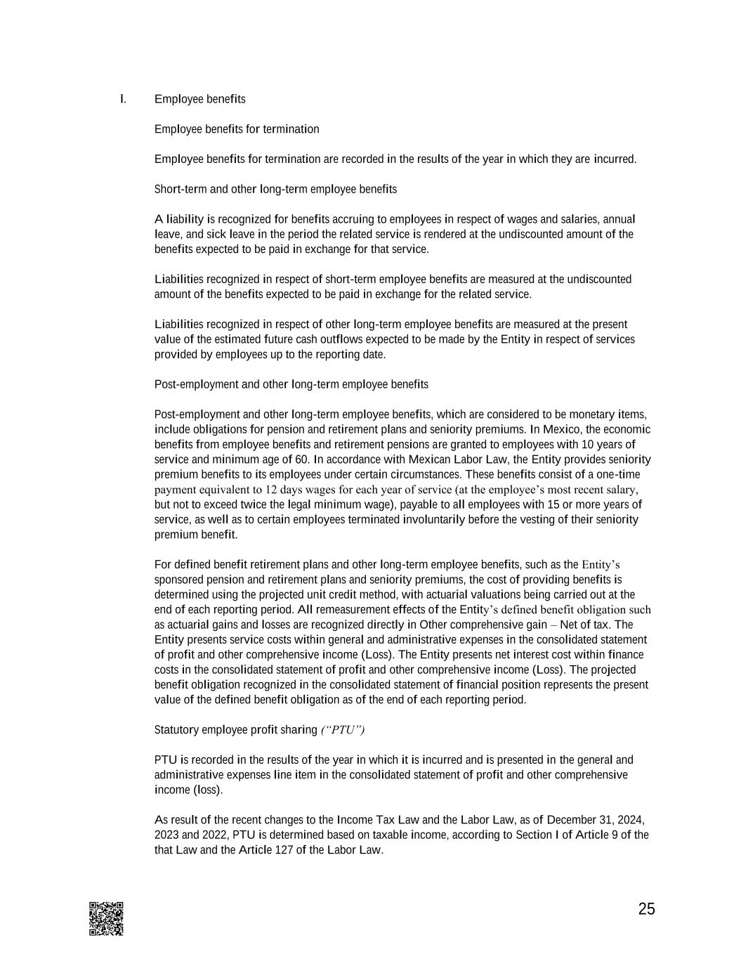 25 l. Employee benefits Employee benefits for termination Employee benefits for termination are recorded in the results of the year in which they are incurred. Short-term and other long-term employee benefits A liability is recognized for benefits accruing to employees in respect of wages and salaries, annual leave, and sick leave in the period the related service is rendered at the undiscounted amount of the benefits expected to be paid in exchange for that service. Liabilities recognized in respect of short-term employee benefits are measured at the undiscounted amount of the benefits expected to be paid in exchange for the related service. Liabilities recognized in respect of other long-term employee benefits are measured at the present value of the estimated future cash outflows expected to be made by the Entity in respect of services provided by employees up to the reporting date. Post-employment and other long-term employee benefits Post-employment and other long-term employee benefits, which are considered to be monetary items, include obligations for pension and retirement plans and seniority premiums. In Mexico, the economic benefits from employee benefits and retirement pensions are granted to employees with 10 years of service and minimum age of 60. In accordance with Mexican Labor Law, the Entity provides seniority premium benefits to its employees under certain circumstances. These benefits consist of a one-time payment equivalent to 12 days wages for each year of service (at the employee’s most recent salary, but not to exceed twice the legal minimum wage), payable to all employees with 15 or more years of service, as well as to certain employees terminated involuntarily before the vesting of their seniority premium benefit. For defined benefit retirement plans and other long-term employee benefits, such as the Entity’s sponsored pension and retirement plans and seniority premiums, the cost of providing benefits is determined using the projected unit credit method, with actuarial valuations being carried out at the end of each reporting period. All remeasurement effects of the Entity’s defined benefit obligation such as actuarial gains and losses are recognized directly in Other comprehensive gain – Net of tax. The Entity presents service costs within general and administrative expenses in the consolidated statement of profit and other comprehensive income (Loss). The Entity presents net interest cost within finance costs in the consolidated statement of profit and other comprehensive income (Loss). The projected benefit obligation recognized in the consolidated statement of financial position represents the present value of the defined benefit obligation as of the end of each reporting period. Statutory employee profit sharing (“PTU”) PTU is recorded in the results of the year in which it is incurred and is presented in the general and administrative expenses line item in the consolidated statement of profit and other comprehensive income (loss). As result of the recent changes to the Income Tax Law and the Labor Law, as of December 31, 2024, 2023 and 2022, PTU is determined based on taxable income, according to Section I of Article 9 of the that Law and the Article 127 of the Labor Law.