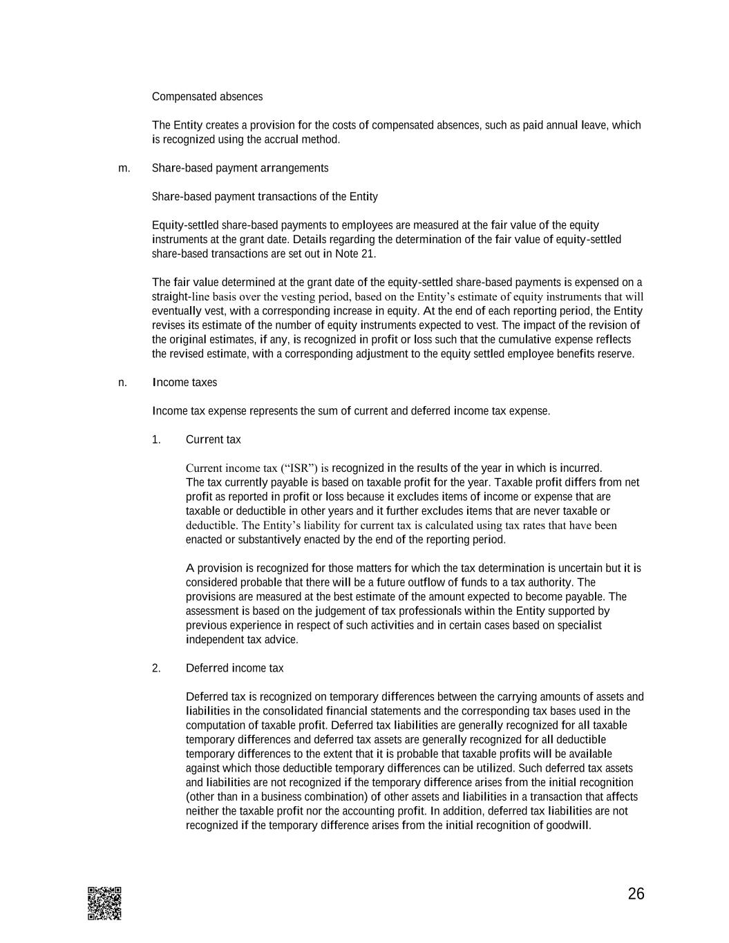 26 Compensated absences The Entity creates a provision for the costs of compensated absences, such as paid annual leave, which is recognized using the accrual method. m. Share-based payment arrangements Share-based payment transactions of the Entity Equity-settled share-based payments to employees are measured at the fair value of the equity instruments at the grant date. Details regarding the determination of the fair value of equity-settled share-based transactions are set out in Note 21. The fair value determined at the grant date of the equity-settled share-based payments is expensed on a straight-line basis over the vesting period, based on the Entity’s estimate of equity instruments that will eventually vest, with a corresponding increase in equity. At the end of each reporting period, the Entity revises its estimate of the number of equity instruments expected to vest. The impact of the revision of the original estimates, if any, is recognized in profit or loss such that the cumulative expense reflects the revised estimate, with a corresponding adjustment to the equity settled employee benefits reserve. n. Income taxes Income tax expense represents the sum of current and deferred income tax expense. 1. Current tax Current income tax (“ISR”) is recognized in the results of the year in which is incurred. The tax currently payable is based on taxable profit for the year. Taxable profit differs from net profit as reported in profit or loss because it excludes items of income or expense that are taxable or deductible in other years and it further excludes items that are never taxable or deductible. The Entity’s liability for current tax is calculated using tax rates that have been enacted or substantively enacted by the end of the reporting period. A provision is recognized for those matters for which the tax determination is uncertain but it is considered probable that there will be a future outflow of funds to a tax authority. The provisions are measured at the best estimate of the amount expected to become payable. The assessment is based on the judgement of tax professionals within the Entity supported by previous experience in respect of such activities and in certain cases based on specialist independent tax advice. 2. Deferred income tax Deferred tax is recognized on temporary differences between the carrying amounts of assets and liabilities in the consolidated financial statements and the corresponding tax bases used in the computation of taxable profit. Deferred tax liabilities are generally recognized for all taxable temporary differences and deferred tax assets are generally recognized for all deductible temporary differences to the extent that it is probable that taxable profits will be available against which those deductible temporary differences can be utilized. Such deferred tax assets and liabilities are not recognized if the temporary difference arises from the initial recognition (other than in a business combination) of other assets and liabilities in a transaction that affects neither the taxable profit nor the accounting profit. In addition, deferred tax liabilities are not recognized if the temporary difference arises from the initial recognition of goodwill.