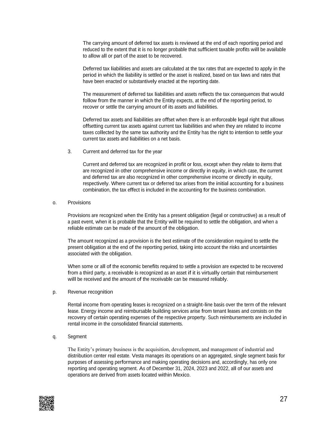 27 The carrying amount of deferred tax assets is reviewed at the end of each reporting period and reduced to the extent that it is no longer probable that sufficient taxable profits will be available to allow all or part of the asset to be recovered. Deferred tax liabilities and assets are calculated at the tax rates that are expected to apply in the period in which the liability is settled or the asset is realized, based on tax laws and rates that have been enacted or substantively enacted at the reporting date. The measurement of deferred tax liabilities and assets reflects the tax consequences that would follow from the manner in which the Entity expects, at the end of the reporting period, to recover or settle the carrying amount of its assets and liabilities. Deferred tax assets and liabilities are offset when there is an enforceable legal right that allows offsetting current tax assets against current tax liabilities and when they are related to income taxes collected by the same tax authority and the Entity has the right to intention to settle your current tax assets and liabilities on a net basis. 3. Current and deferred tax for the year Current and deferred tax are recognized in profit or loss, except when they relate to items that are recognized in other comprehensive income or directly in equity, in which case, the current and deferred tax are also recognized in other comprehensive income or directly in equity, respectively. Where current tax or deferred tax arises from the initial accounting for a business combination, the tax effect is included in the accounting for the business combination. o. Provisions Provisions are recognized when the Entity has a present obligation (legal or constructive) as a result of a past event, when it is probable that the Entity will be required to settle the obligation, and when a reliable estimate can be made of the amount of the obligation. The amount recognized as a provision is the best estimate of the consideration required to settle the present obligation at the end of the reporting period, taking into account the risks and uncertainties associated with the obligation. When some or all of the economic benefits required to settle a provision are expected to be recovered from a third party, a receivable is recognized as an asset if it is virtually certain that reimbursement will be received and the amount of the receivable can be measured reliably. p. Revenue recognition Rental income from operating leases is recognized on a straight-line basis over the term of the relevant lease. Energy income and reimbursable building services arise from tenant leases and consists on the recovery of certain operating expenses of the respective property. Such reimbursements are included in rental income in the consolidated financial statements. q. Segment The Entity’s primary business is the acquisition, development, and management of industrial and distribution center real estate. Vesta manages its operations on an aggregated, single segment basis for purposes of assessing performance and making operating decisions and, accordingly, has only one reporting and operating segment. As of December 31, 2024, 2023 and 2022, all of our assets and operations are derived from assets located within Mexico.