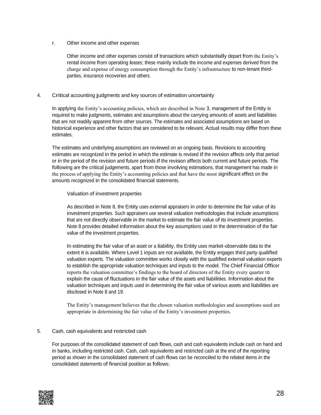 28 r. Other income and other expenses Other income and other expenses consist of transactions which substantially depart from the Entity’s rental income from operating leases; these mainly include the income and expenses derived from the charge and expense of energy consumption through the Entity’s infrastructure to non-tenant third- parties, insurance recoveries and others. 4. Critical accounting judgments and key sources of estimation uncertainty In applying the Entity’s accounting policies, which are described in Note 3, management of the Entity is required to make judgments, estimates and assumptions about the carrying amounts of assets and liabilities that are not readily apparent from other sources. The estimates and associated assumptions are based on historical experience and other factors that are considered to be relevant. Actual results may differ from these estimates. The estimates and underlying assumptions are reviewed on an ongoing basis. Revisions to accounting estimates are recognized in the period in which the estimate is revised if the revision affects only that period or in the period of the revision and future periods if the revision affects both current and future periods. The following are the critical judgements, apart from those involving estimations, that management has made in the process of applying the Entity’s accounting policies and that have the most significant effect on the amounts recognized in the consolidated financial statements. Valuation of investment properties As described in Note 8, the Entity uses external appraisers in order to determine the fair value of its investment properties. Such appraisers use several valuation methodologies that include assumptions that are not directly observable in the market to estimate the fair value of its investment properties. Note 8 provides detailed information about the key assumptions used in the determination of the fair value of the investment properties. In estimating the fair value of an asset or a liability, the Entity uses market-observable data to the extent it is available. Where Level 1 inputs are not available, the Entity engages third party qualified valuation experts. The valuation committee works closely with the qualified external valuation experts to establish the appropriate valuation techniques and inputs to the model. The Chief Financial Officer reports the valuation committee’s findings to the board of directors of the Entity every quarter to explain the cause of fluctuations in the fair value of the assets and liabilities. Information about the valuation techniques and inputs used in determining the fair value of various assets and liabilities are disclosed in Note 8 and 19. The Entity’s management believes that the chosen valuation methodologies and assumptions used are appropriate in determining the fair value of the Entity’s investment properties. 5. Cash, cash equivalents and restricted cash For purposes of the consolidated statement of cash flows, cash and cash equivalents include cash on hand and in banks, including restricted cash. Cash, cash equivalents and restricted cash at the end of the reporting period as shown in the consolidated statement of cash flows can be reconciled to the related items in the consolidated statements of financial position as follows: