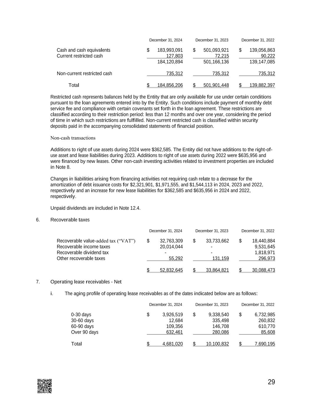 29 December 31, 2024 December 31, 2023 December 31, 2022 Cash and cash equivalents $ 183,993,091 $ 501,093,921 $ 139,056,863 Current restricted cash 127,803 72,215 90,222 184,120,894 501,166,136 139,147,085 Non-current restricted cash 735,312 735,312 735,312 Total $ 184,856,206 $ 501,901,448 $ 139,882,397 Restricted cash represents balances held by the Entity that are only available for use under certain conditions pursuant to the loan agreements entered into by the Entity. Such conditions include payment of monthly debt service fee and compliance with certain covenants set forth in the loan agreement. These restrictions are classified according to their restriction period: less than 12 months and over one year, considering the period of time in which such restrictions are fulfilled. Non-current restricted cash is classified within security deposits paid in the accompanying consolidated statements of financial position. Non‑cash transactions Additions to right of use assets during 2024 were $362,585. The Entity did not have additions to the right-of- use asset and lease liabilities during 2023. Additions to right of use assets during 2022 were $635,956 and were financed by new leases. Other non-cash investing activities related to investment properties are included in Note 8. Changes in liabilities arising from financing activities not requiring cash relate to a decrease for the amortization of debt issuance costs for $2,321,901, $1,971,555, and $1,544,113 in 2024, 2023 and 2022, respectively and an increase for new lease liabilities for $362,585 and $635,956 in 2024 and 2022, respectively. Unpaid dividends are included in Note 12.4. 6. Recoverable taxes December 31, 2024 December 31, 2023 December 31, 2022 Recoverable value-added tax (“VAT”) $ 32,763,309 $ 33,733,662 $ 18,440,884 Recoverable income taxes 20,014,044 - 9,531,645 Recoverable dividend tax - - 1,818,971 Other recoverable taxes 55,292 131,159 296,973 $ 52,832,645 $ 33,864,821 $ 30,088,473 7. Operating lease receivables - Net i. The aging profile of operating lease receivables as of the dates indicated below are as follows: December 31, 2024 December 31, 2023 December 31, 2022 0-30 days $ 3,926,519 $ 9,338,540 $ 6,732,985 30-60 days 12,684 335,498 260,832 60-90 days 109,356 146,708 610,770 Over 90 days 632,461 280,086 85,608 Total $ 4,681,020 $ 10,100,832 $ 7,690,195