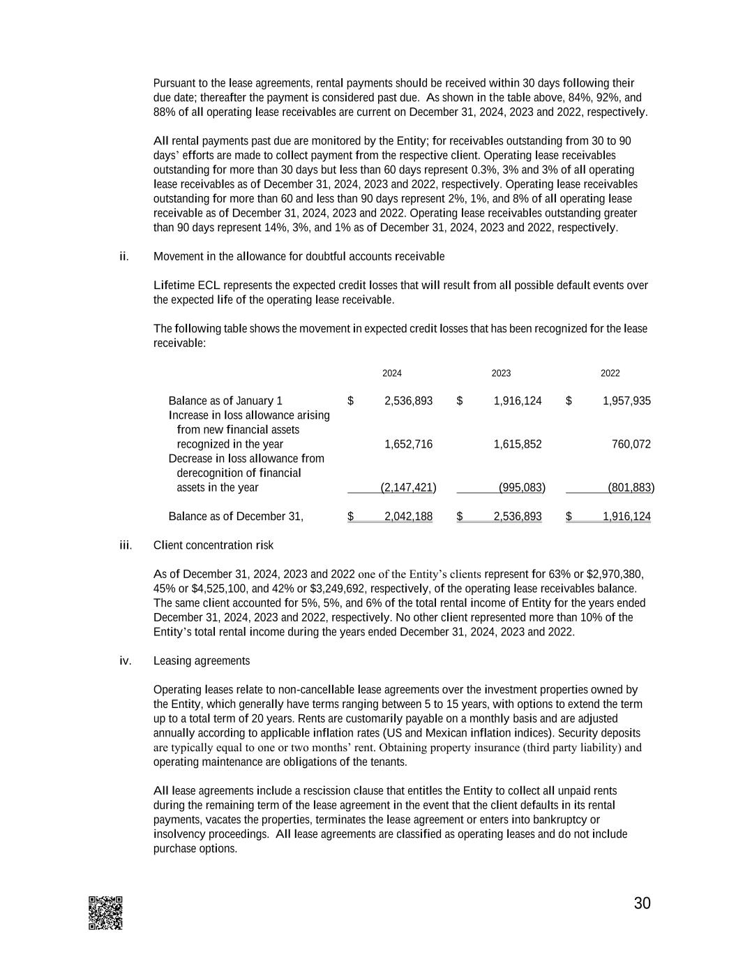 30 Pursuant to the lease agreements, rental payments should be received within 30 days following their due date; thereafter the payment is considered past due. As shown in the table above, 84%, 92%, and 88% of all operating lease receivables are current on December 31, 2024, 2023 and 2022, respectively. All rental payments past due are monitored by the Entity; for receivables outstanding from 30 to 90 days’ efforts are made to collect payment from the respective client. Operating lease receivables outstanding for more than 30 days but less than 60 days represent 0.3%, 3% and 3% of all operating lease receivables as of December 31, 2024, 2023 and 2022, respectively. Operating lease receivables outstanding for more than 60 and less than 90 days represent 2%, 1%, and 8% of all operating lease receivable as of December 31, 2024, 2023 and 2022. Operating lease receivables outstanding greater than 90 days represent 14%, 3%, and 1% as of December 31, 2024, 2023 and 2022, respectively. ii. Movement in the allowance for doubtful accounts receivable Lifetime ECL represents the expected credit losses that will result from all possible default events over the expected life of the operating lease receivable. The following table shows the movement in expected credit losses that has been recognized for the lease receivable: 2024 2023 2022 Balance as of January 1 $ 2,536,893 $ 1,916,124 $ 1,957,935 Increase in loss allowance arising from new financial assets recognized in the year 1,652,716 1,615,852 760,072 Decrease in loss allowance from derecognition of financial assets in the year (2,147,421) (995,083) (801,883) Balance as of December 31, $ 2,042,188 $ 2,536,893 $ 1,916,124 iii. Client concentration risk As of December 31, 2024, 2023 and 2022 one of the Entity’s clients represent for 63% or $2,970,380, 45% or $4,525,100, and 42% or $3,249,692, respectively, of the operating lease receivables balance. The same client accounted for 5%, 5%, and 6% of the total rental income of Entity for the years ended December 31, 2024, 2023 and 2022, respectively. No other client represented more than 10% of the Entity’s total rental income during the years ended December 31, 2024, 2023 and 2022. iv. Leasing agreements Operating leases relate to non-cancellable lease agreements over the investment properties owned by the Entity, which generally have terms ranging between 5 to 15 years, with options to extend the term up to a total term of 20 years. Rents are customarily payable on a monthly basis and are adjusted annually according to applicable inflation rates (US and Mexican inflation indices). Security deposits are typically equal to one or two months’ rent. Obtaining property insurance (third party liability) and operating maintenance are obligations of the tenants. All lease agreements include a rescission clause that entitles the Entity to collect all unpaid rents during the remaining term of the lease agreement in the event that the client defaults in its rental payments, vacates the properties, terminates the lease agreement or enters into bankruptcy or insolvency proceedings. All lease agreements are classified as operating leases and do not include purchase options.