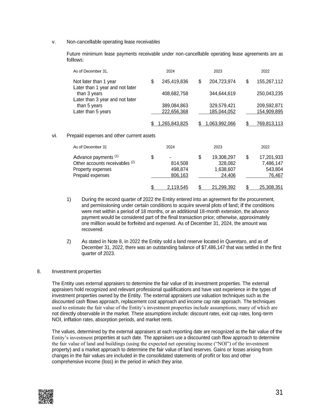 31 v. Non-cancellable operating lease receivables Future minimum lease payments receivable under non-cancellable operating lease agreements are as follows: As of December 31, 2024 2023 2022 Not later than 1 year $ 245,419,836 $ 204,723,974 $ 155,267,112 Later than 1 year and not later than 3 years 408,682,758 344,644,619 250,043,235 Later than 3 year and not later than 5 years 389,084,863 329,579,421 209,592,871 Later than 5 years 222,656,368 185,044,052 154,909,895 $ 1,265,843,825 $ 1,063,992,066 $ 769,813,113 vi. Prepaid expenses and other current assets As of December 31 2024 2023 2022 Advance payments (1) $ - $ 19,308,297 $ 17,201,933 Other accounts receivables (2) 814,508 328,082 7,486,147 Property expenses 498,874 1,638,607 543,804 Prepaid expenses 806,163 24,406 76,467 $ 2,119,545 $ 21,299,392 $ 25,308,351 1) During the second quarter of 2022 the Entity entered into an agreement for the procurement, and permissioning under certain conditions to acquire several plots of land; if the conditions were met within a period of 18 months, or an additional 18-month extension, the advance payment would be considered part of the final transaction price; otherwise, approximately one million would be forfeited and expensed. As of December 31, 2024, the amount was recovered. 2) As stated in Note 8, in 2022 the Entity sold a land reserve located in Queretaro, and as of December 31, 2022, there was an outstanding balance of $7,486,147 that was settled in the first quarter of 2023. 8. Investment properties The Entity uses external appraisers to determine the fair value of its investment properties. The external appraisers hold recognized and relevant professional qualifications and have vast experience in the types of investment properties owned by the Entity. The external appraisers use valuation techniques such as the discounted cash flows approach, replacement cost approach and income cap rate approach. The techniques used to estimate the fair value of the Entity’s investment properties include assumptions, many of which are not directly observable in the market. These assumptions include: discount rates, exit cap rates, long-term NOI, inflation rates, absorption periods, and market rents. The values, determined by the external appraisers at each reporting date are recognized as the fair value of the Entity’s investment properties at such date. The appraisers use a discounted cash flow approach to determine the fair value of land and buildings (using the expected net operating income (“NOI”) of the investment property) and a market approach to determine the fair value of land reserves. Gains or losses arising from changes in the fair values are included in the consolidated statements of profit or loss and other comprehensive income (loss) in the period in which they arise.