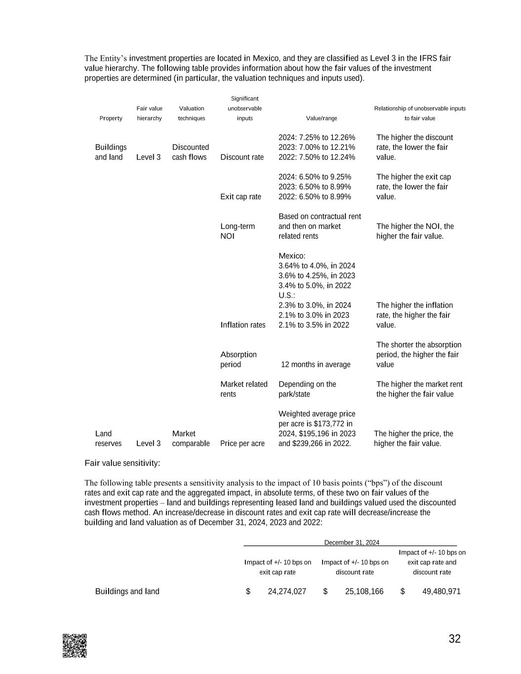 32 The Entity’s investment properties are located in Mexico, and they are classified as Level 3 in the IFRS fair value hierarchy. The following table provides information about how the fair values of the investment properties are determined (in particular, the valuation techniques and inputs used). Property Fair value hierarchy Valuation techniques Significant unobservable inputs Value/range Relationship of unobservable inputs to fair value Buildings and land Level 3 Discounted cash flows Discount rate 2024: 7.25% to 12.26% 2023: 7.00% to 12.21% 2022: 7.50% to 12.24% The higher the discount rate, the lower the fair value. Exit cap rate 2024: 6.50% to 9.25% 2023: 6.50% to 8.99% 2022: 6.50% to 8.99% The higher the exit cap rate, the lower the fair value. Long-term NOI Based on contractual rent and then on market related rents The higher the NOI, the higher the fair value. Inflation rates Mexico: 3.64% to 4.0%, in 2024 3.6% to 4.25%, in 2023 3.4% to 5.0%, in 2022 U.S.: 2.3% to 3.0%, in 2024 2.1% to 3.0% in 2023 2.1% to 3.5% in 2022 The higher the inflation rate, the higher the fair value. Absorption period 12 months in average The shorter the absorption period, the higher the fair value Market related rents Depending on the park/state The higher the market rent the higher the fair value Land reserves Level 3 Market comparable Price per acre Weighted average price per acre is $173,772 in 2024, $195,196 in 2023 and $239,266 in 2022. The higher the price, the higher the fair value. Fair value sensitivity: The following table presents a sensitivity analysis to the impact of 10 basis points (“bps”) of the discount rates and exit cap rate and the aggregated impact, in absolute terms, of these two on fair values of the investment properties – land and buildings representing leased land and buildings valued used the discounted cash flows method. An increase/decrease in discount rates and exit cap rate will decrease/increase the building and land valuation as of December 31, 2024, 2023 and 2022: December 31, 2024 Impact of +/- 10 bps on exit cap rate Impact of +/- 10 bps on discount rate Impact of +/- 10 bps on exit cap rate and discount rate Buildings and land $ 24,274,027 $ 25,108,166 $ 49,480,971