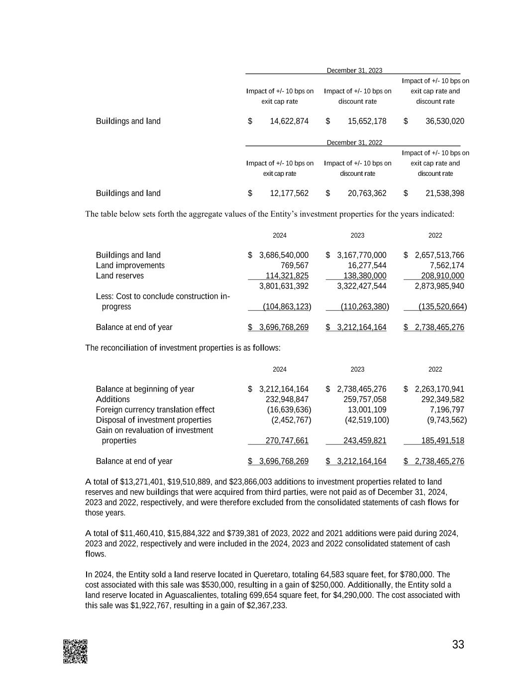 33 December 31, 2023 Impact of +/- 10 bps on exit cap rate Impact of +/- 10 bps on discount rate Impact of +/- 10 bps on exit cap rate and discount rate Buildings and land $ 14,622,874 $ 15,652,178 $ 36,530,020 December 31, 2022 Impact of +/- 10 bps on exit cap rate Impact of +/- 10 bps on discount rate Impact of +/- 10 bps on exit cap rate and discount rate Buildings and land $ 12,177,562 $ 20,763,362 $ 21,538,398 The table below sets forth the aggregate values of the Entity’s investment properties for the years indicated: 2024 2023 2022 Buildings and land $ 3,686,540,000 $ 3,167,770,000 $ 2,657,513,766 Land improvements 769,567 16,277,544 7,562,174 Land reserves 114,321,825 138,380,000 208,910,000 3,801,631,392 3,322,427,544 2,873,985,940 Less: Cost to conclude construction in- progress (104,863,123) (110,263,380) (135,520,664) Balance at end of year $ 3,696,768,269 $ 3,212,164,164 $ 2,738,465,276 The reconciliation of investment properties is as follows: 2024 2023 2022 Balance at beginning of year $ 3,212,164,164 $ 2,738,465,276 $ 2,263,170,941 Additions 232,948,847 259,757,058 292,349,582 Foreign currency translation effect (16,639,636) 13,001,109 7,196,797 Disposal of investment properties (2,452,767) (42,519,100) (9,743,562) Gain on revaluation of investment properties 270,747,661 243,459,821 185,491,518 Balance at end of year $ 3,696,768,269 $ 3,212,164,164 $ 2,738,465,276 A total of $13,271,401, $19,510,889, and $23,866,003 additions to investment properties related to land reserves and new buildings that were acquired from third parties, were not paid as of December 31, 2024, 2023 and 2022, respectively, and were therefore excluded from the consolidated statements of cash flows for those years. A total of $11,460,410, $15,884,322 and $739,381 of 2023, 2022 and 2021 additions were paid during 2024, 2023 and 2022, respectively and were included in the 2024, 2023 and 2022 consolidated statement of cash flows. In 2024, the Entity sold a land reserve located in Queretaro, totaling 64,583 square feet, for $780,000. The cost associated with this sale was $530,000, resulting in a gain of $250,000. Additionally, the Entity sold a land reserve located in Aguascalientes, totaling 699,654 square feet, for $4,290,000. The cost associated with this sale was $1,922,767, resulting in a gain of $2,367,233.