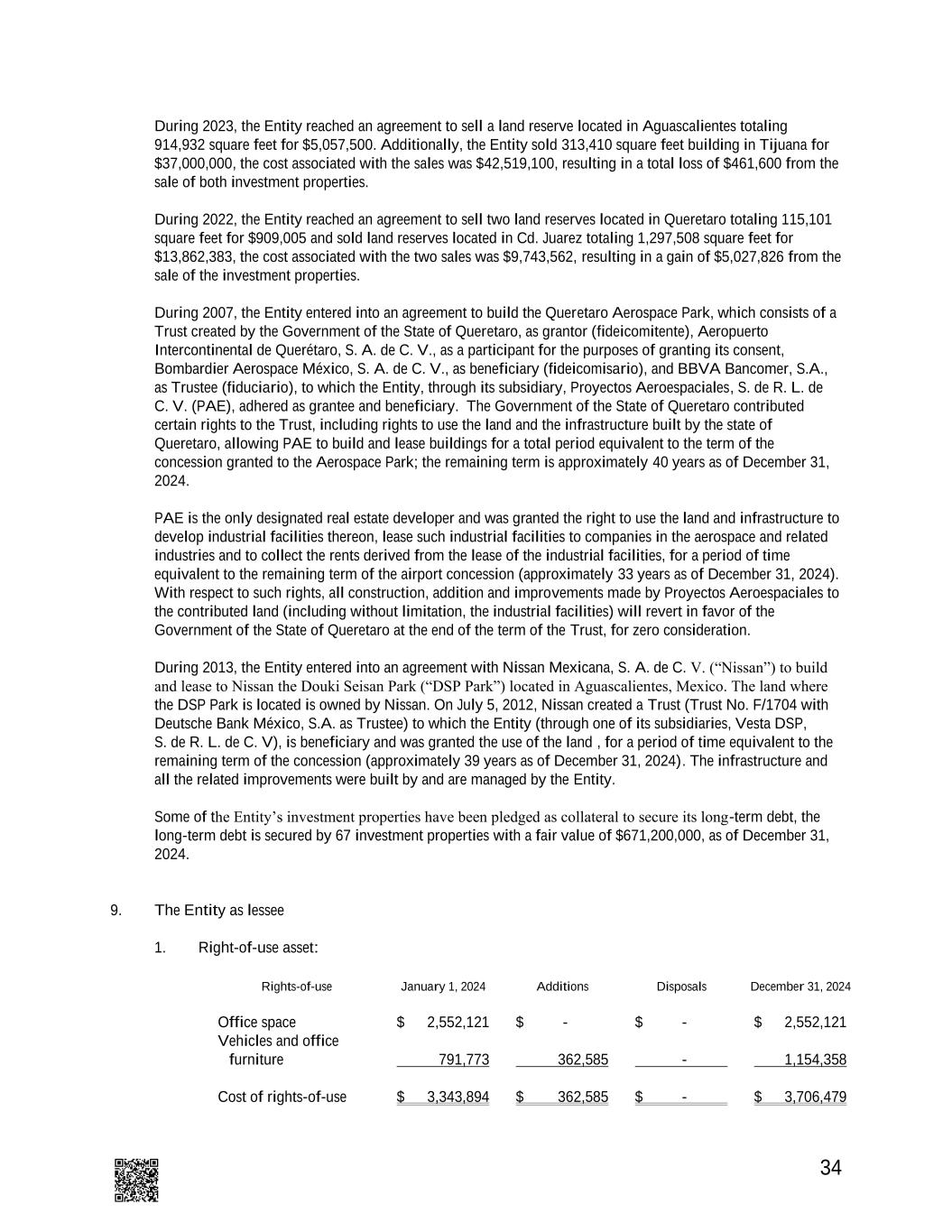 34 During 2023, the Entity reached an agreement to sell a land reserve located in Aguascalientes totaling 914,932 square feet for $5,057,500. Additionally, the Entity sold 313,410 square feet building in Tijuana for $37,000,000, the cost associated with the sales was $42,519,100, resulting in a total loss of $461,600 from the sale of both investment properties. During 2022, the Entity reached an agreement to sell two land reserves located in Queretaro totaling 115,101 square feet for $909,005 and sold land reserves located in Cd. Juarez totaling 1,297,508 square feet for $13,862,383, the cost associated with the two sales was $9,743,562, resulting in a gain of $5,027,826 from the sale of the investment properties. During 2007, the Entity entered into an agreement to build the Queretaro Aerospace Park, which consists of a Trust created by the Government of the State of Queretaro, as grantor (fideicomitente), Aeropuerto Intercontinental de Querétaro, S. A. de C. V., as a participant for the purposes of granting its consent, Bombardier Aerospace México, S. A. de C. V., as beneficiary (fideicomisario), and BBVA Bancomer, S.A., as Trustee (fiduciario), to which the Entity, through its subsidiary, Proyectos Aeroespaciales, S. de R. L. de C. V. (PAE), adhered as grantee and beneficiary. The Government of the State of Queretaro contributed certain rights to the Trust, including rights to use the land and the infrastructure built by the state of Queretaro, allowing PAE to build and lease buildings for a total period equivalent to the term of the concession granted to the Aerospace Park; the remaining term is approximately 40 years as of December 31, 2024. PAE is the only designated real estate developer and was granted the right to use the land and infrastructure to develop industrial facilities thereon, lease such industrial facilities to companies in the aerospace and related industries and to collect the rents derived from the lease of the industrial facilities, for a period of time equivalent to the remaining term of the airport concession (approximately 33 years as of December 31, 2024). With respect to such rights, all construction, addition and improvements made by Proyectos Aeroespaciales to the contributed land (including without limitation, the industrial facilities) will revert in favor of the Government of the State of Queretaro at the end of the term of the Trust, for zero consideration. During 2013, the Entity entered into an agreement with Nissan Mexicana, S. A. de C. V. (“Nissan”) to build and lease to Nissan the Douki Seisan Park (“DSP Park”) located in Aguascalientes, Mexico. The land where the DSP Park is located is owned by Nissan. On July 5, 2012, Nissan created a Trust (Trust No. F/1704 with Deutsche Bank México, S.A. as Trustee) to which the Entity (through one of its subsidiaries, Vesta DSP, S. de R. L. de C. V), is beneficiary and was granted the use of the land , for a period of time equivalent to the remaining term of the concession (approximately 39 years as of December 31, 2024). The infrastructure and all the related improvements were built by and are managed by the Entity. Some of the Entity’s investment properties have been pledged as collateral to secure its long-term debt, the long-term debt is secured by 67 investment properties with a fair value of $671,200,000, as of December 31, 2024. 9. The Entity as lessee 1. Right-of-use asset: Rights-of-use January 1, 2024 Additions Disposals December 31, 2024 Office space $ 2,552,121 $ - $ - $ 2,552,121 Vehicles and office furniture 791,773 362,585 - 1,154,358 Cost of rights-of-use $ 3,343,894 $ 362,585 $ - $ 3,706,479