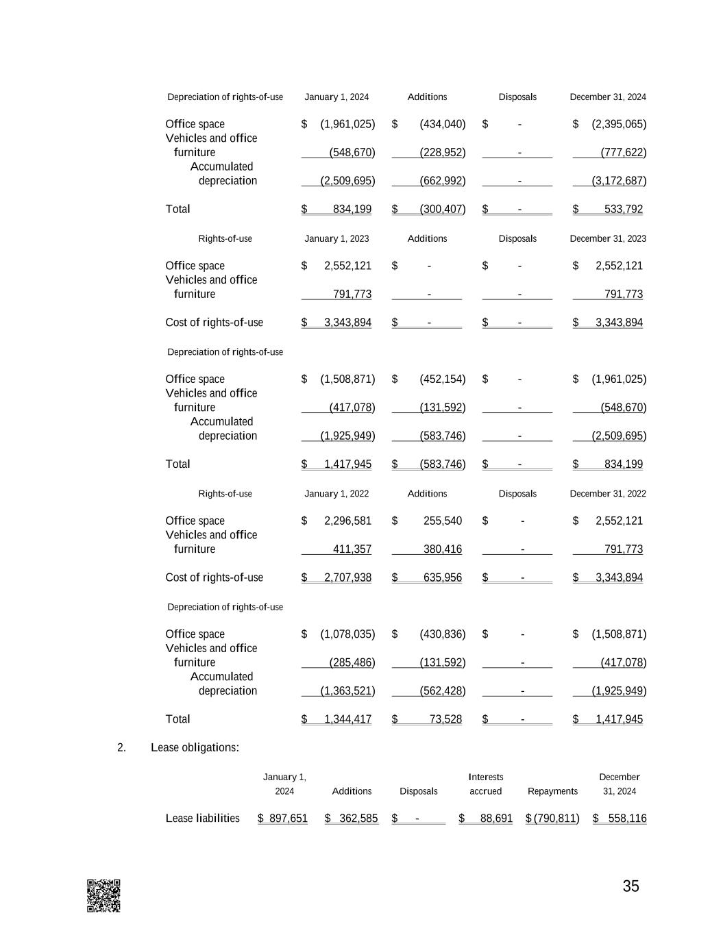 35 Depreciation of rights-of-use January 1, 2024 Additions Disposals December 31, 2024 Office space $ (1,961,025) $ (434,040) $ - $ (2,395,065) Vehicles and office furniture (548,670) (228,952) - (777,622) Accumulated depreciation (2,509,695) (662,992) - (3,172,687) Total $ 834,199 $ (300,407) $ - $ 533,792 Rights-of-use January 1, 2023 Additions Disposals December 31, 2023 Office space $ 2,552,121 $ - $ - $ 2,552,121 Vehicles and office furniture 791,773 - - 791,773 Cost of rights-of-use $ 3,343,894 $ - $ - $ 3,343,894 Depreciation of rights-of-use Office space $ (1,508,871) $ (452,154) $ - $ (1,961,025) Vehicles and office furniture (417,078) (131,592) - (548,670) Accumulated depreciation (1,925,949) (583,746) - (2,509,695) Total $ 1,417,945 $ (583,746) $ - $ 834,199 Rights-of-use January 1, 2022 Additions Disposals December 31, 2022 Office space $ 2,296,581 $ 255,540 $ - $ 2,552,121 Vehicles and office furniture 411,357 380,416 - 791,773 Cost of rights-of-use $ 2,707,938 $ 635,956 $ - $ 3,343,894 Depreciation of rights-of-use Office space $ (1,078,035) $ (430,836) $ - $ (1,508,871) Vehicles and office furniture (285,486) (131,592) - (417,078) Accumulated depreciation (1,363,521) (562,428) - (1,925,949) Total $ 1,344,417 $ 73,528 $ - $ 1,417,945 2. Lease obligations: January 1, 2024 Additions Disposals Interests accrued Repayments December 31, 2024 Lease liabilities $ 897,651 $ 362,585 $ - $ 88,691 $ (790,811) $ 558,116