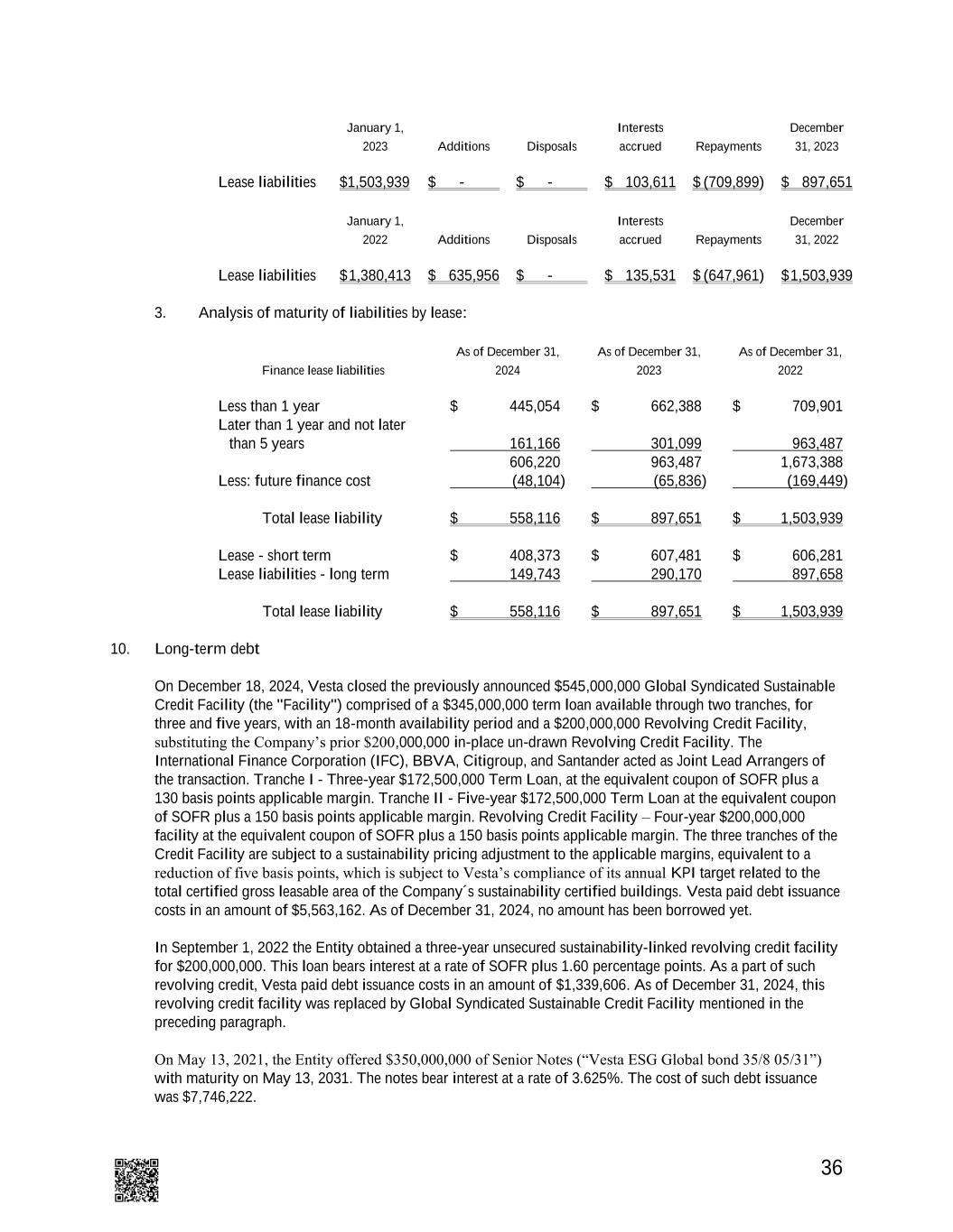 36 January 1, 2023 Additions Disposals Interests accrued Repayments December 31, 2023 Lease liabilities $1,503,939 $ - $ - $ 103,611 $ (709,899) $ 897,651 January 1, 2022 Additions Disposals Interests accrued Repayments December 31, 2022 Lease liabilities $ 1,380,413 $ 635,956 $ - $ 135,531 $ (647,961) $ 1,503,939 3. Analysis of maturity of liabilities by lease: Finance lease liabilities As of December 31, 2024 As of December 31, 2023 As of December 31, 2022 Less than 1 year $ 445,054 $ 662,388 $ 709,901 Later than 1 year and not later than 5 years 161,166 301,099 963,487 606,220 963,487 1,673,388 Less: future finance cost (48,104) (65,836) (169,449) Total lease liability $ 558,116 $ 897,651 $ 1,503,939 Lease - short term $ 408,373 $ 607,481 $ 606,281 Lease liabilities - long term 149,743 290,170 897,658 Total lease liability $ 558,116 $ 897,651 $ 1,503,939 10. Long-term debt On December 18, 2024, Vesta closed the previously announced $545,000,000 Global Syndicated Sustainable Credit Facility (the "Facility") comprised of a $345,000,000 term loan available through two tranches, for three and five years, with an 18-month availability period and a $200,000,000 Revolving Credit Facility, substituting the Company’s prior $200,000,000 in-place un-drawn Revolving Credit Facility. The International Finance Corporation (IFC), BBVA, Citigroup, and Santander acted as Joint Lead Arrangers of the transaction. Tranche I - Three-year $172,500,000 Term Loan, at the equivalent coupon of SOFR plus a 130 basis points applicable margin. Tranche II - Five-year $172,500,000 Term Loan at the equivalent coupon of SOFR plus a 150 basis points applicable margin. Revolving Credit Facility – Four-year $200,000,000 facility at the equivalent coupon of SOFR plus a 150 basis points applicable margin. The three tranches of the Credit Facility are subject to a sustainability pricing adjustment to the applicable margins, equivalent to a reduction of five basis points, which is subject to Vesta’s compliance of its annual KPI target related to the total certified gross leasable area of the Company´s sustainability certified buildings. Vesta paid debt issuance costs in an amount of $5,563,162. As of December 31, 2024, no amount has been borrowed yet. In September 1, 2022 the Entity obtained a three-year unsecured sustainability-linked revolving credit facility for $200,000,000. This loan bears interest at a rate of SOFR plus 1.60 percentage points. As a part of such revolving credit, Vesta paid debt issuance costs in an amount of $1,339,606. As of December 31, 2024, this revolving credit facility was replaced by Global Syndicated Sustainable Credit Facility mentioned in the preceding paragraph. On May 13, 2021, the Entity offered $350,000,000 of Senior Notes (“Vesta ESG Global bond 35/8 05/31”) with maturity on May 13, 2031. The notes bear interest at a rate of 3.625%. The cost of such debt issuance was $7,746,222.