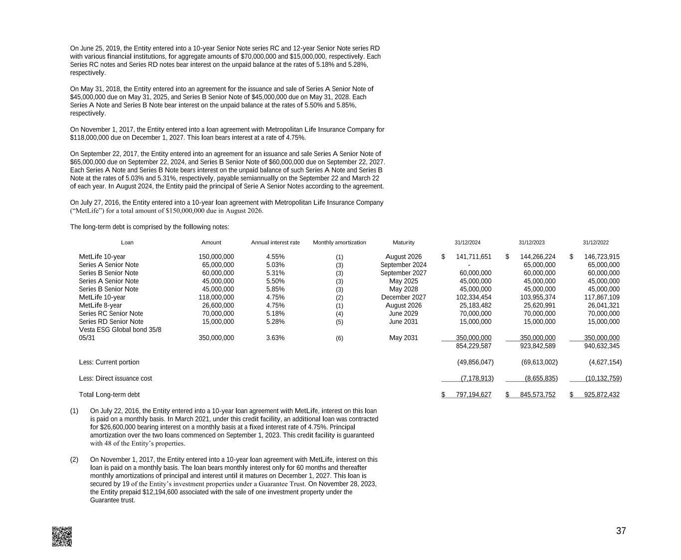 37 On June 25, 2019, the Entity entered into a 10-year Senior Note series RC and 12-year Senior Note series RD with various financial institutions, for aggregate amounts of $70,000,000 and $15,000,000, respectively. Each Series RC notes and Series RD notes bear interest on the unpaid balance at the rates of 5.18% and 5.28%, respectively. On May 31, 2018, the Entity entered into an agreement for the issuance and sale of Series A Senior Note of $45,000,000 due on May 31, 2025, and Series B Senior Note of $45,000,000 due on May 31, 2028. Each Series A Note and Series B Note bear interest on the unpaid balance at the rates of 5.50% and 5.85%, respectively. On November 1, 2017, the Entity entered into a loan agreement with Metropolitan Life Insurance Company for $118,000,000 due on December 1, 2027. This loan bears interest at a rate of 4.75%. On September 22, 2017, the Entity entered into an agreement for an issuance and sale Series A Senior Note of $65,000,000 due on September 22, 2024, and Series B Senior Note of $60,000,000 due on September 22, 2027. Each Series A Note and Series B Note bears interest on the unpaid balance of such Series A Note and Series B Note at the rates of 5.03% and 5.31%, respectively, payable semiannually on the September 22 and March 22 of each year. In August 2024, the Entity paid the principal of Serie A Senior Notes according to the agreement. On July 27, 2016, the Entity entered into a 10-year loan agreement with Metropolitan Life Insurance Company (“MetLife”) for a total amount of $150,000,000 due in August 2026. The long-term debt is comprised by the following notes: Loan Amount Annual interest rate Monthly amortization Maturity 31/12/2024 31/12/2023 31/12/2022 MetLife 10-year 150,000,000 4.55% (1) August 2026 $ 141,711,651 $ 144,266,224 $ 146,723,915 Series A Senior Note 65,000,000 5.03% (3) September 2024 - 65,000,000 65,000,000 Series B Senior Note 60,000,000 5.31% (3) September 2027 60,000,000 60,000,000 60,000,000 Series A Senior Note 45,000,000 5.50% (3) May 2025 45,000,000 45,000,000 45,000,000 Series B Senior Note 45,000,000 5.85% (3) May 2028 45,000,000 45,000,000 45,000,000 MetLife 10-year 118,000,000 4.75% (2) December 2027 102,334,454 103,955,374 117,867,109 MetLife 8-year 26,600,000 4.75% (1) August 2026 25,183,482 25,620,991 26,041,321 Series RC Senior Note 70,000,000 5.18% (4) June 2029 70,000,000 70,000,000 70,000,000 Series RD Senior Note 15,000,000 5.28% (5) June 2031 15,000,000 15,000,000 15,000,000 Vesta ESG Global bond 35/8 05/31 350,000,000 3.63% (6) May 2031 350,000,000 350,000,000 350,000,000 854,229,587 923,842,589 940,632,345 Less: Current portion (49,856,047) (69,613,002) (4,627,154) Less: Direct issuance cost (7,178,913) (8,655,835) (10,132,759) Total Long-term debt $ 797,194,627 $ 845,573,752 $ 925,872,432 (1) On July 22, 2016, the Entity entered into a 10-year loan agreement with MetLife, interest on this loan is paid on a monthly basis. In March 2021, under this credit facility, an additional loan was contracted for $26,600,000 bearing interest on a monthly basis at a fixed interest rate of 4.75%. Principal amortization over the two loans commenced on September 1, 2023. This credit facility is guaranteed with 48 of the Entity’s properties. (2) On November 1, 2017, the Entity entered into a 10-year loan agreement with MetLife, interest on this loan is paid on a monthly basis. The loan bears monthly interest only for 60 months and thereafter monthly amortizations of principal and interest until it matures on December 1, 2027. This loan is secured by 19 of the Entity’s investment properties under a Guarantee Trust. On November 28, 2023, the Entity prepaid $12,194,600 associated with the sale of one investment property under the Guarantee trust.
