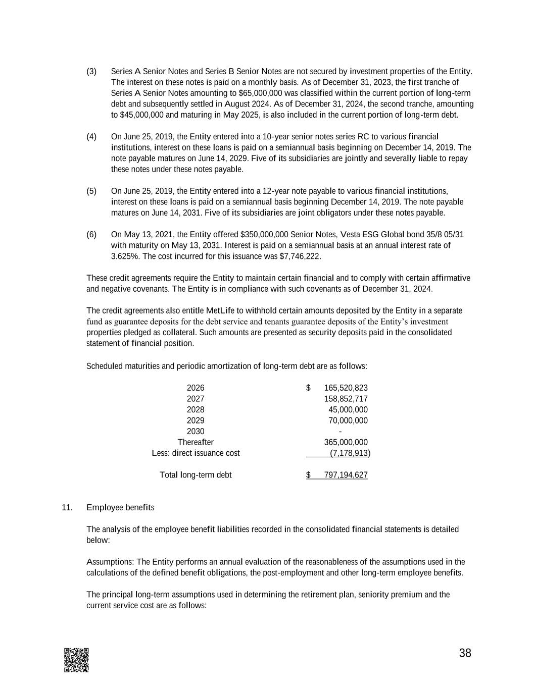 38 (3) Series A Senior Notes and Series B Senior Notes are not secured by investment properties of the Entity. The interest on these notes is paid on a monthly basis. As of December 31, 2023, the first tranche of Series A Senior Notes amounting to $65,000,000 was classified within the current portion of long-term debt and subsequently settled in August 2024. As of December 31, 2024, the second tranche, amounting to $45,000,000 and maturing in May 2025, is also included in the current portion of long-term debt. (4) On June 25, 2019, the Entity entered into a 10-year senior notes series RC to various financial institutions, interest on these loans is paid on a semiannual basis beginning on December 14, 2019. The note payable matures on June 14, 2029. Five of its subsidiaries are jointly and severally liable to repay these notes under these notes payable. (5) On June 25, 2019, the Entity entered into a 12-year note payable to various financial institutions, interest on these loans is paid on a semiannual basis beginning December 14, 2019. The note payable matures on June 14, 2031. Five of its subsidiaries are joint obligators under these notes payable. (6) On May 13, 2021, the Entity offered $350,000,000 Senior Notes, Vesta ESG Global bond 35/8 05/31 with maturity on May 13, 2031. Interest is paid on a semiannual basis at an annual interest rate of 3.625%. The cost incurred for this issuance was $7,746,222. These credit agreements require the Entity to maintain certain financial and to comply with certain affirmative and negative covenants. The Entity is in compliance with such covenants as of December 31, 2024. The credit agreements also entitle MetLife to withhold certain amounts deposited by the Entity in a separate fund as guarantee deposits for the debt service and tenants guarantee deposits of the Entity’s investment properties pledged as collateral. Such amounts are presented as security deposits paid in the consolidated statement of financial position. Scheduled maturities and periodic amortization of long-term debt are as follows: 2026 $ 165,520,823 2027 158,852,717 2028 45,000,000 2029 70,000,000 2030 - Thereafter 365,000,000 Less: direct issuance cost (7,178,913) Total long-term debt $ 797,194,627 11. Employee benefits The analysis of the employee benefit liabilities recorded in the consolidated financial statements is detailed below: Assumptions: The Entity performs an annual evaluation of the reasonableness of the assumptions used in the calculations of the defined benefit obligations, the post-employment and other long-term employee benefits. The principal long-term assumptions used in determining the retirement plan, seniority premium and the current service cost are as follows: